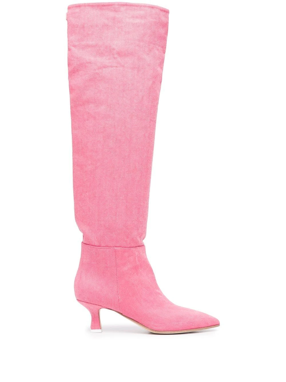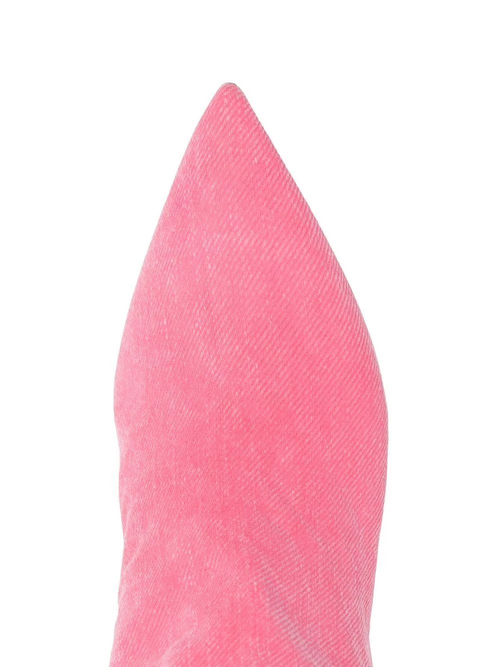 Rose fluorescent, cuir de veau, logo embossé sur le côté, bout pointu, fermeture zippée sur les côtés, semelle intérieure griffée, longueur maxi.