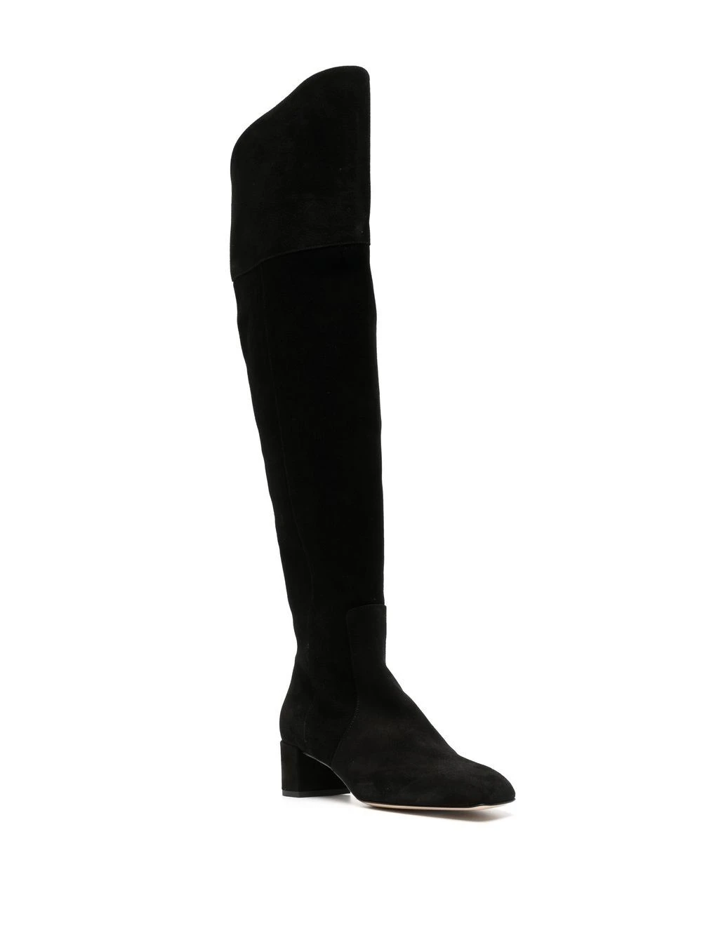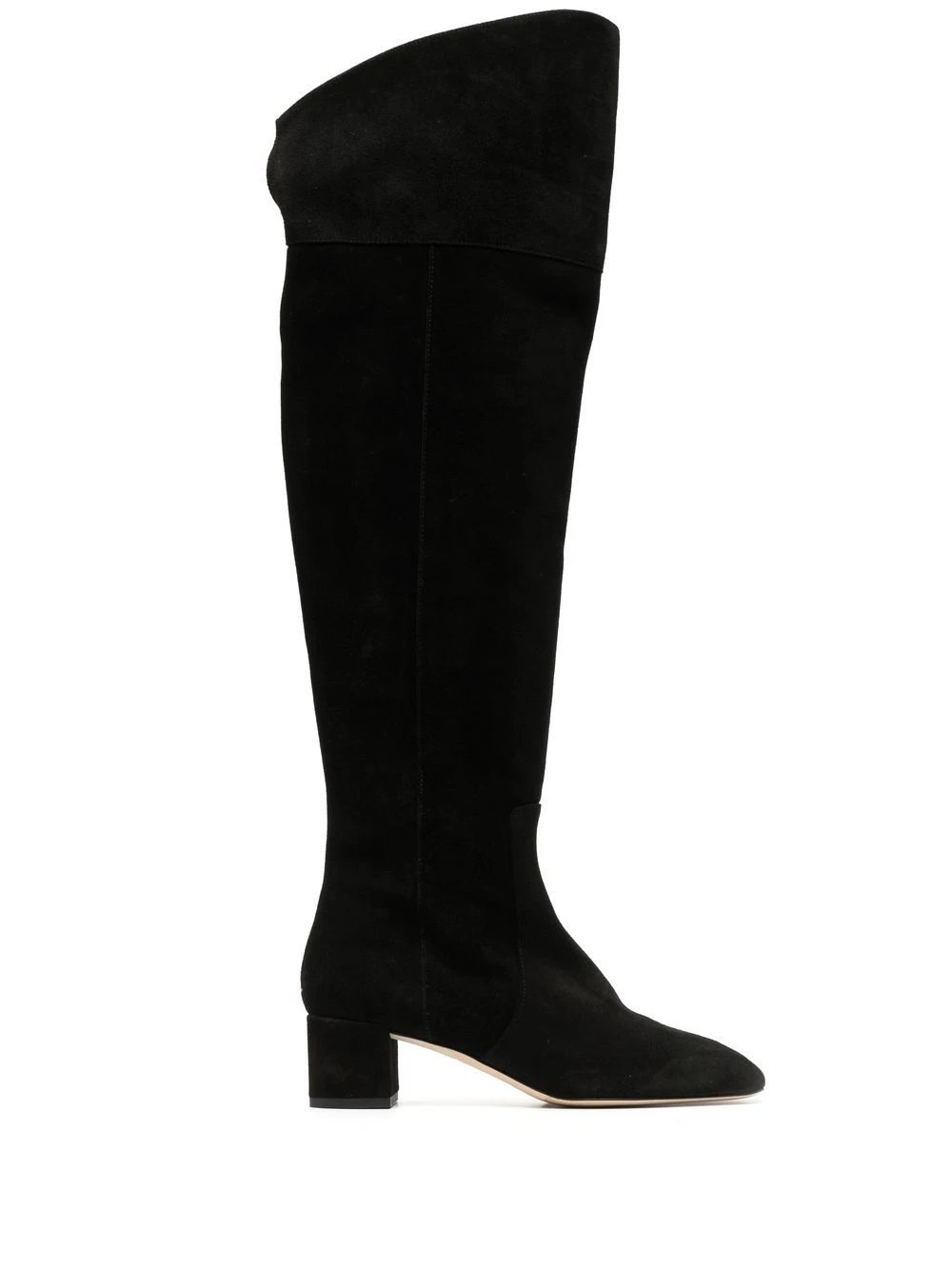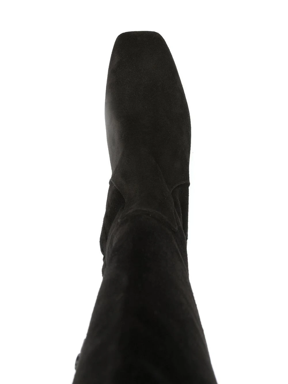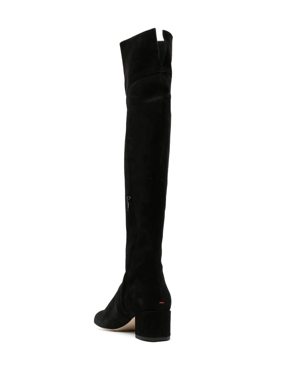 Noir, daim, bout carré, fermeture zippée sur le côté, talon mi-haut épais, coupe courte, fente à l’arrière, design à enfiler.