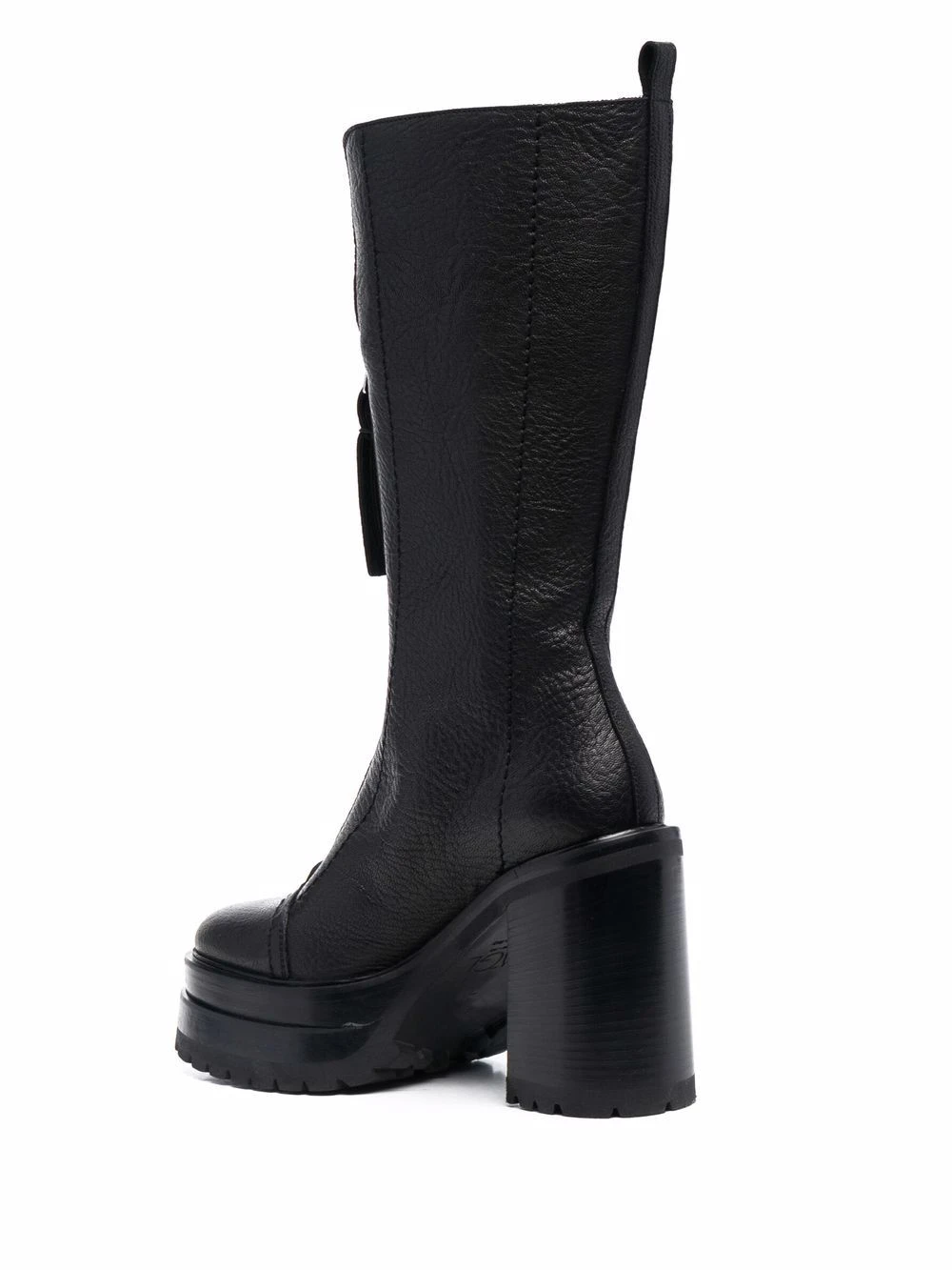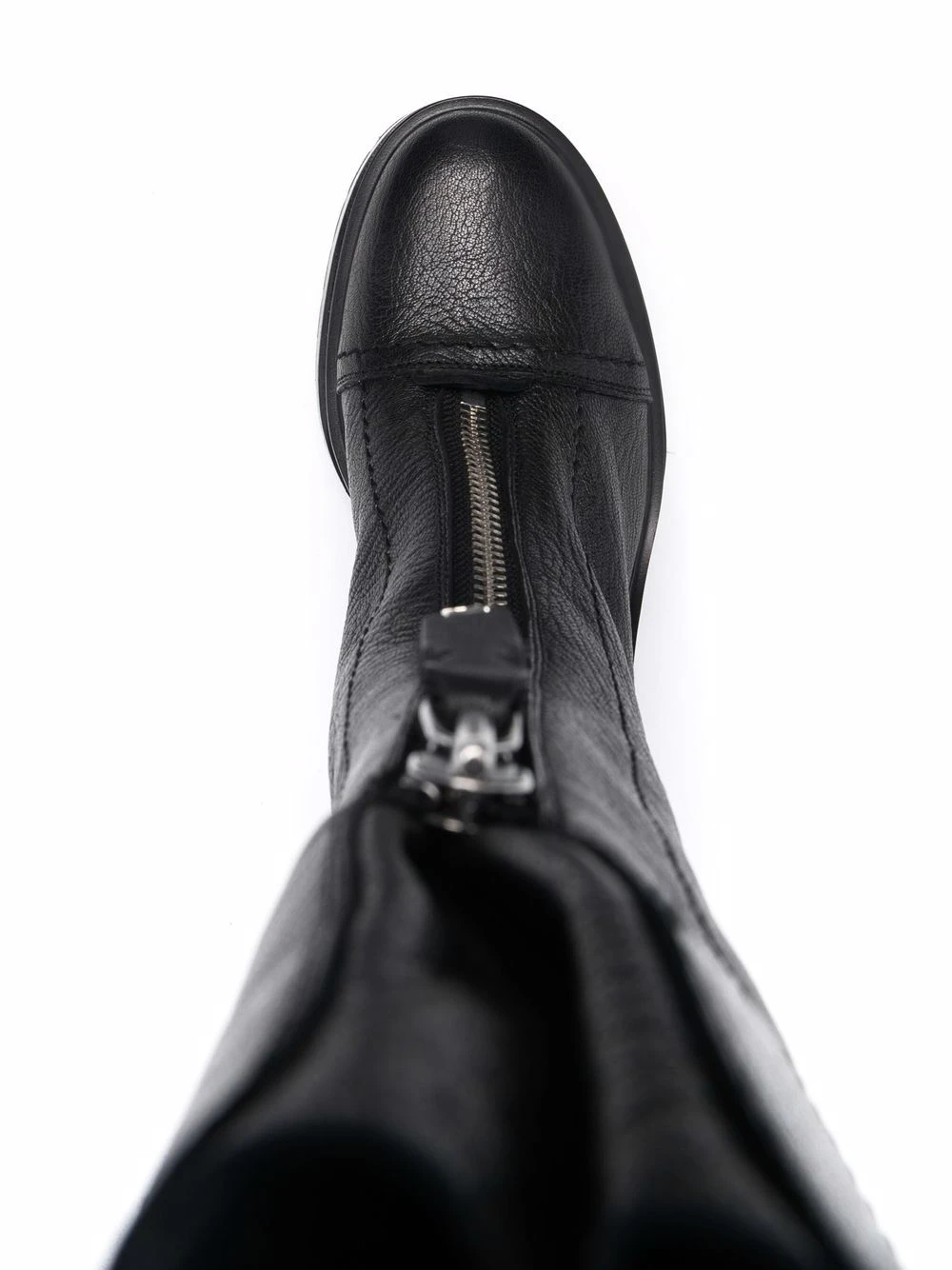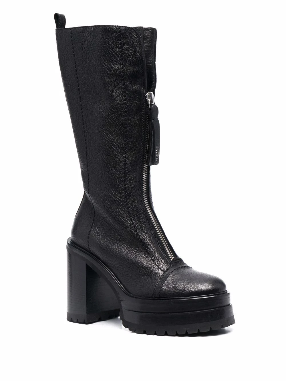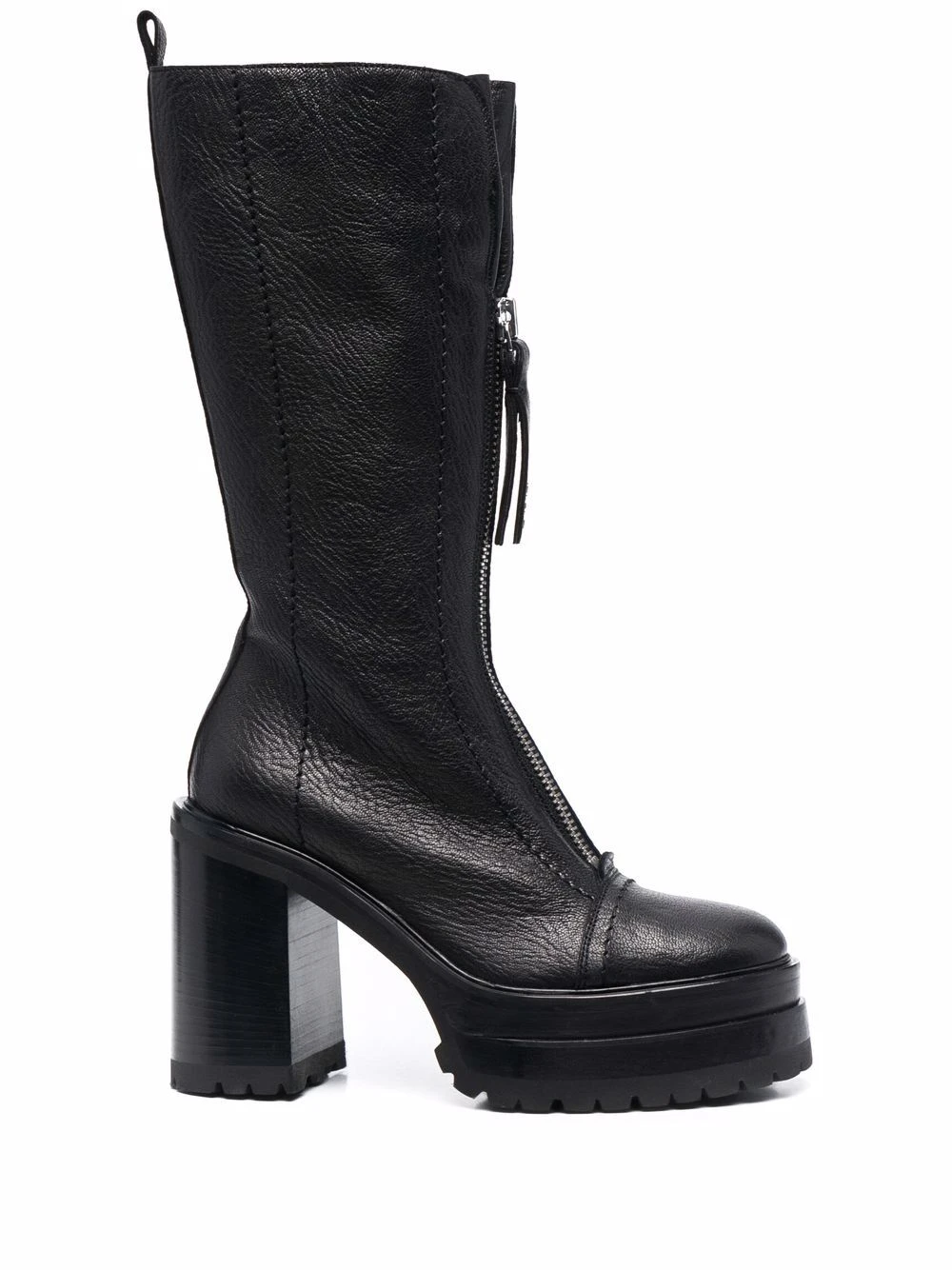 Fermeture zippée devant, semelle à plateforme, languette d’enfilage au talon, bout rond, talon haut épais, semelle en cuir. Couleur : noir. Matière : cuir de veau.