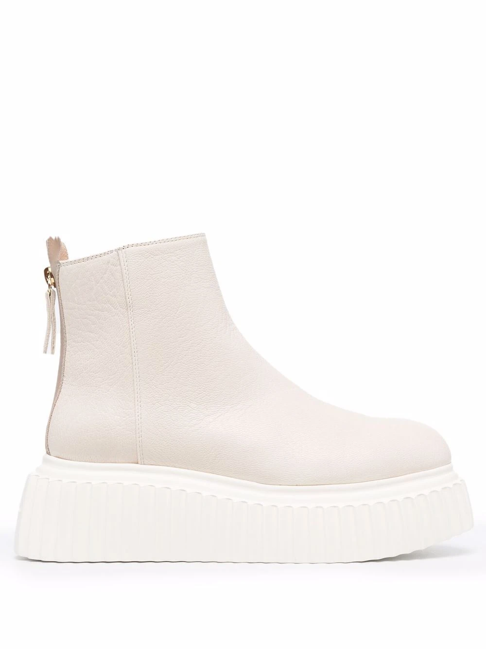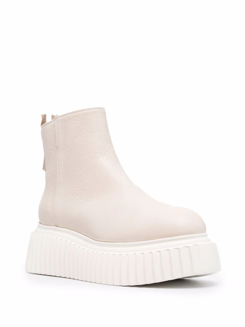 Fermeture zippée à l’arrière, hauteur cheville, bout rond, semelle crantée en caoutchouc, semelle à plateforme. Matière : cuir.