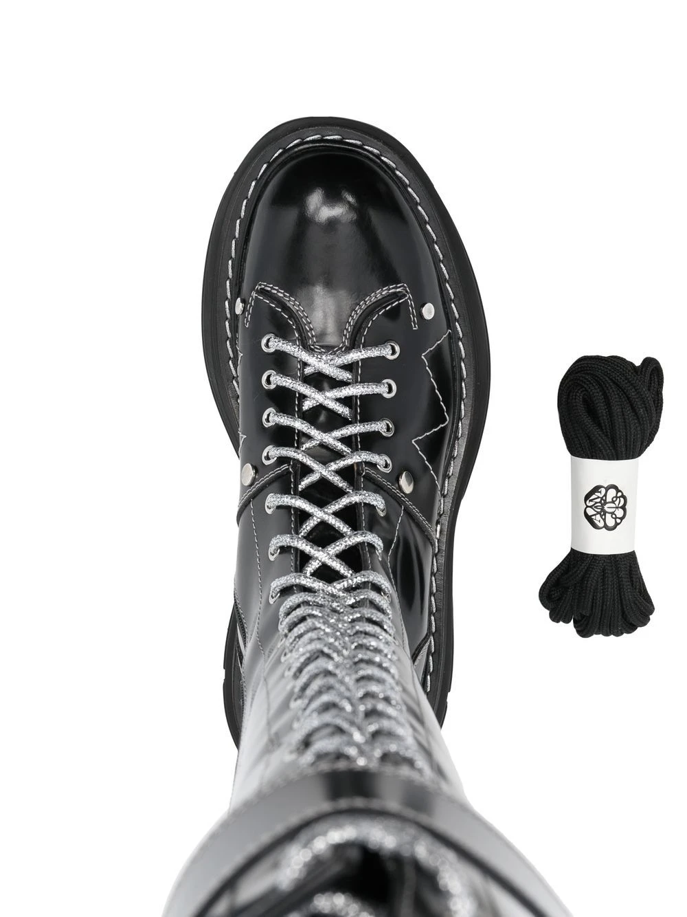 Noir, argenté, cuir de veau, cuir verni, longueur mollet, lacets interchangeables, tissage métallisé, fermeture à boucles sur les côtés, fermeture zippée sur les côtés, fermeture à lacer sur le devant, bout rond, semelle crantée en caoutchouc.