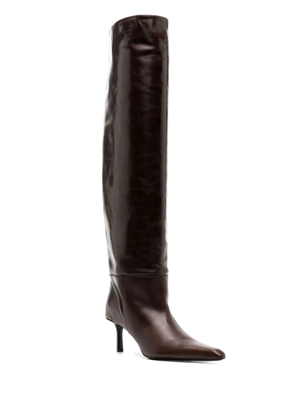 Marron, cuir, bout pointu, hauteur genou, petit talon.