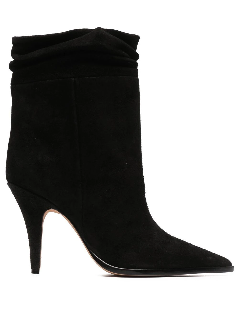 Noir, veau velours, cuir de veau, détails de fronces, bout pointu, semelle intérieure griffée, à enfiler.