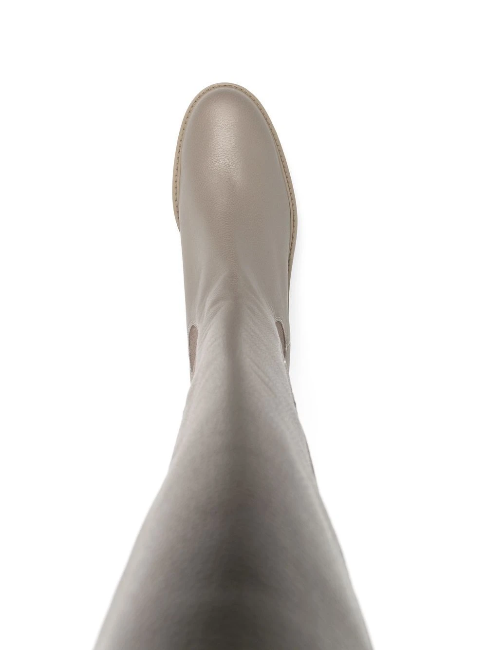 Gris, cuir de veau, languette d’enfilage au talon, bout en amande, empiècements élastiqués sur les côtés, hauteur genou, petit talon épais.