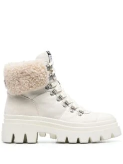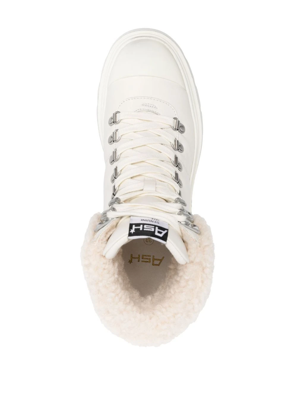 Blanc cassé, cuir de veau, finitions en fourrure artificielle, languette à patch logo, logo embossé au dos, fermeture à lacer sur le devant, semelle épaisse crantée en caoutchouc.