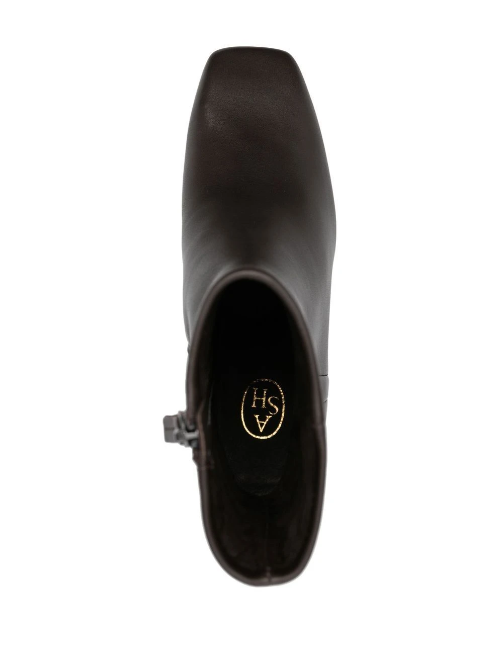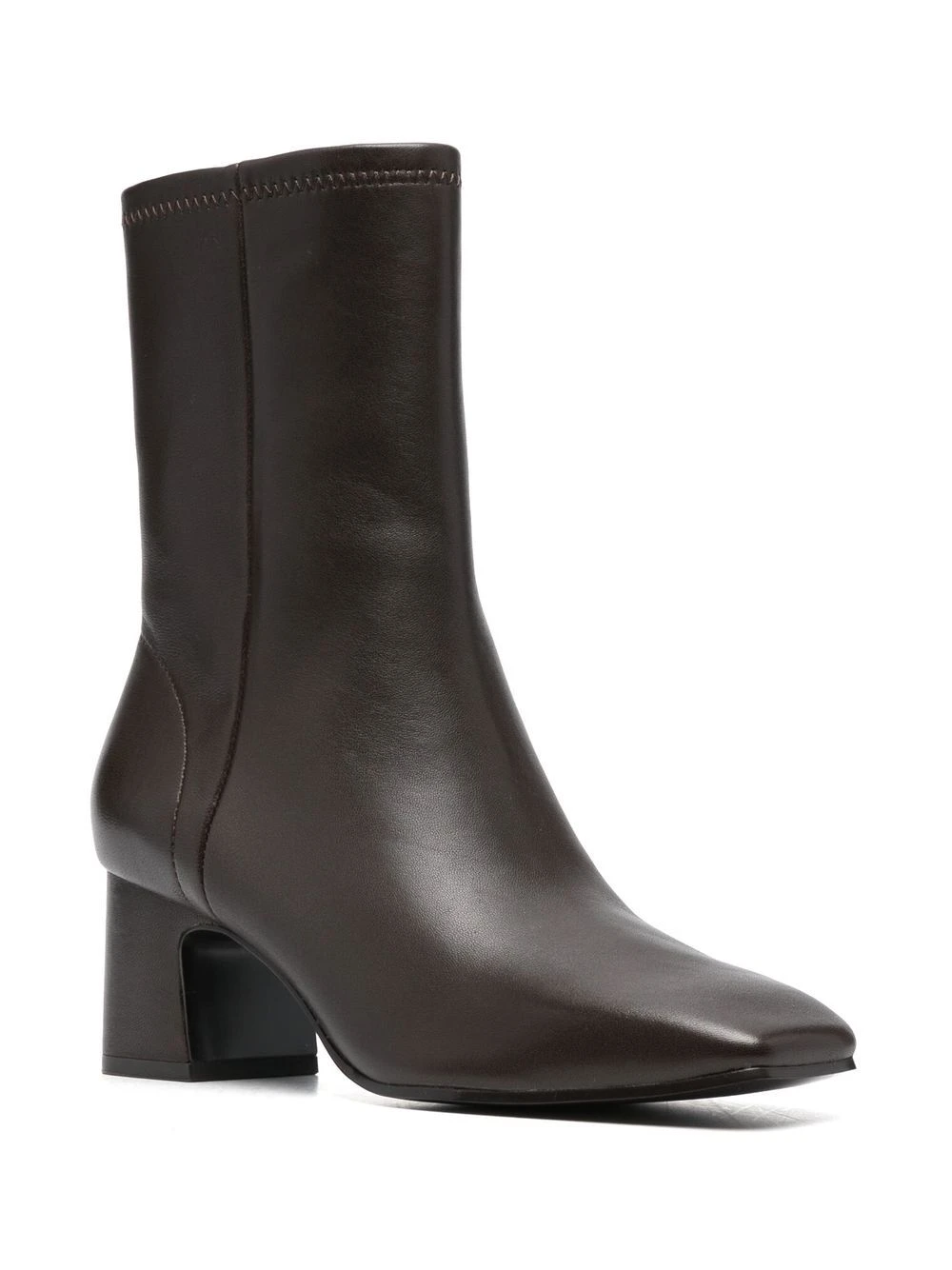 Marron, cuir de veau, bout carré, fermeture zippée sur le côté, talon mi-haut épais.