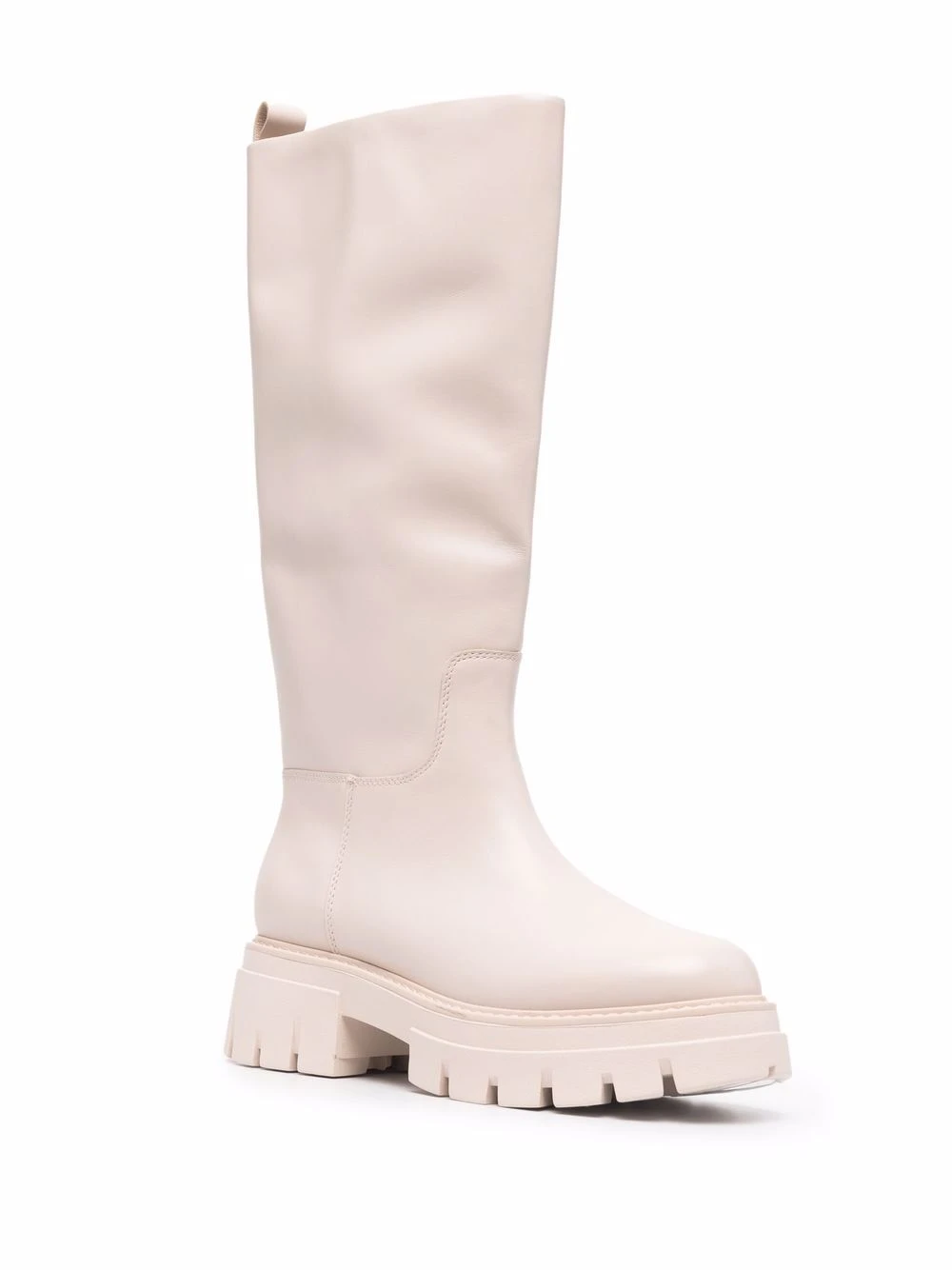 Coutures ton sur ton, bout rond, fermeture zippée sur le côté, longueur mollet, semelle intérieure à logo, petit talon nervuré, semelle crantée en caoutchouc. Matière : cuir.