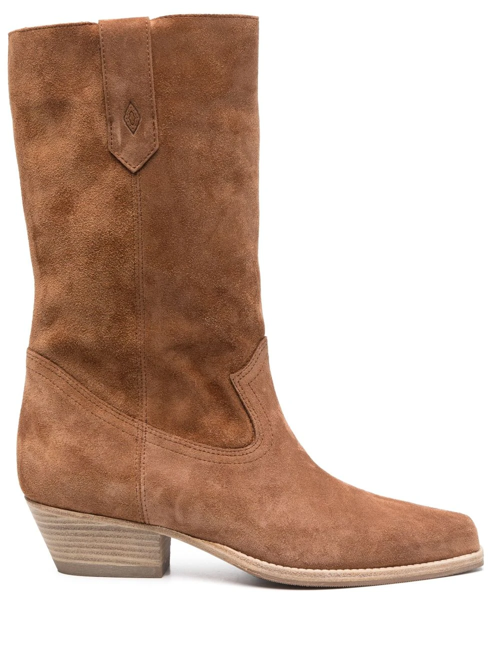Taupe, cuir de veau, veau velours, logo embossé sur le côté, bout pointu, à enfiler, petit talon épais.