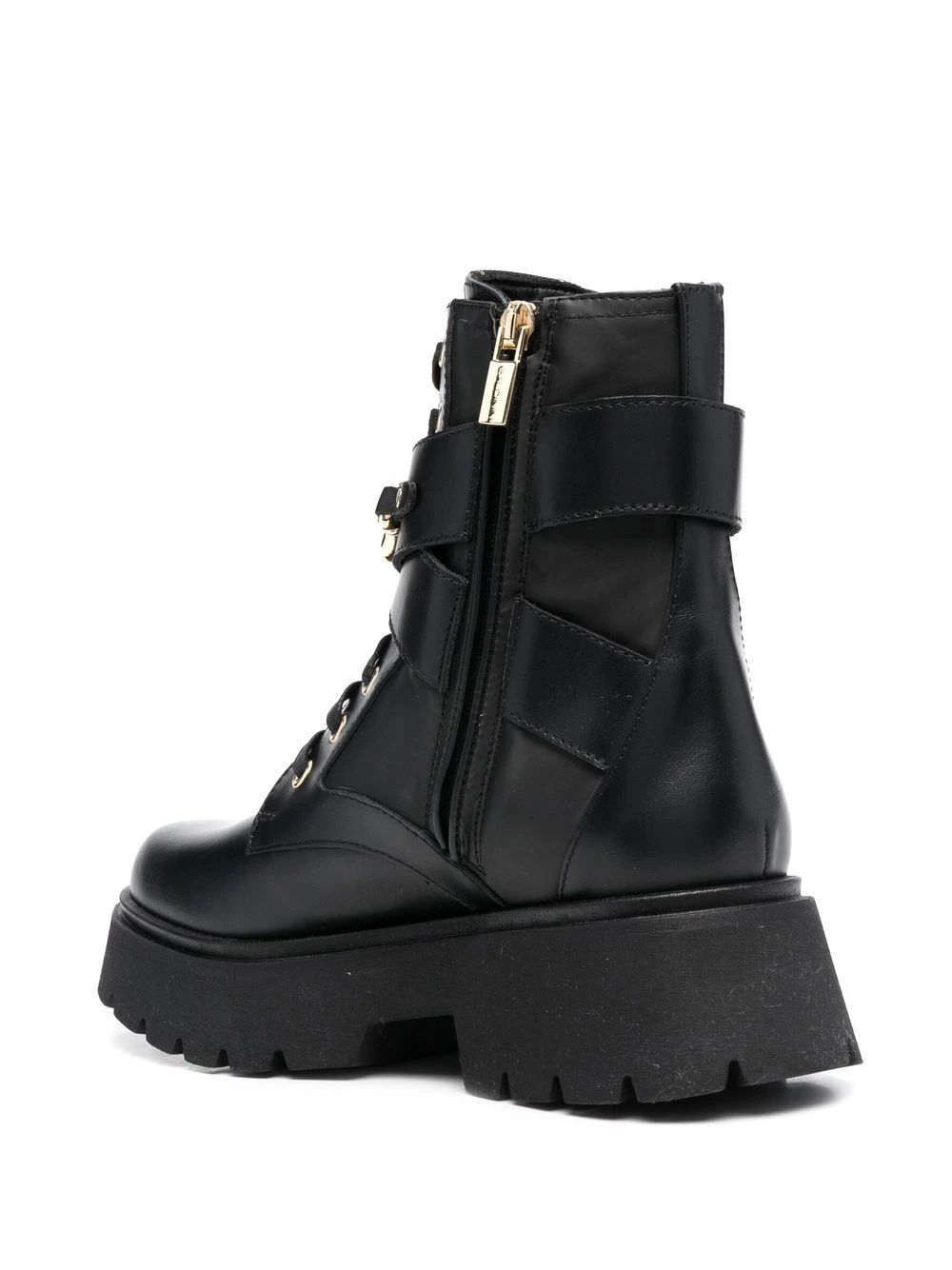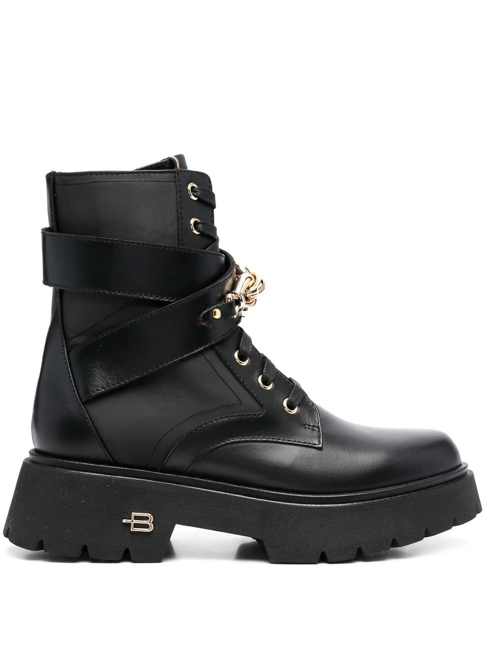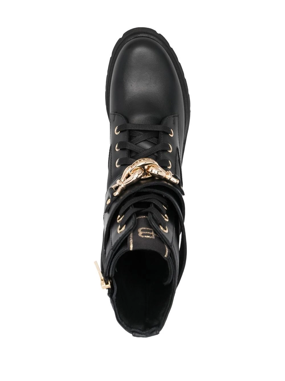 Noir, cuir de veau, plaque logo dorée, hauteur cheville, fermeture à lacer sur le devant, bout rond, petit talon épais.