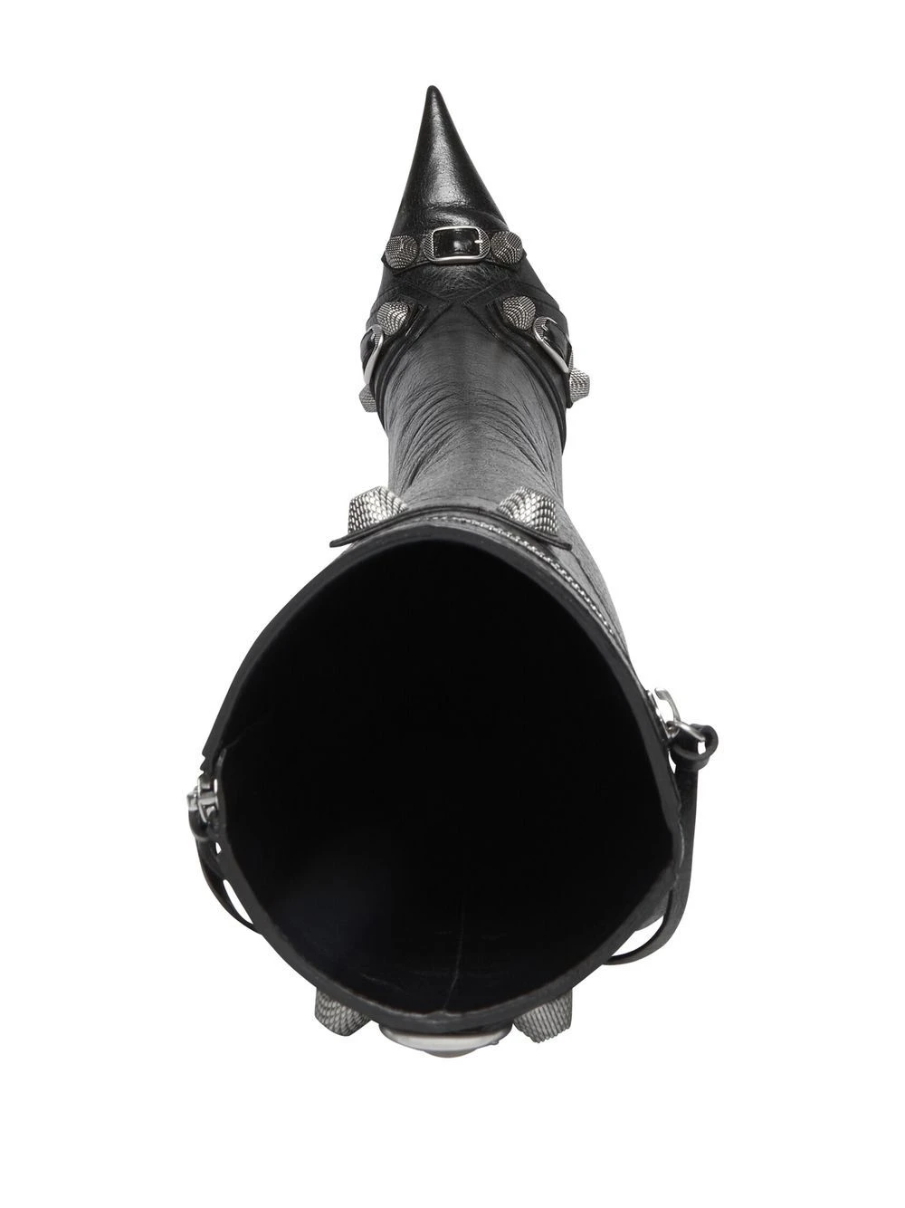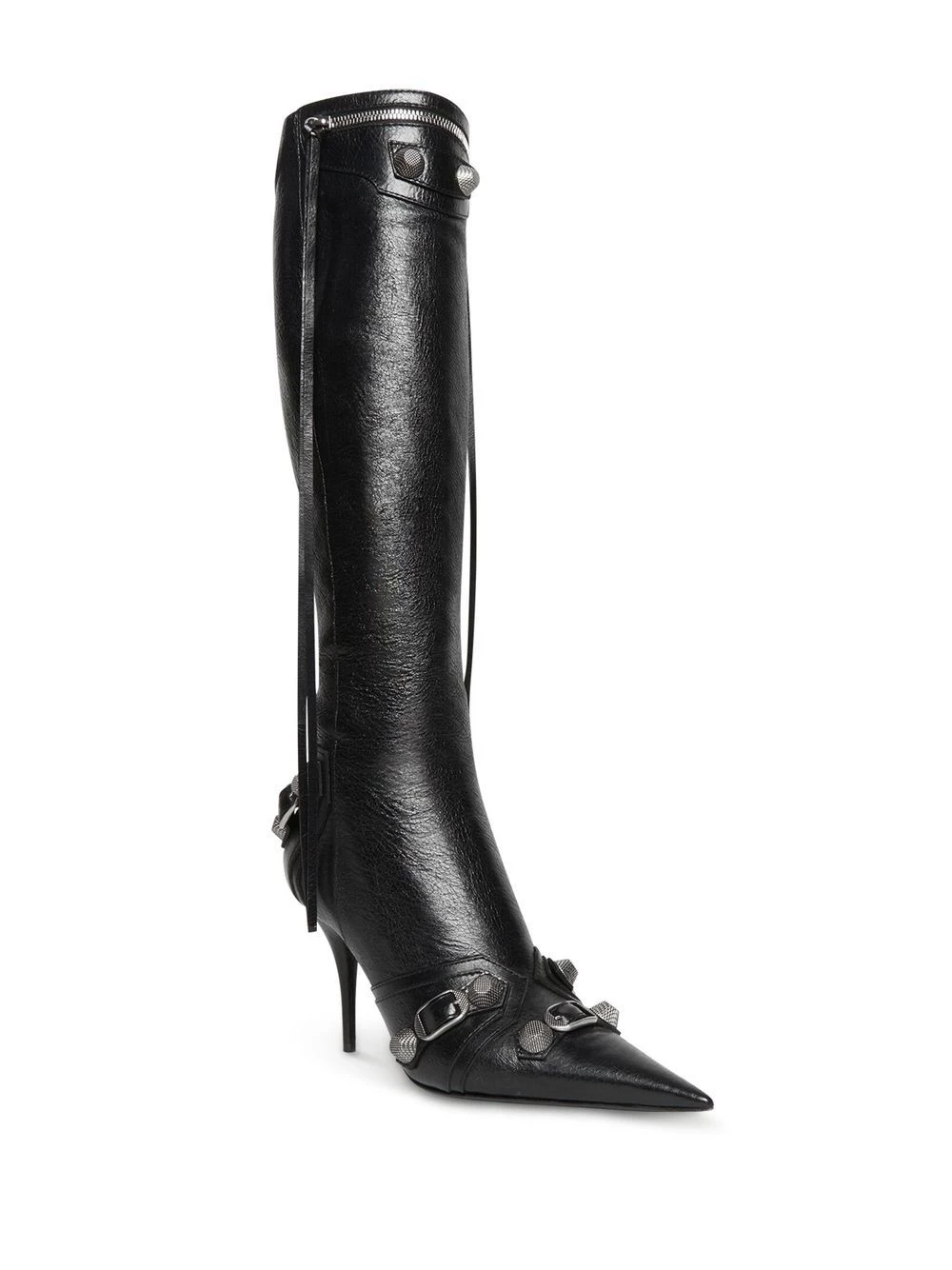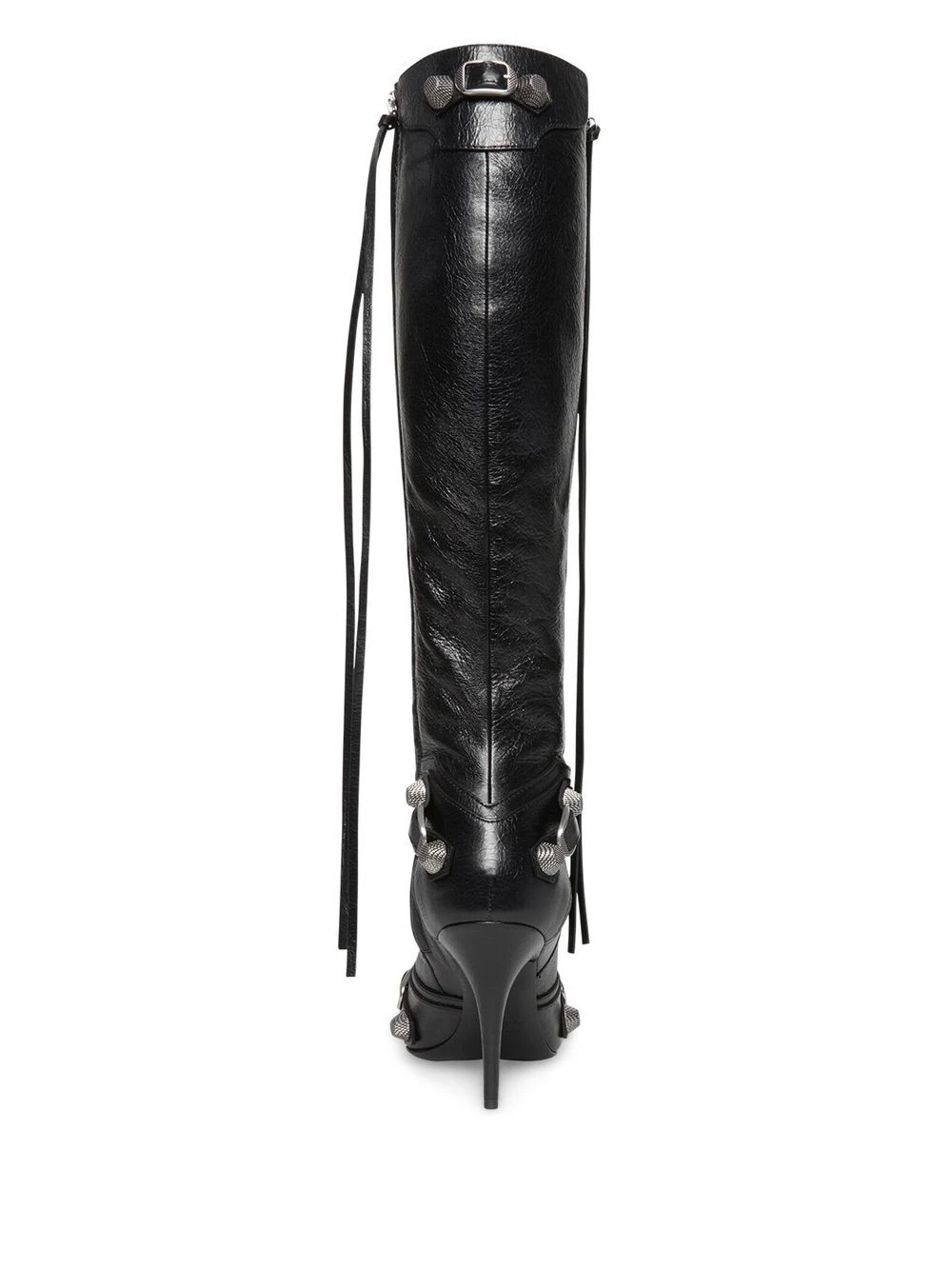Noir, peau d’agneau, bout pointu, talon aiguille haut, finitions à ton palladium, détails de clous, finition à franges, fermeture zippée sur le côté.
