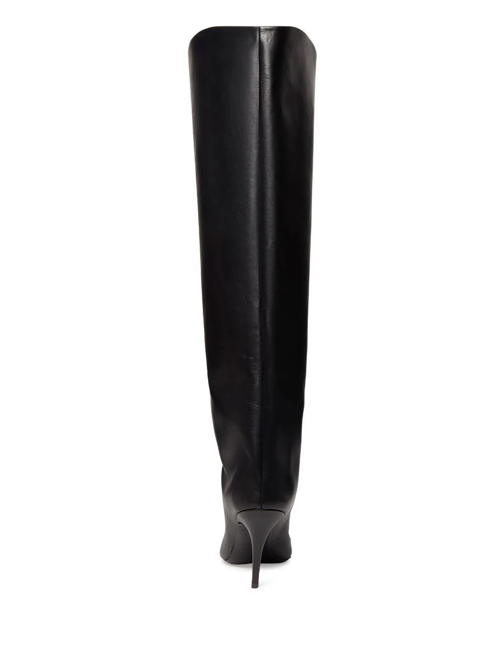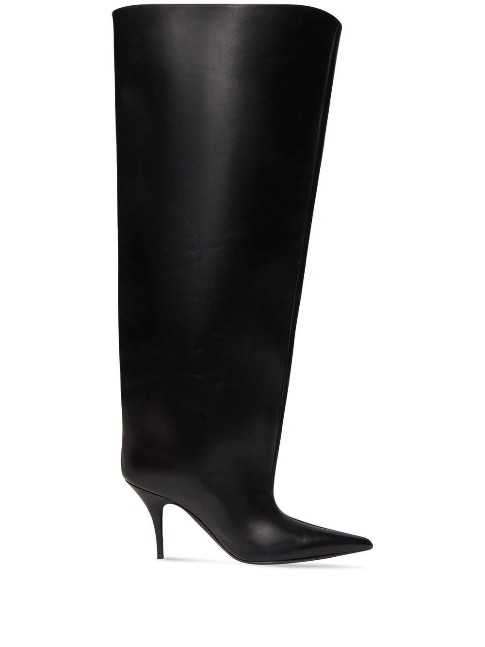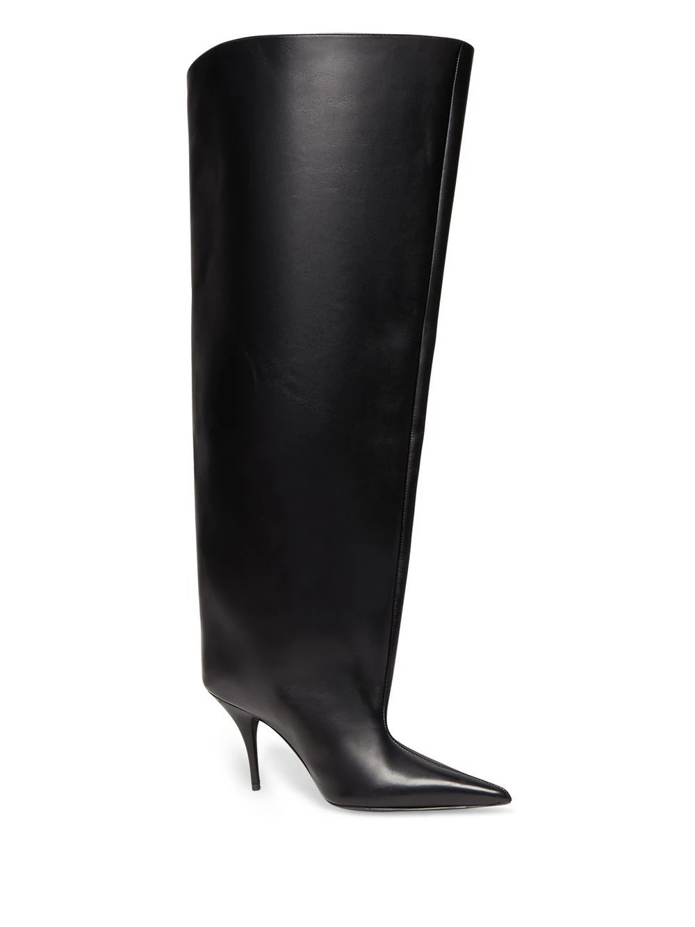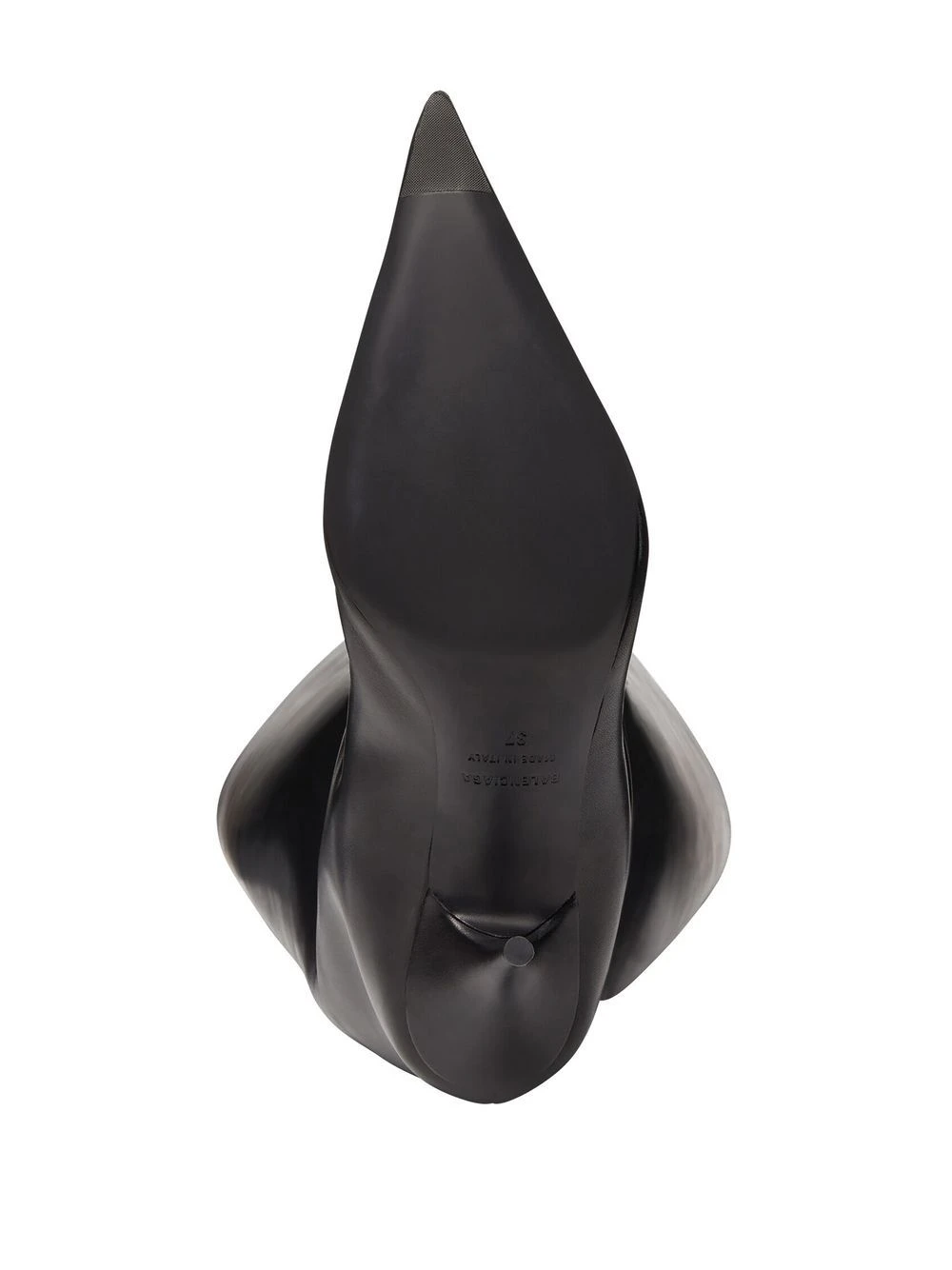 Noir, cuir de veau, bout pointu, style large, talon haut biseauté.