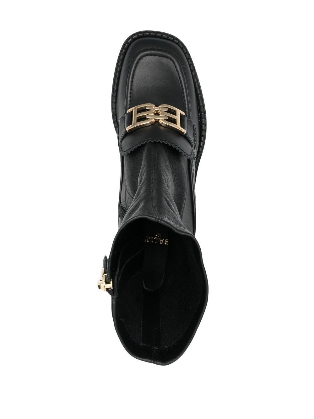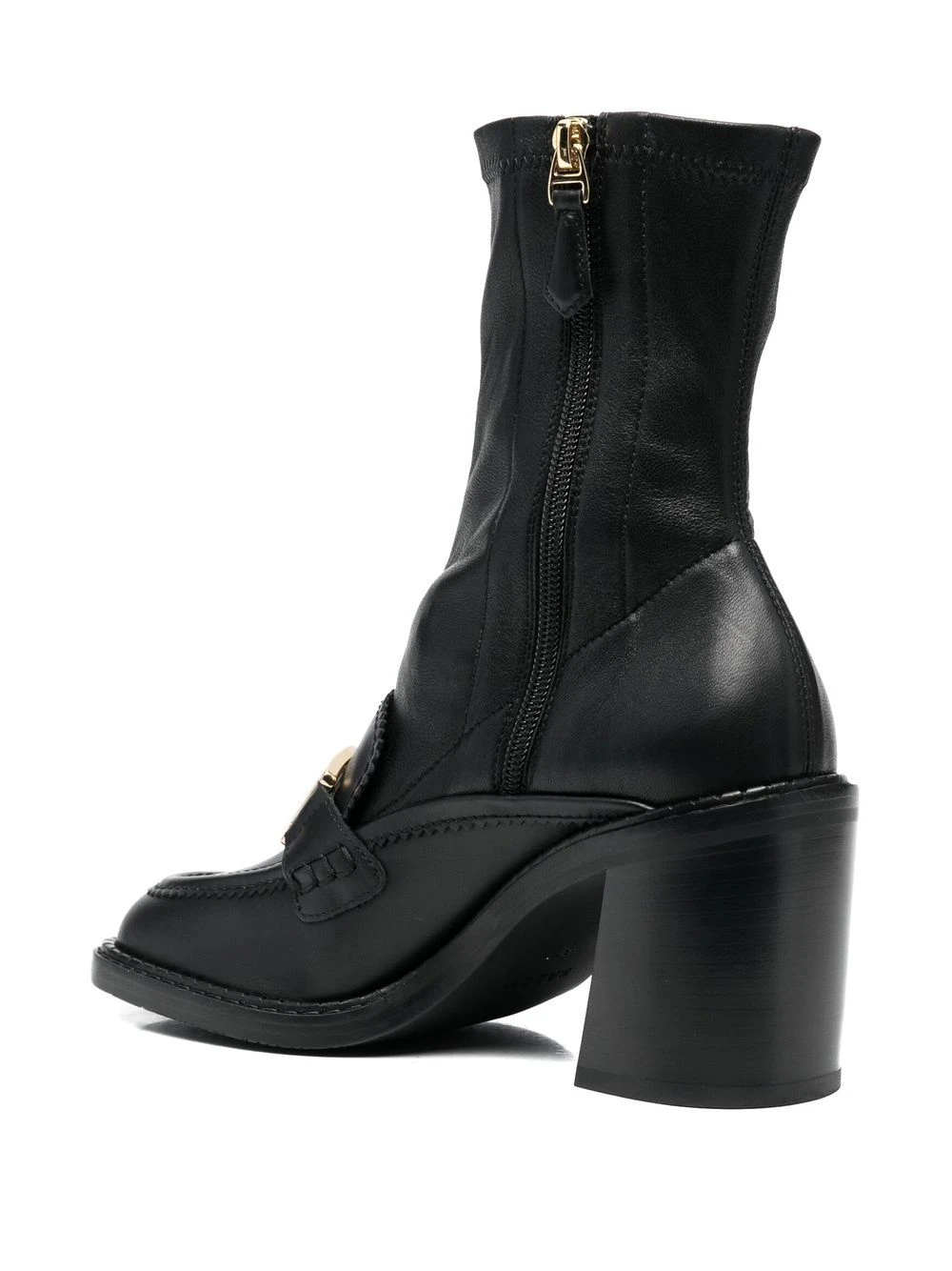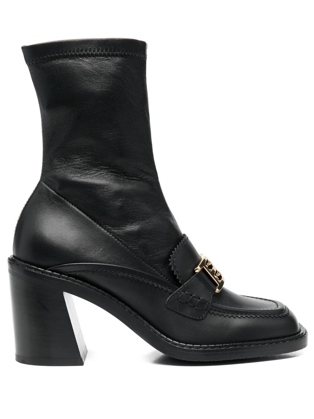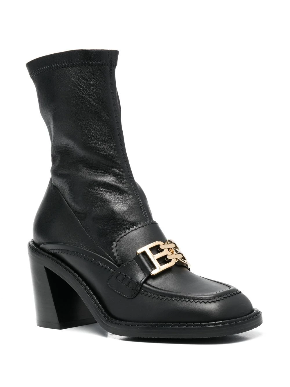 Noir de jais, cuir de veau, détail de boucle décorative, bout rond, talon mi-haut épais, design à enfiler.