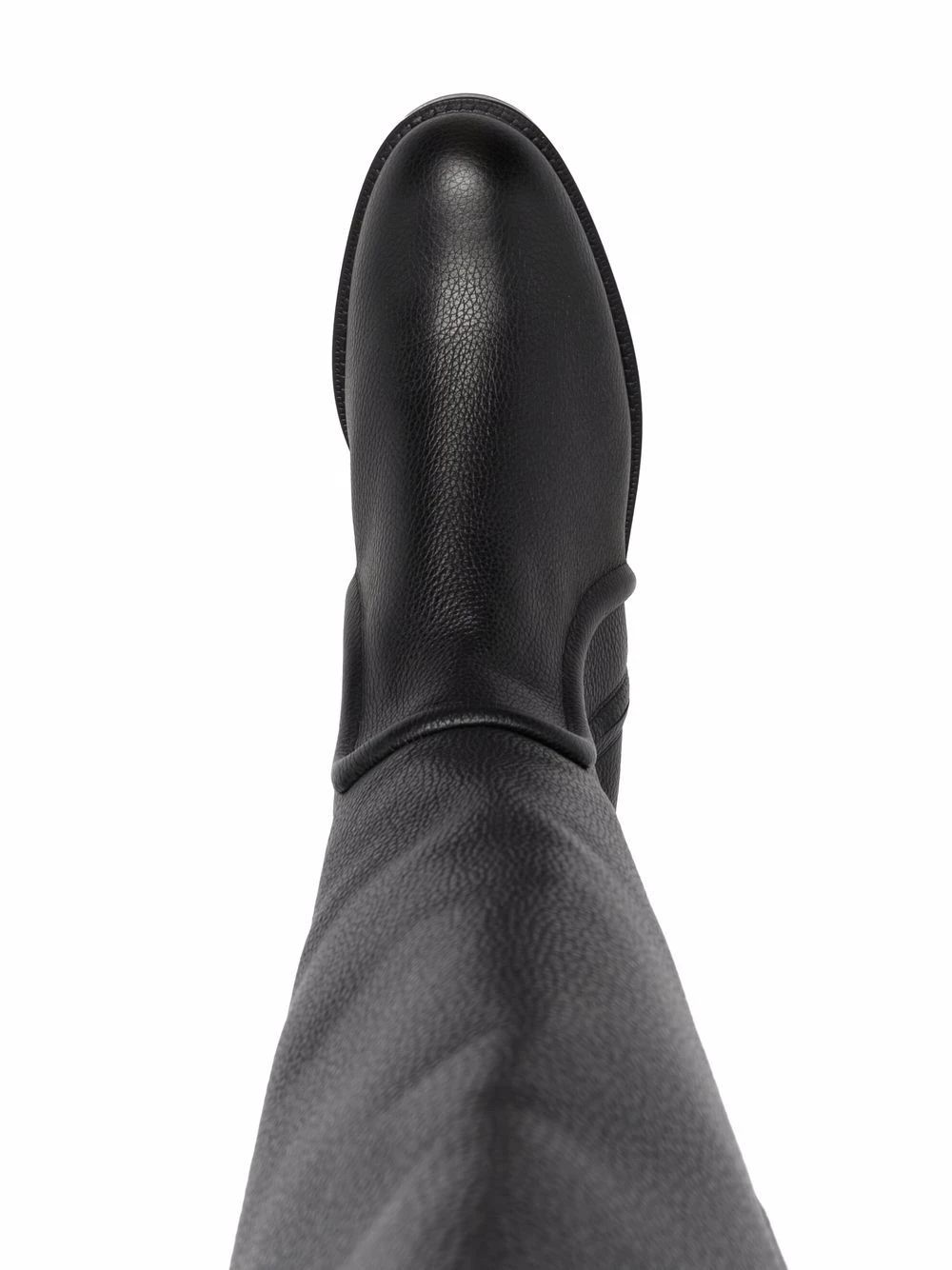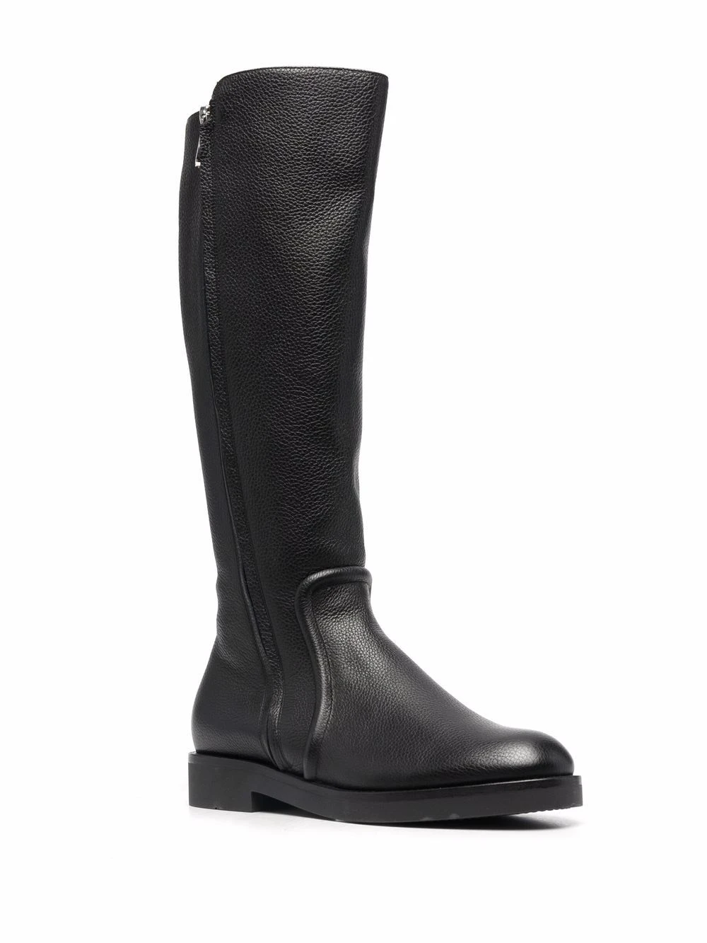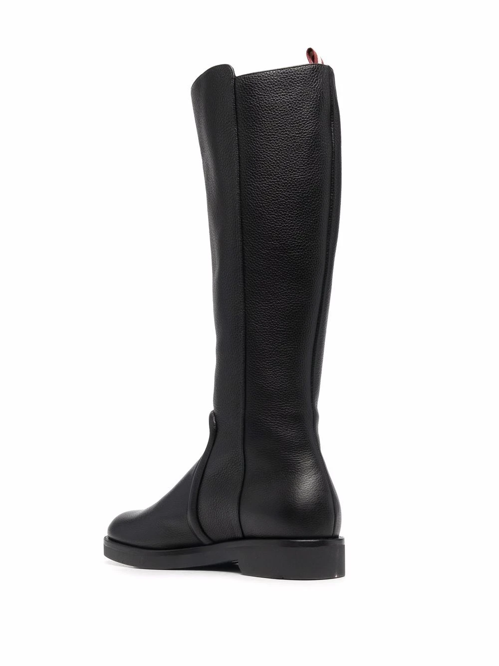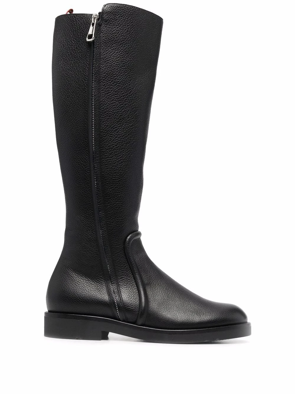 Texture grainée, bout rond, fermeture zippée sur le côté, hauteur genou, semelle intérieure à logo, petit talon épais. Couleur : noir. Matière : cuir.