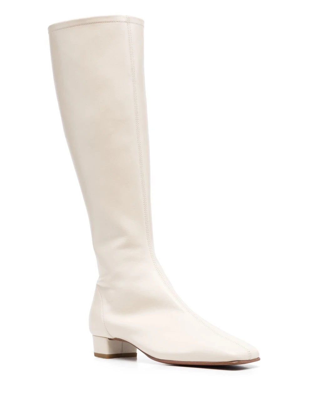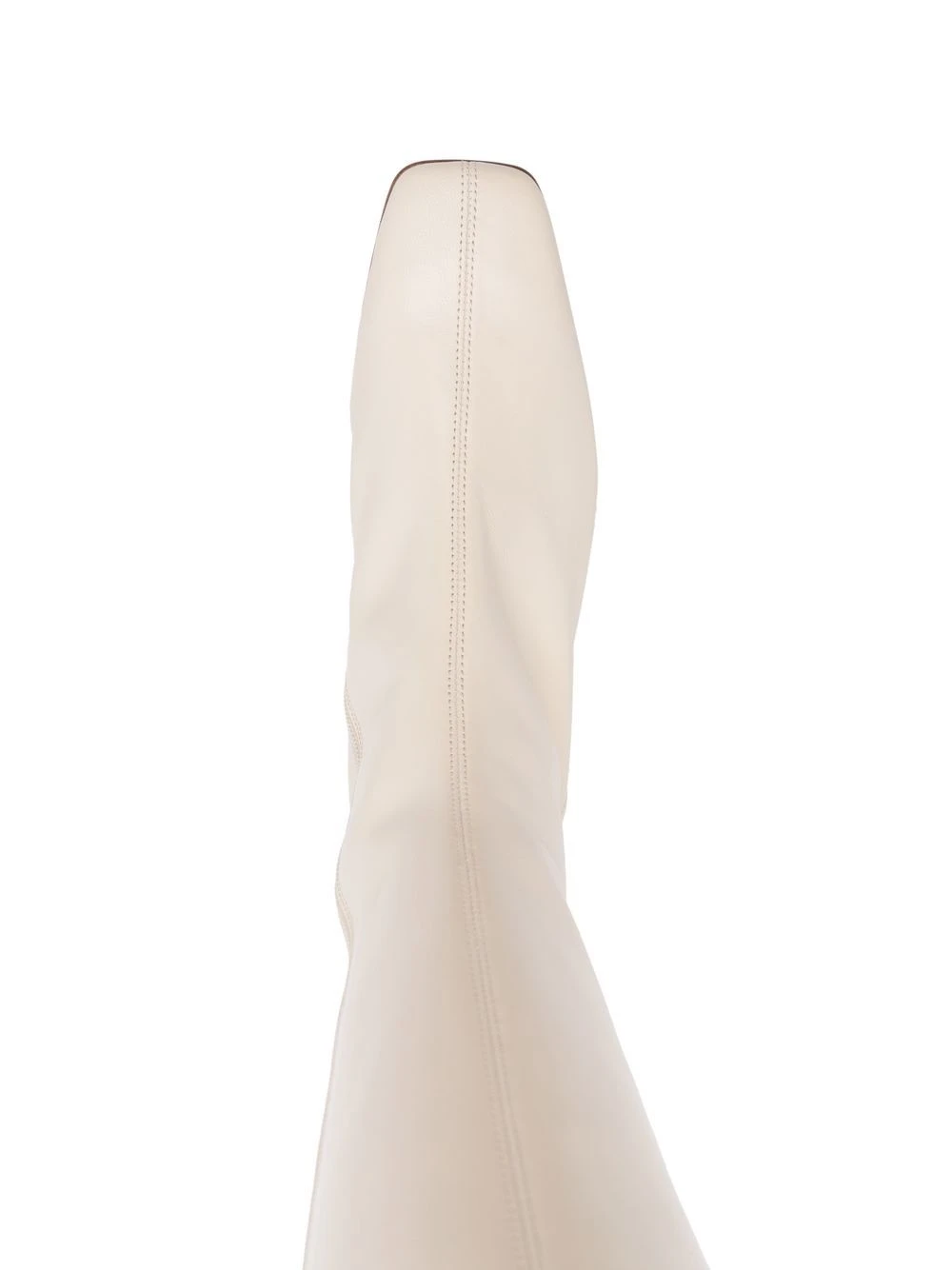 Blanc cassé, cuir de veau, bout carré, fermeture zippée sur le côté, semelle intérieure à logo, petit talon épais.