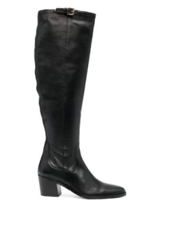 Noir, cuir de veau, bout en amande, fermeture zippée sur le côté, hauteur genou, petit talon épais.