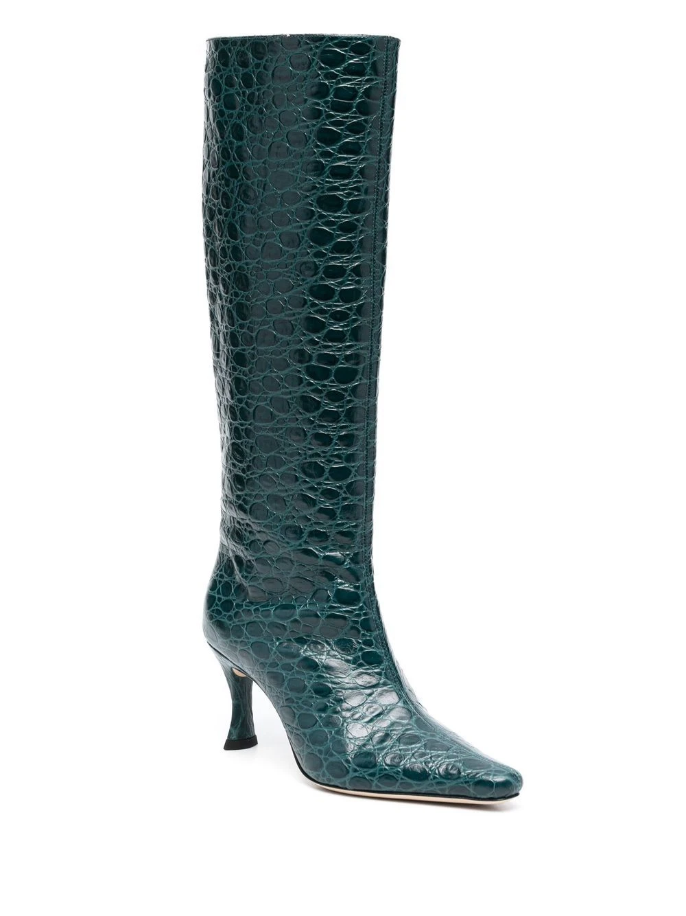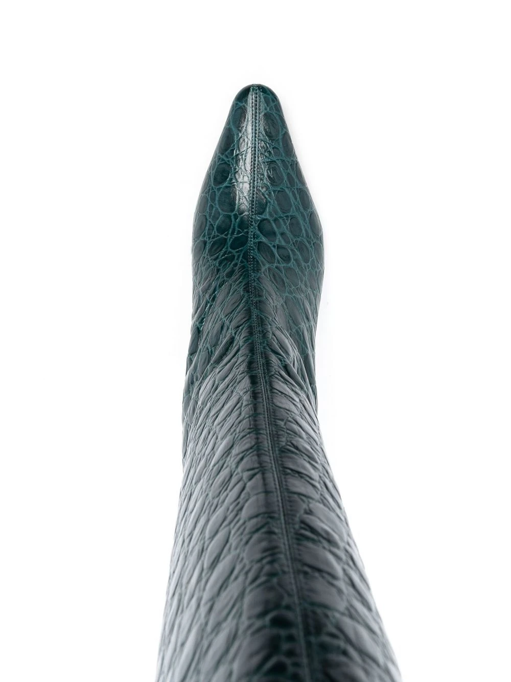 Vert sapin, cuir de veau, effet peau de crocodile, bout pointu, hauteur genou, talon haut.