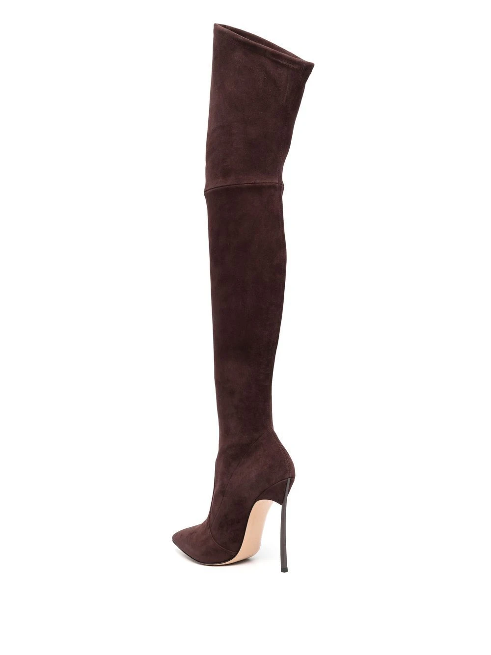 Carmin, cuir, hauteur genou, bout pointu, talon haut.