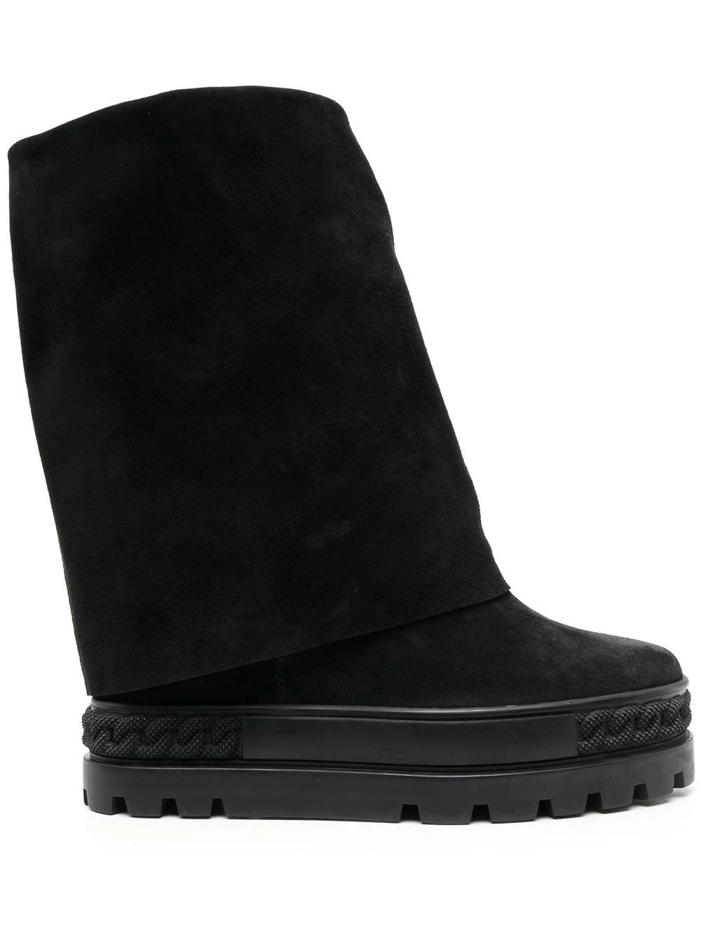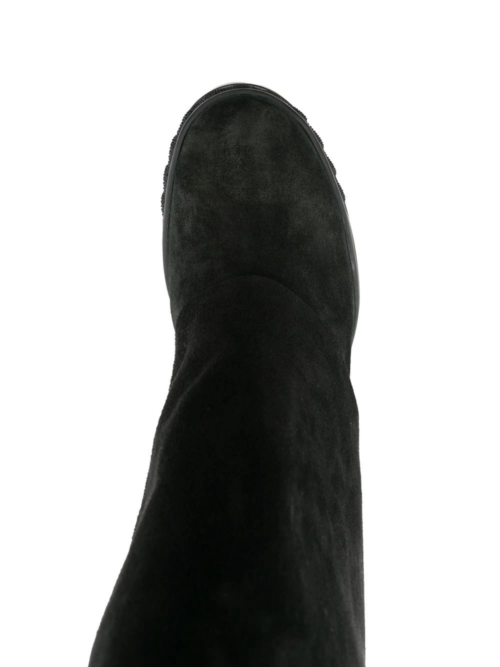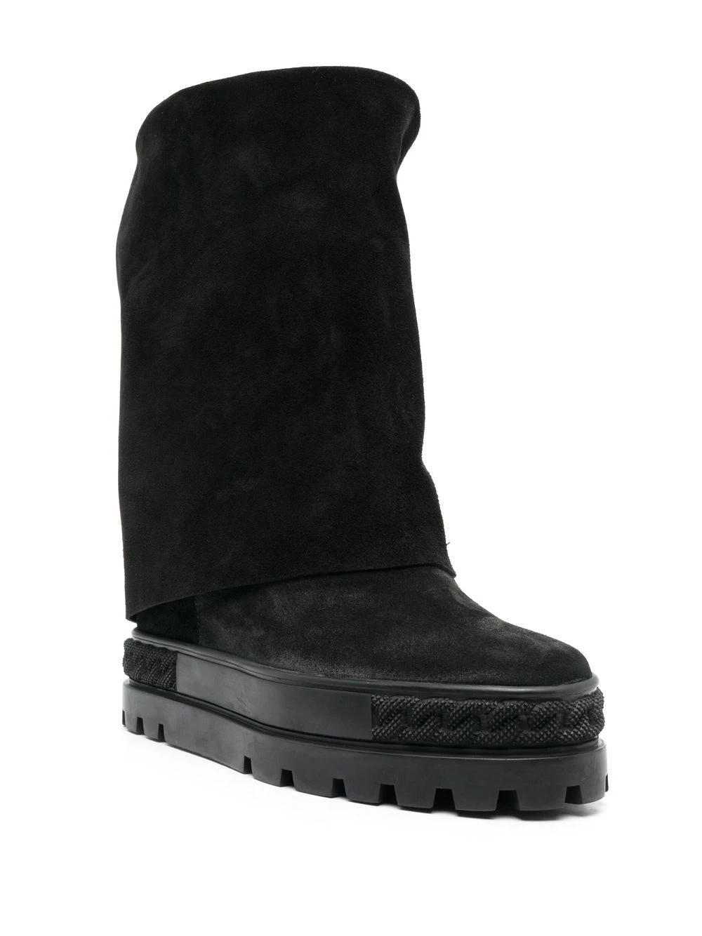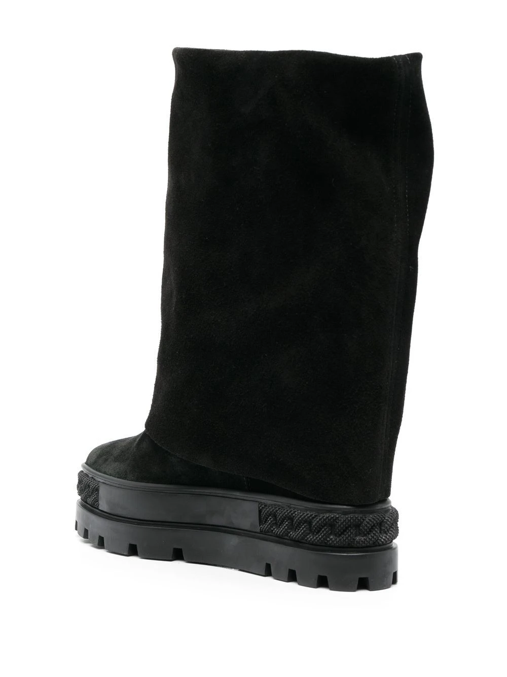 Noir, veau velours, cuir de veau, design à empiècements, design à enfiler, longueur midi, bout rond, semelle intérieure griffée, semelle à plateforme.