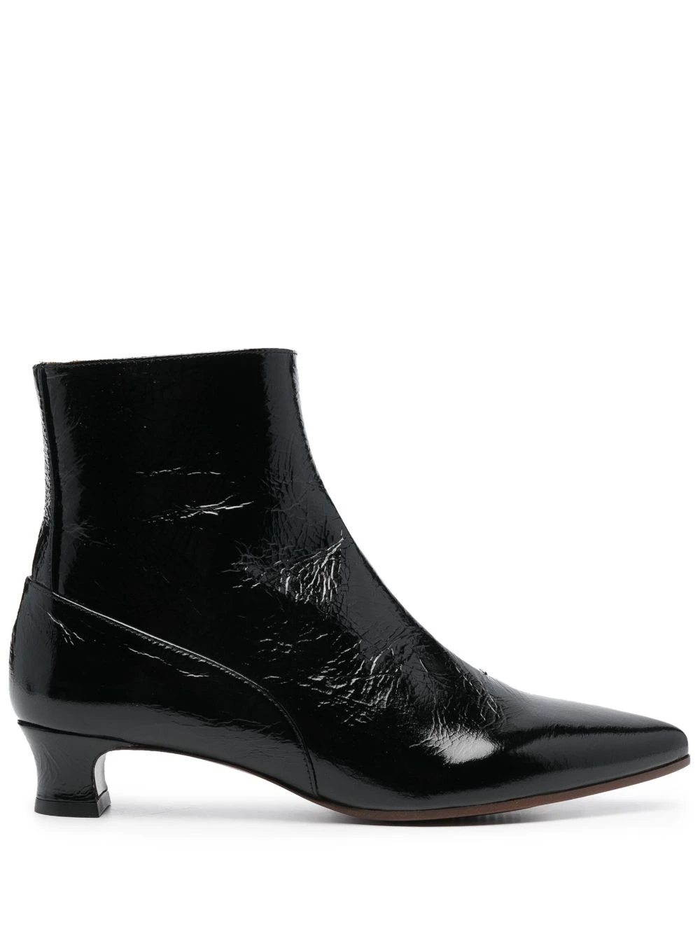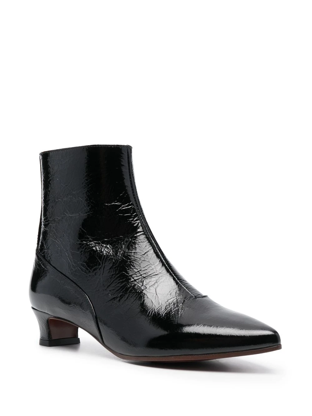 Noir, cuir de veau, fini verni, bout pointu, fermeture zippée sur le côté, semelle intérieure griffée, petit talon, semelle extérieure en cuir, semelle en caoutchouc.