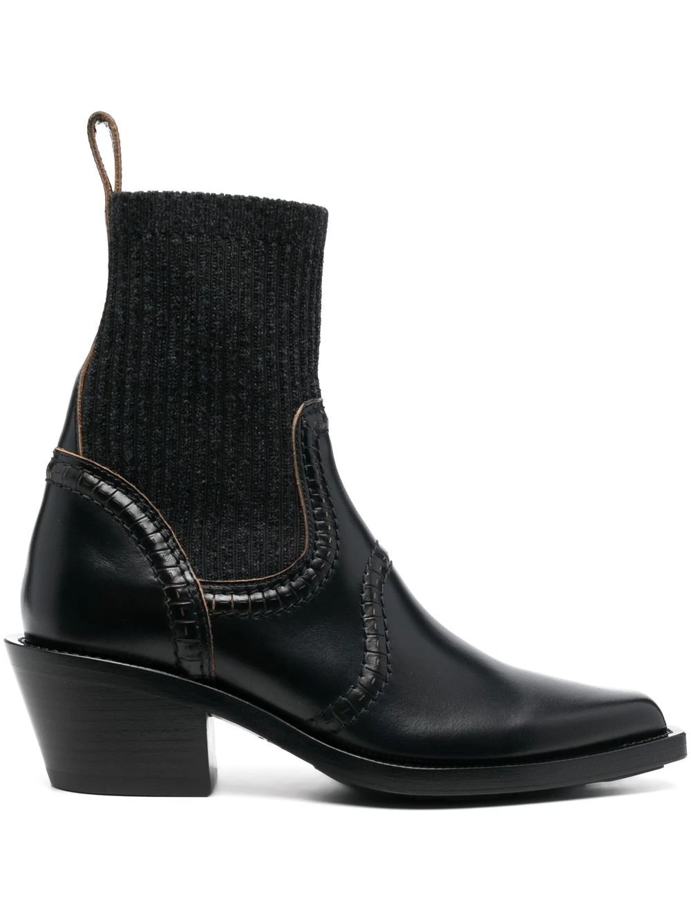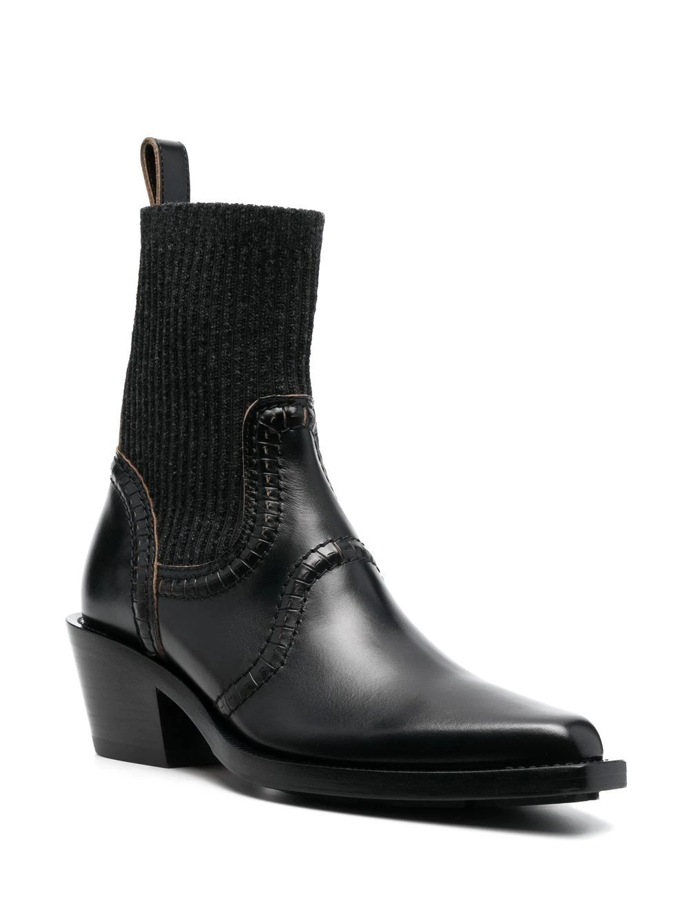 Noir, cuir de veau, bout pointu, design à empiècements, détails de coutures surfilées, maille nervurée, chevilles élastiques, languette d’enfilage au talon, petit talon épais.
