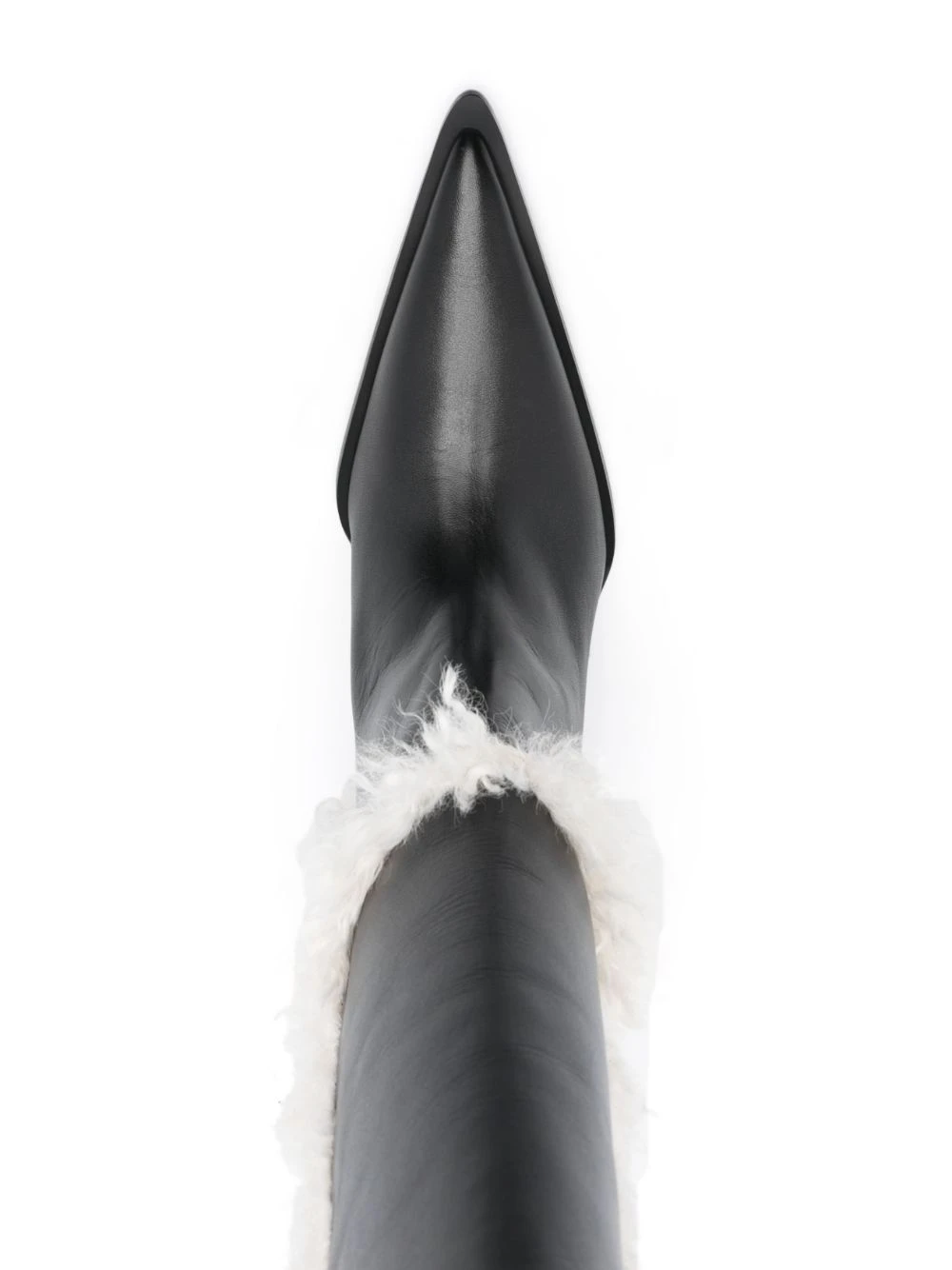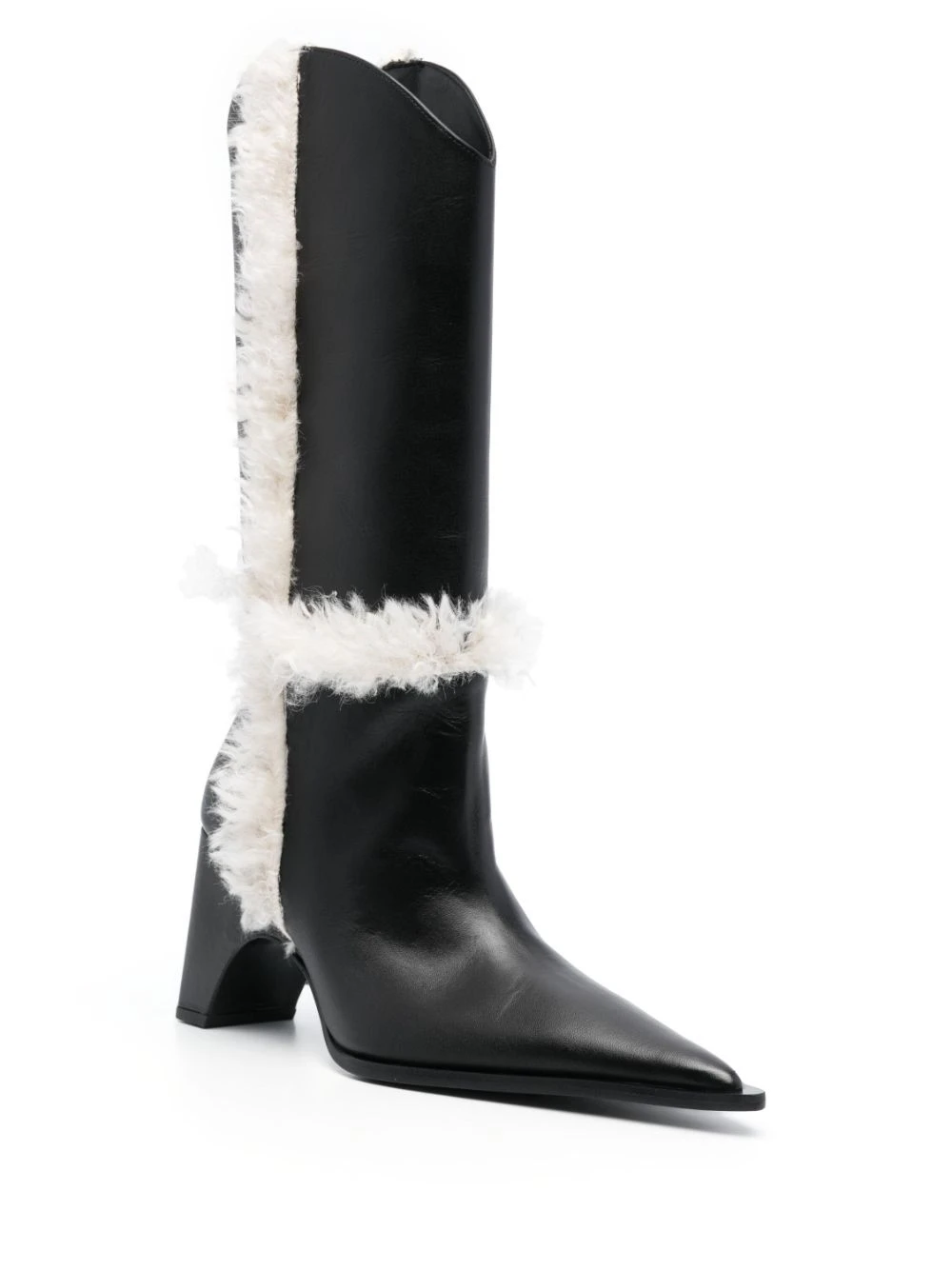 Noir, cuir, finitions en peau lainée, talon mi-haut sculpté, bout pointu.