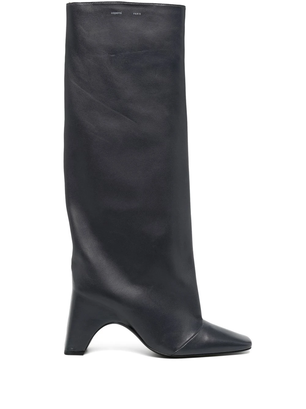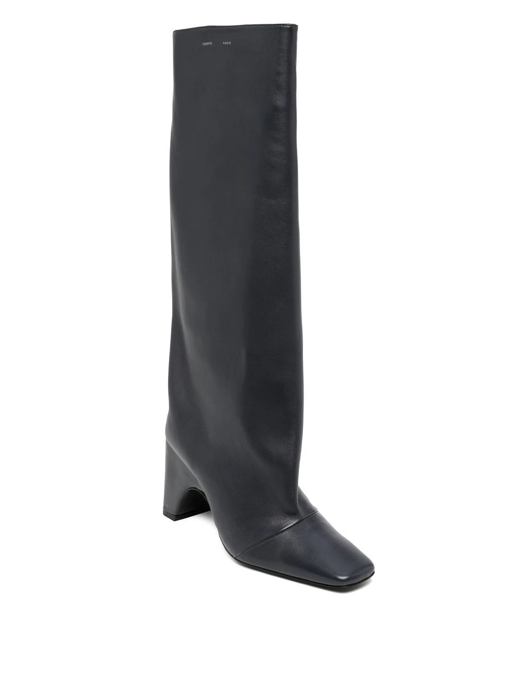 Gris foncé, cuir, doublure en cuir, semelle en cuir, semelle intérieure à logo, bout carré, design à enfiler, hauteur genou, talon mi-haut épais.