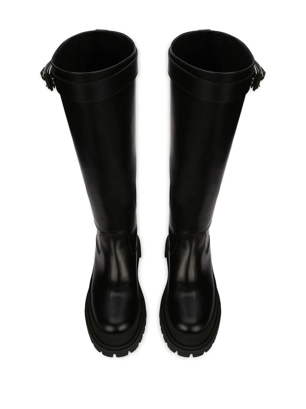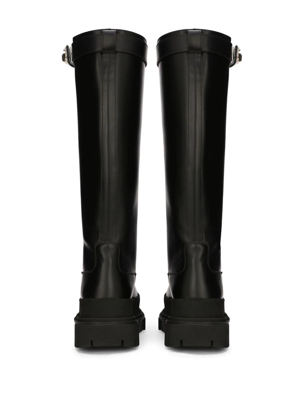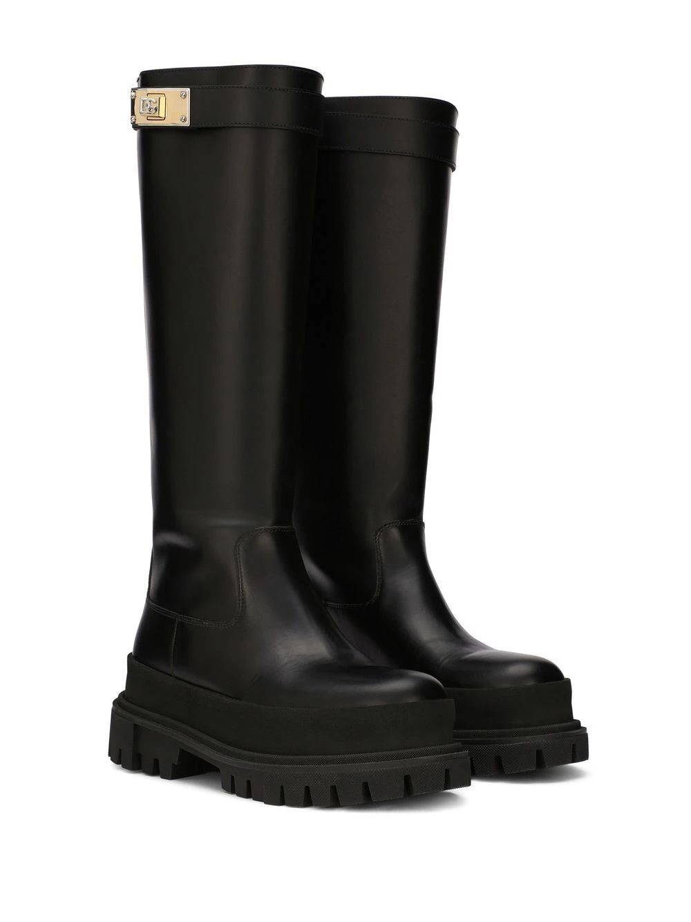 Noir, cuir de veau, plaque logo, bout rond, hauteur genou, semelle crantée en caoutchouc.