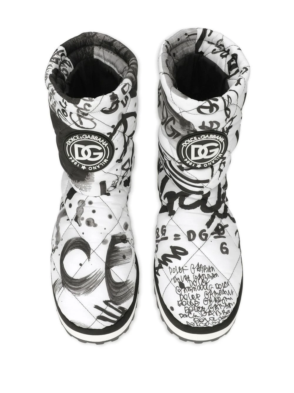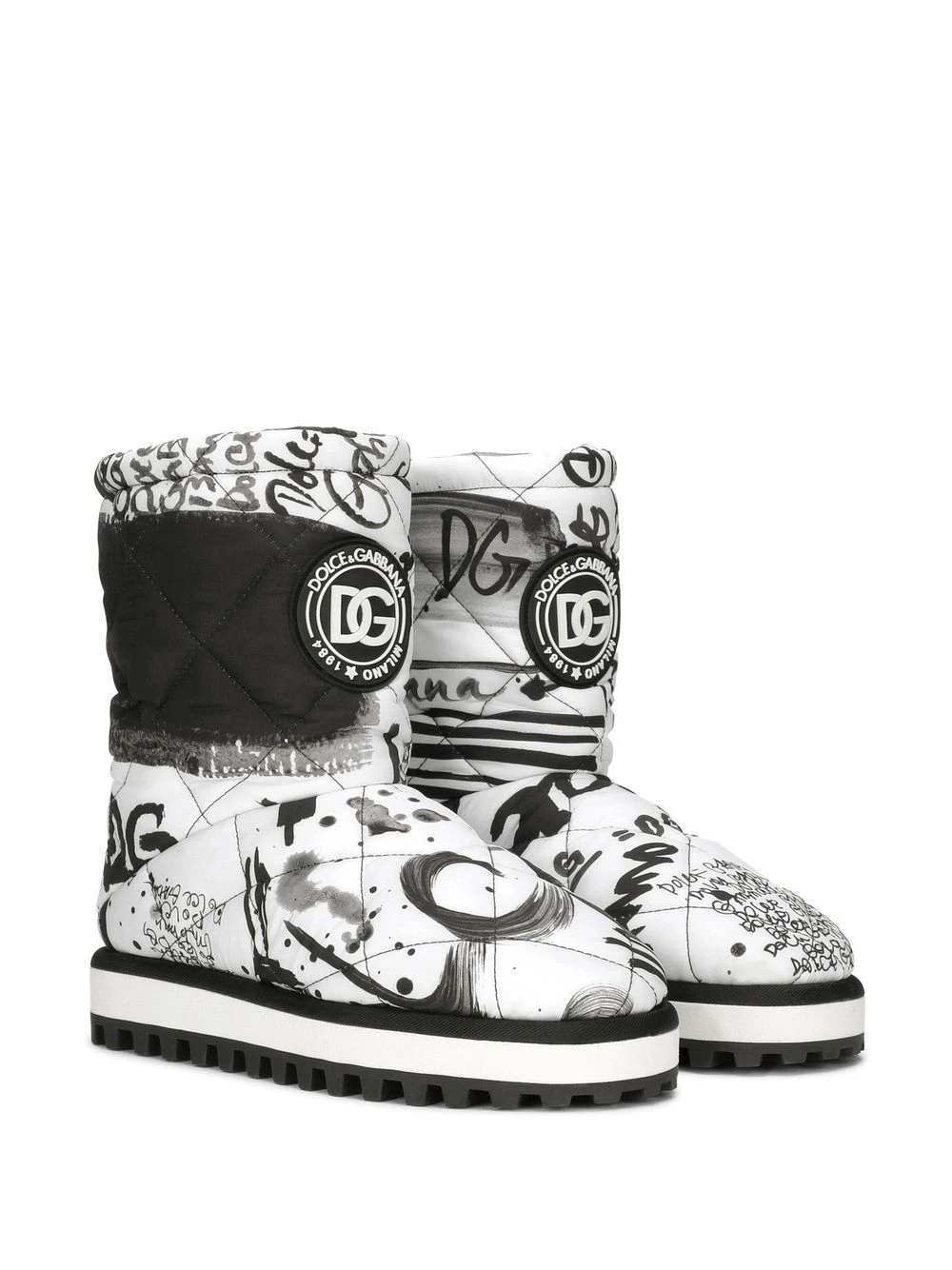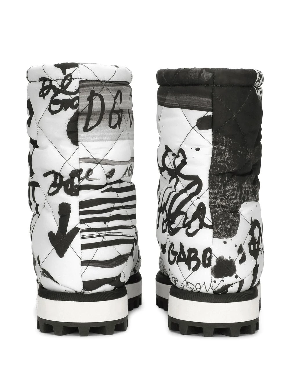 Noir/blanc, design matelassé, effet taches de peinture, logo imprimé sur le devant, hauteur cheville, à enfiler.