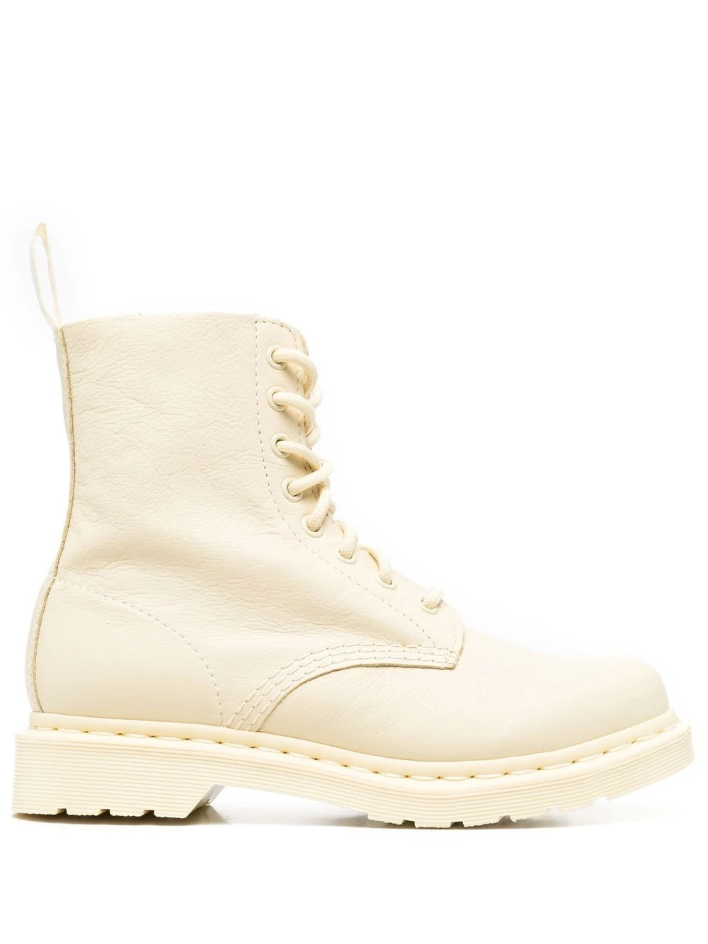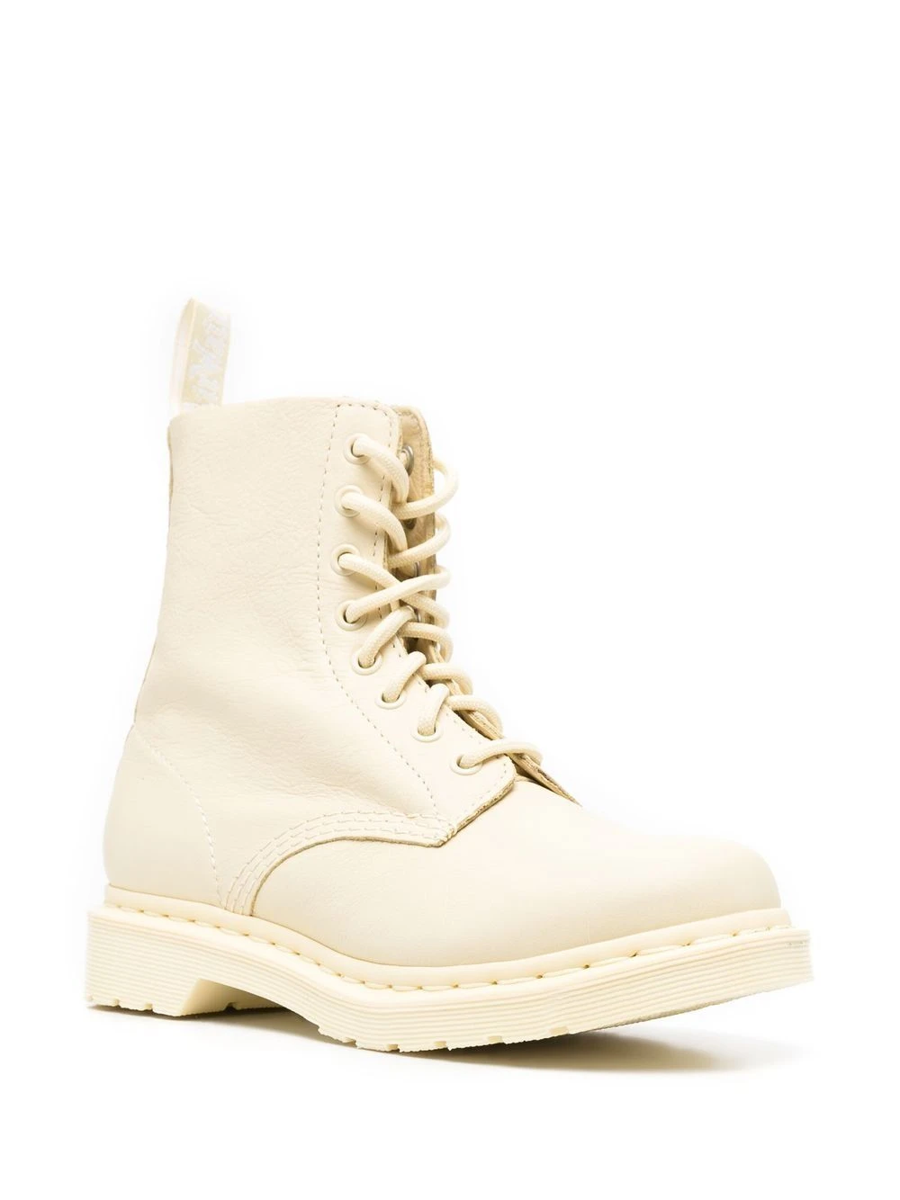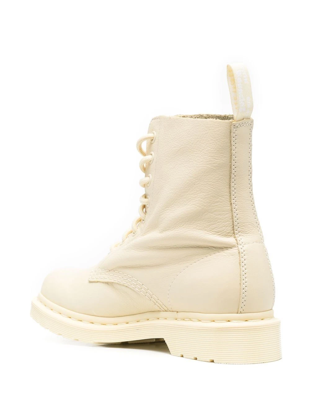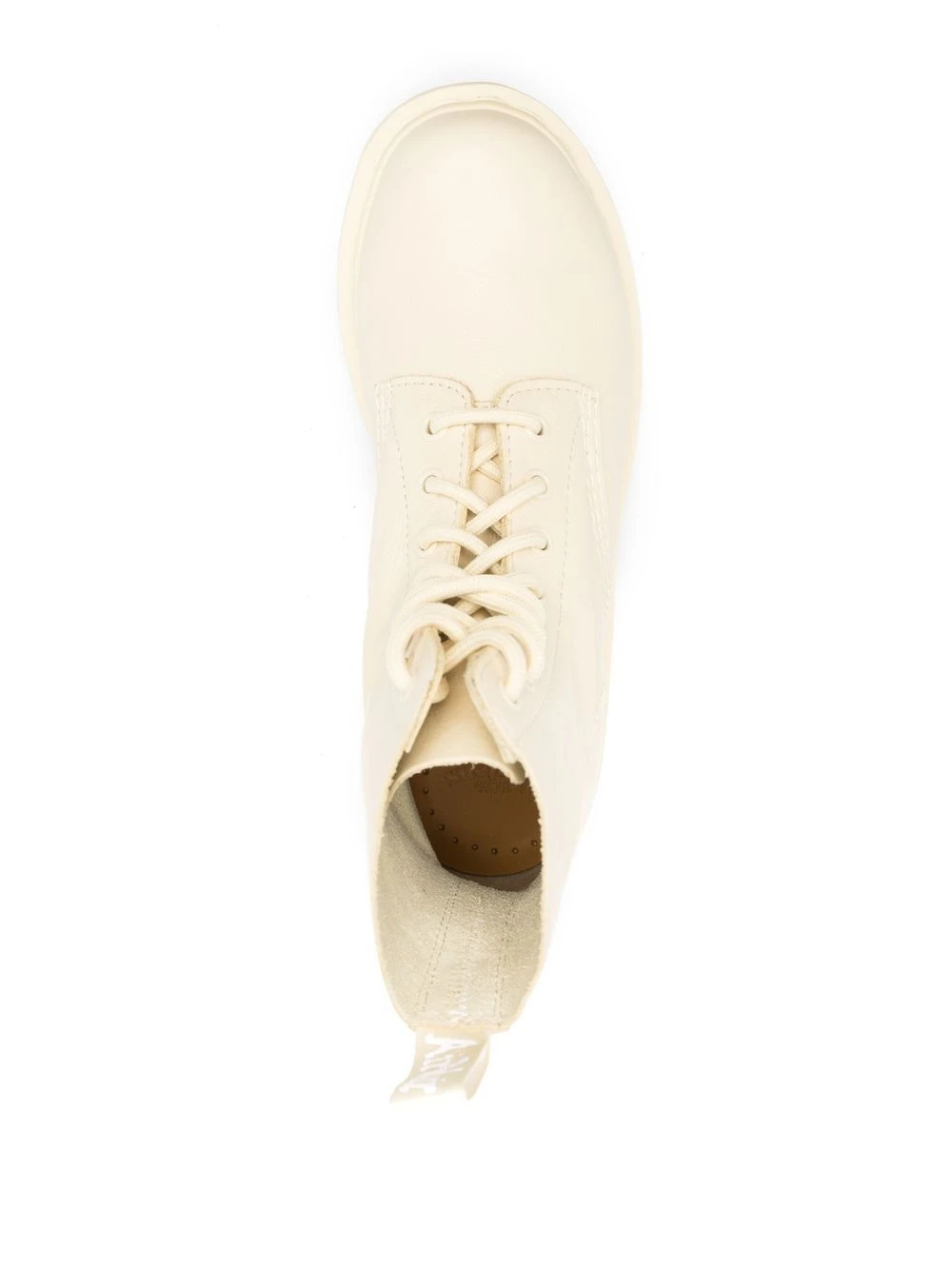 Blanc cassé, cuir, languette d’enfilage à logo au talon, fermeture à lacer sur le devant, semelle intérieure griffée, coutures ton sur ton, bout rond, hauteur cheville, semelle plate en caoutchouc.