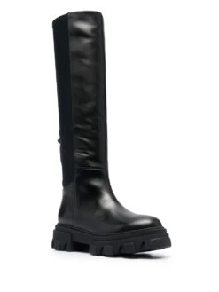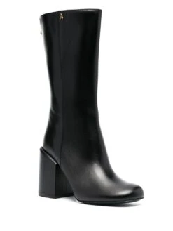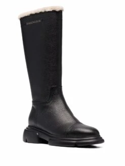 Noir, cuir de veau, ouverture à double languette, bout rond, fermeture à lacer sur le devant, semelle en caoutchouc.