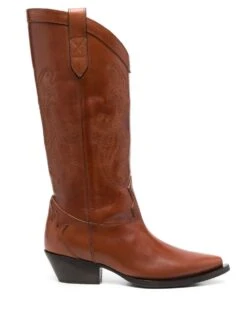 Marron, cuir de veau, couture décorative, bout pointu, petit talon épais.