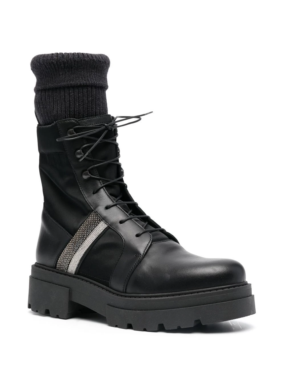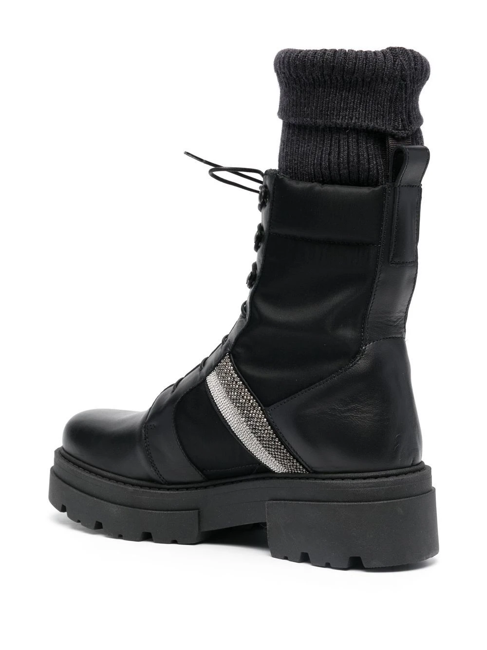 Maille nervurée, ornements en perles brodées, fermeture à lacer sur le devant, bout rond, semelle crantée en caoutchouc.