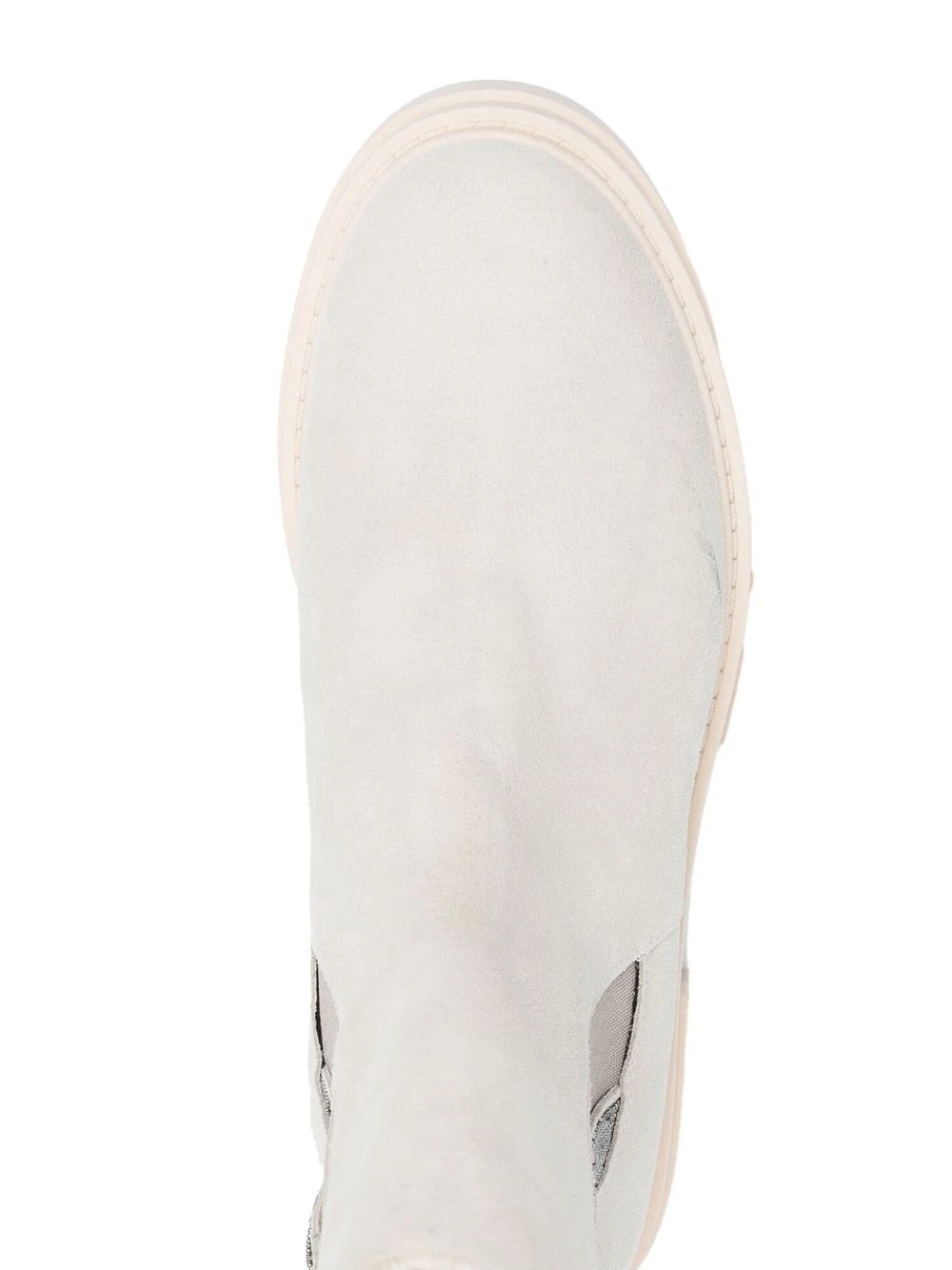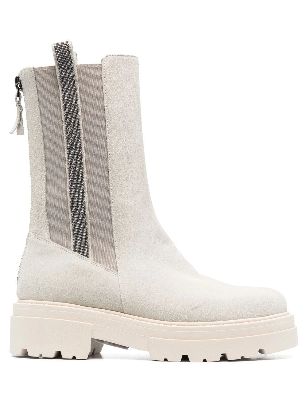Blanc cassé, cuir de veau, bout rond, ouverture à double languette, fermeture zippée à l’arrière, semelle épaisse en caoutchouc.