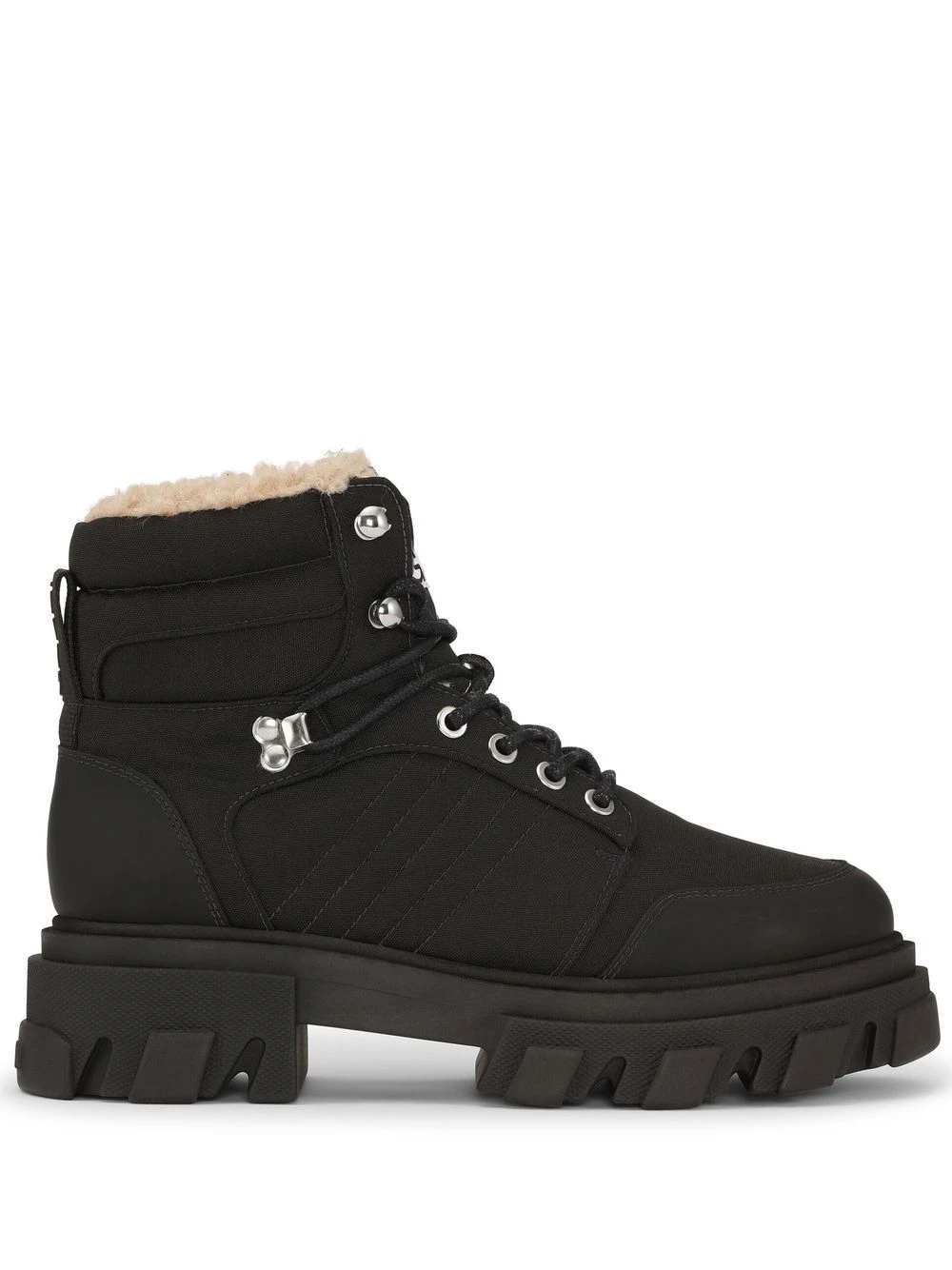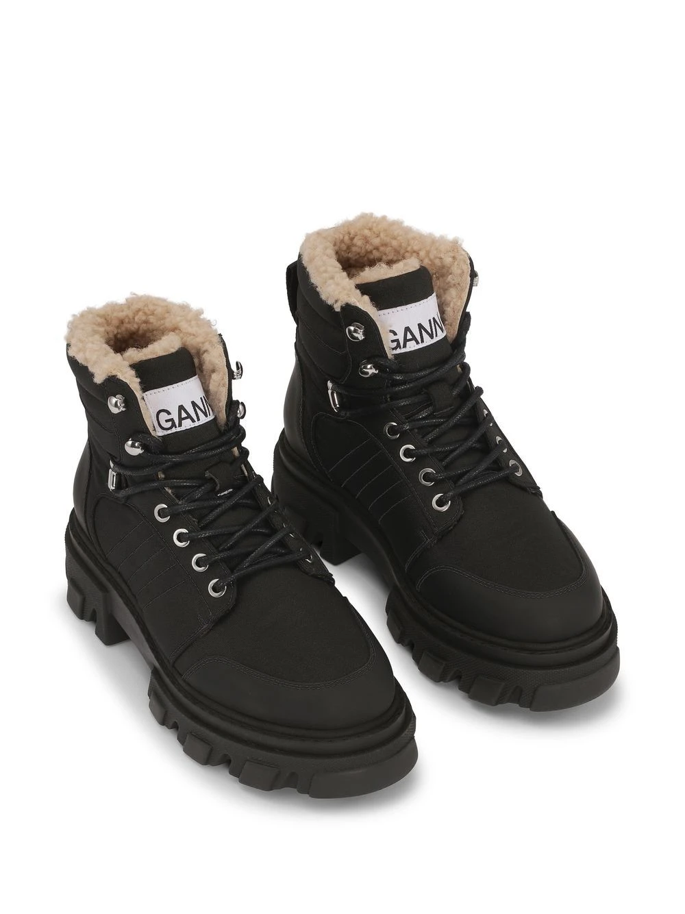 Noir, cuir de veau, finitions en peau lainée artificielle, bout rond, fermeture à lacer sur le devant, petit talon épais, semelle épaisse en caoutchouc. CHOIX CONSCIENT : Certifié neutre en carbone. Les émissions de carbone produites ont été calculées, réduites et la quantité résiduelle compensée.