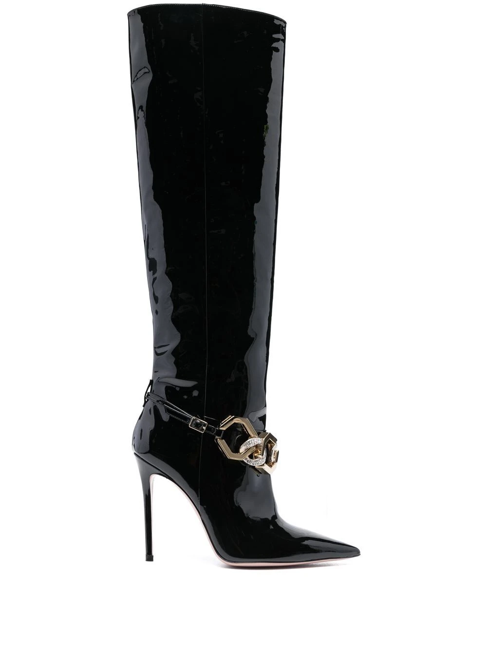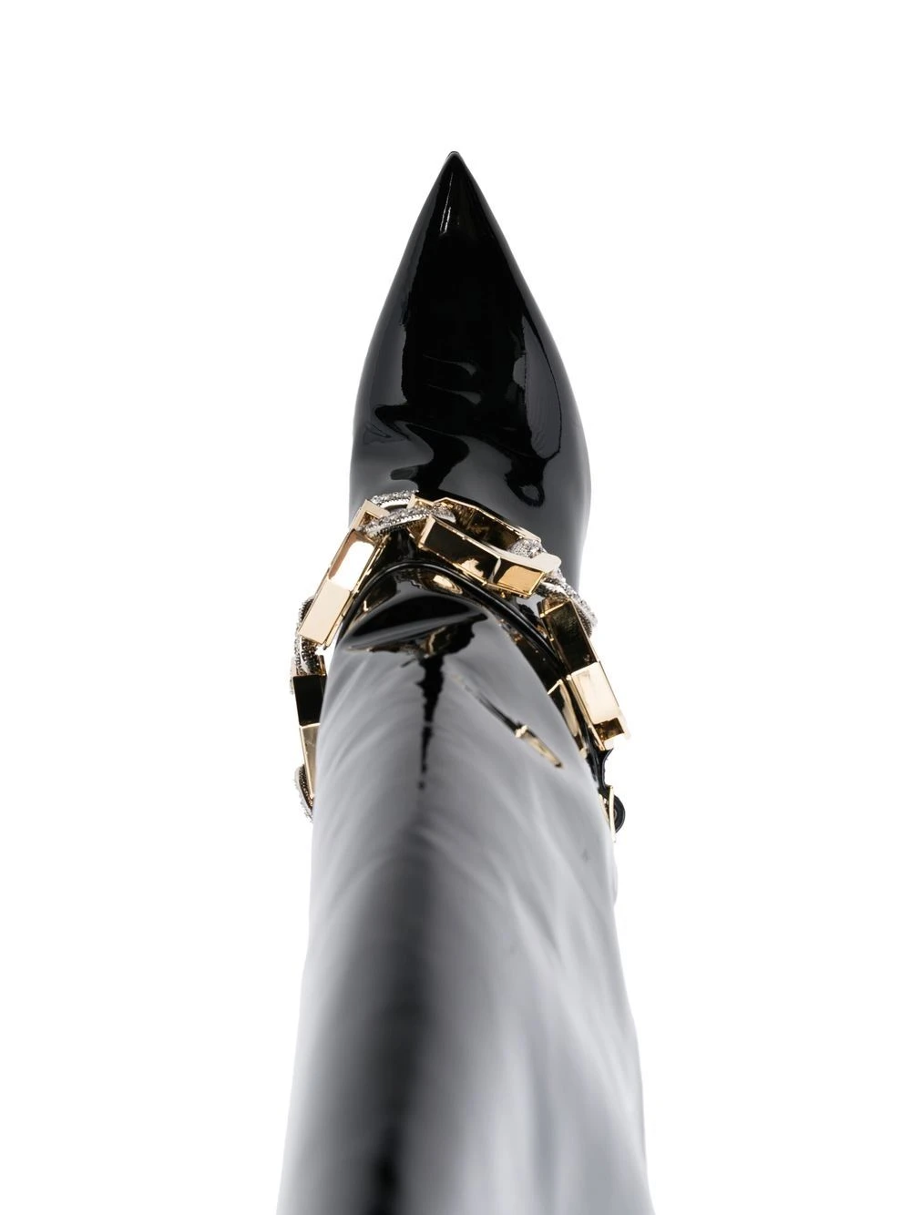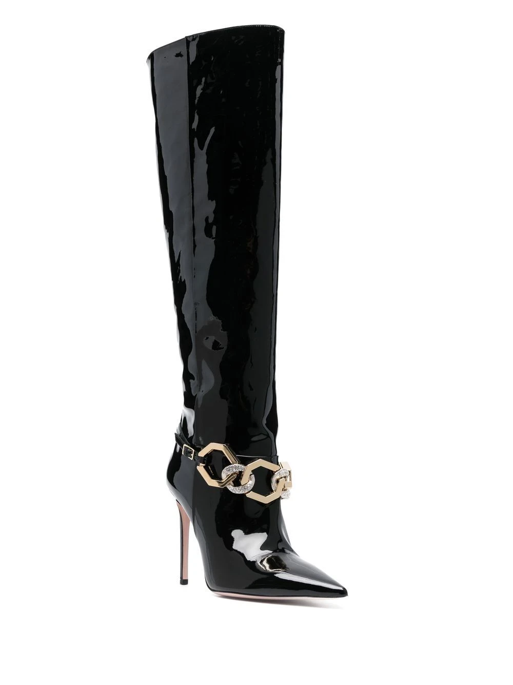 Noir, cuir de veau, fini verni, détails de chaînes, ornement en cristal, bout pointu, design à enfiler, talon aiguille haut.