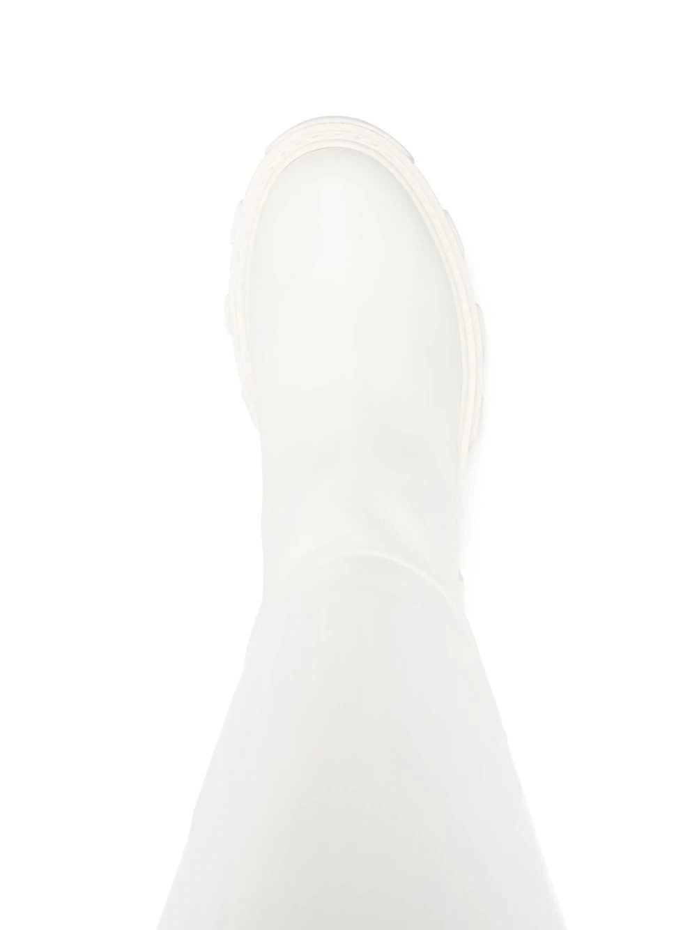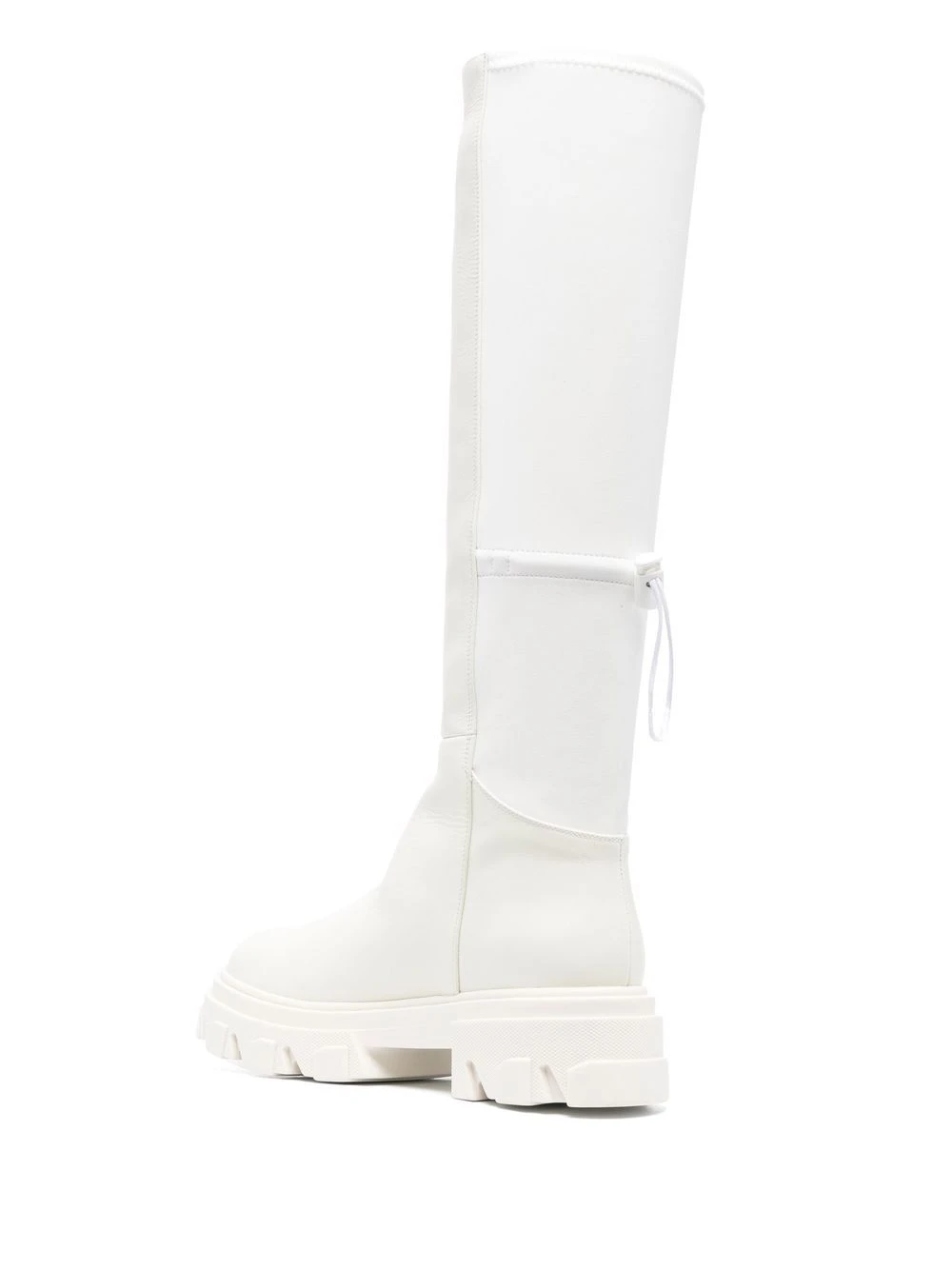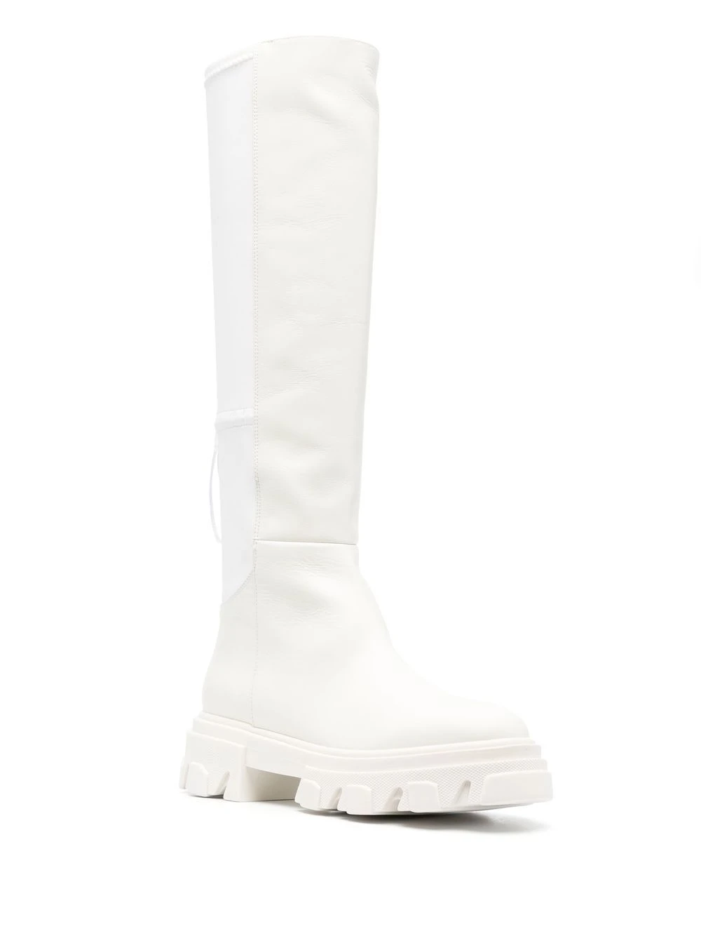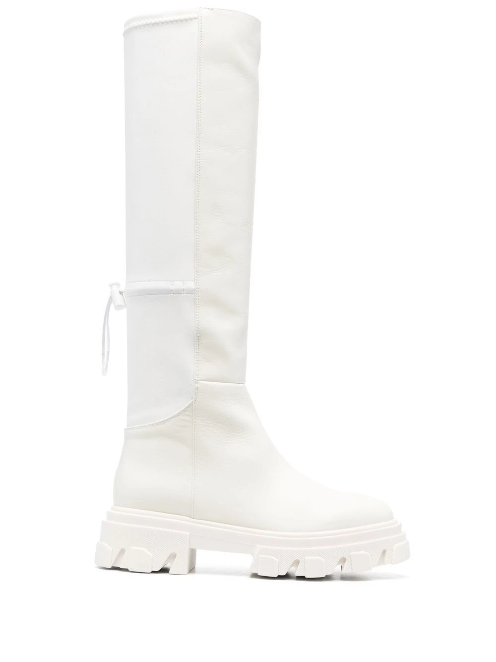 Blanc ivoire, cuir de veau, bout rond, fermeture nouée au dos, semelle épaisse en caoutchouc, petit talon.