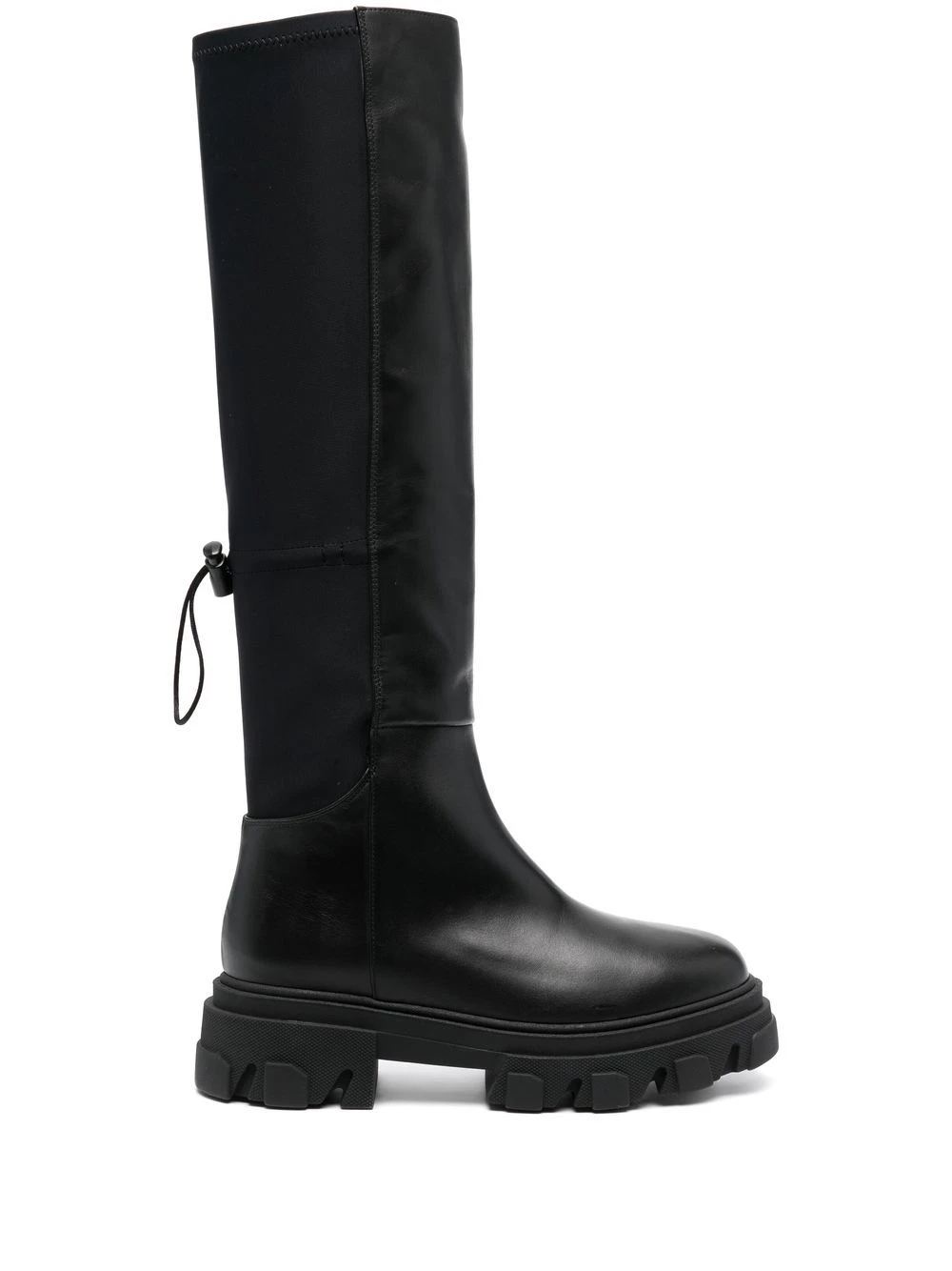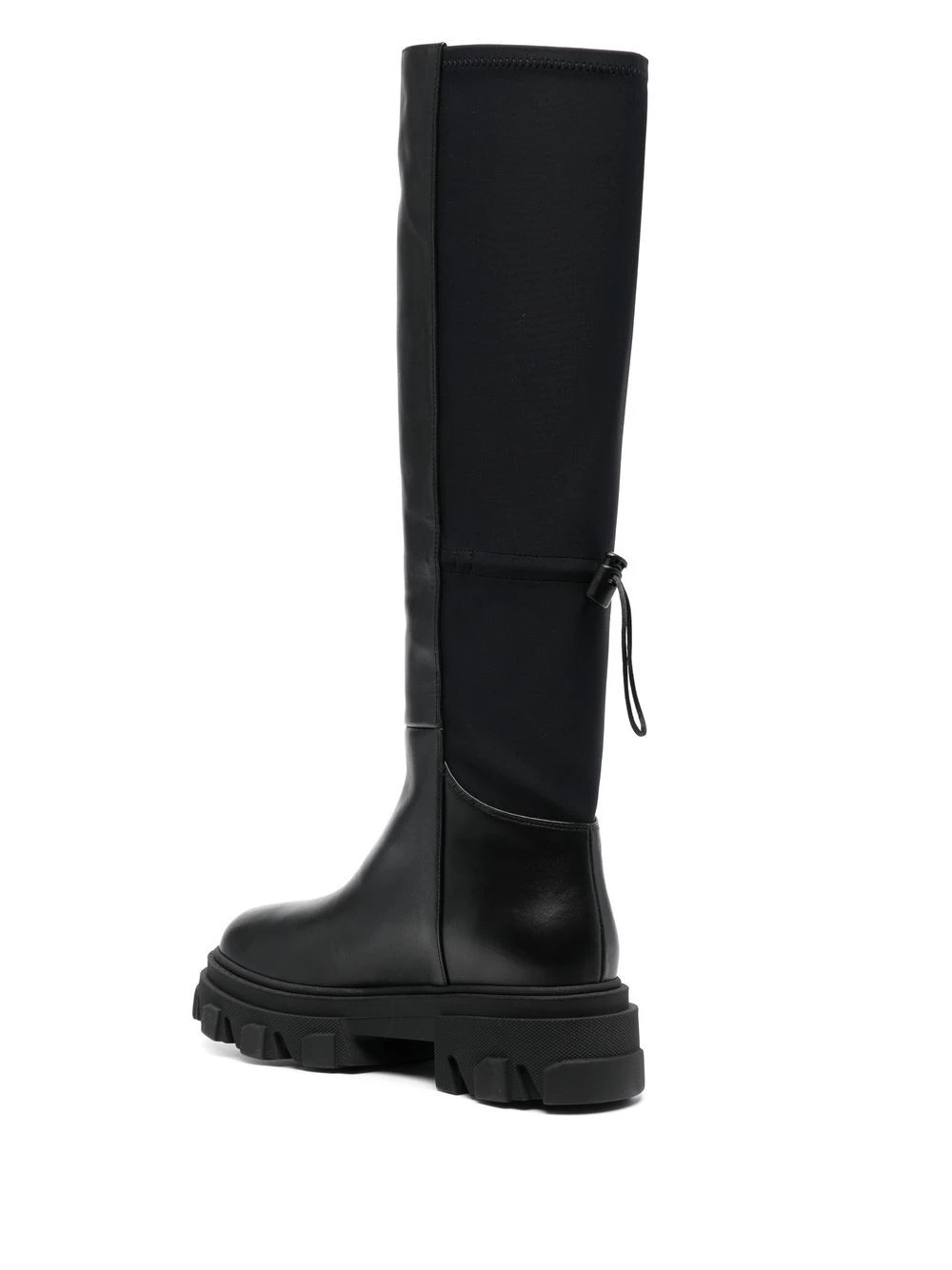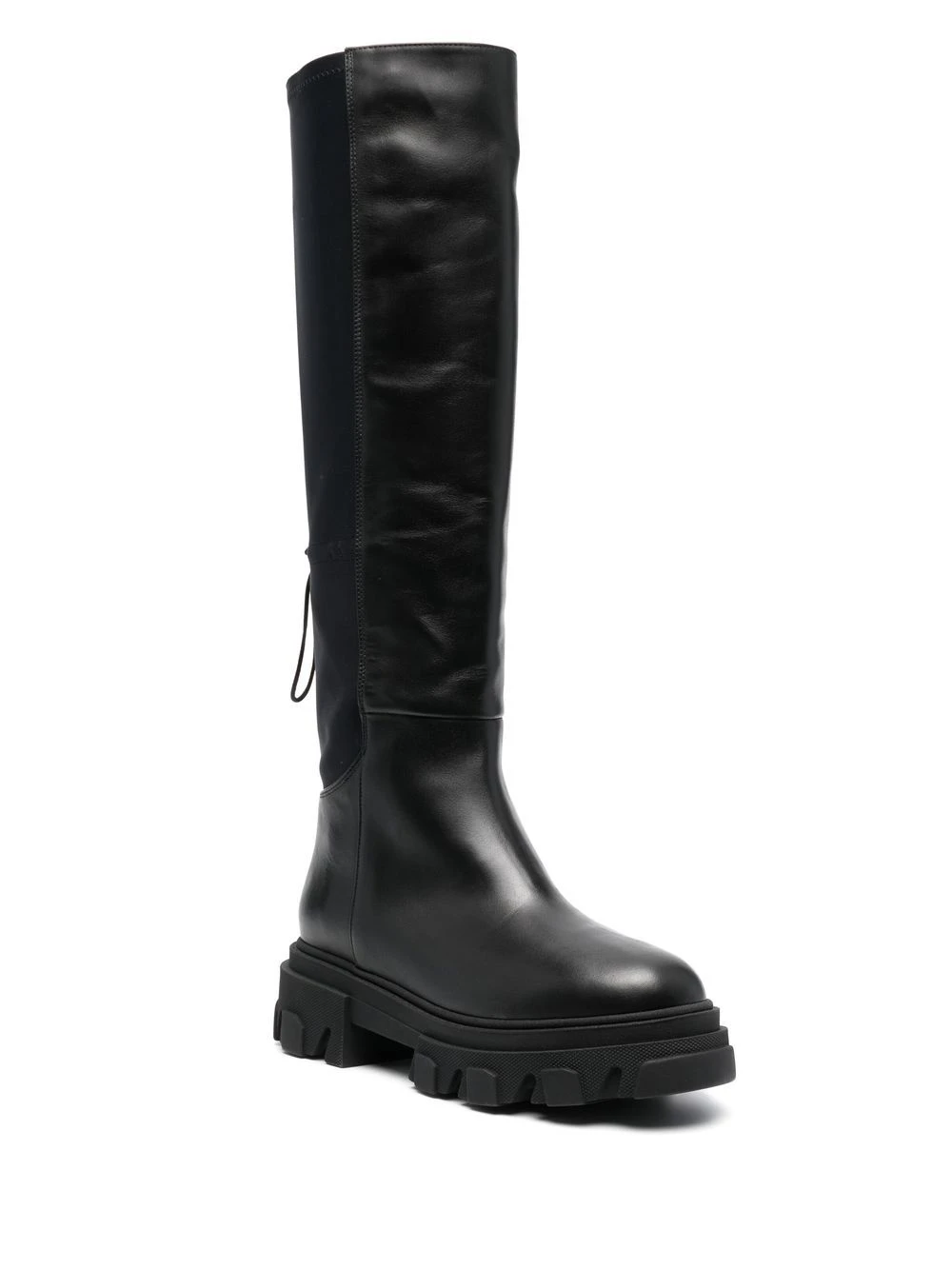 Noir, cuir, bout rond, hauteur genou, semelle épaisse.