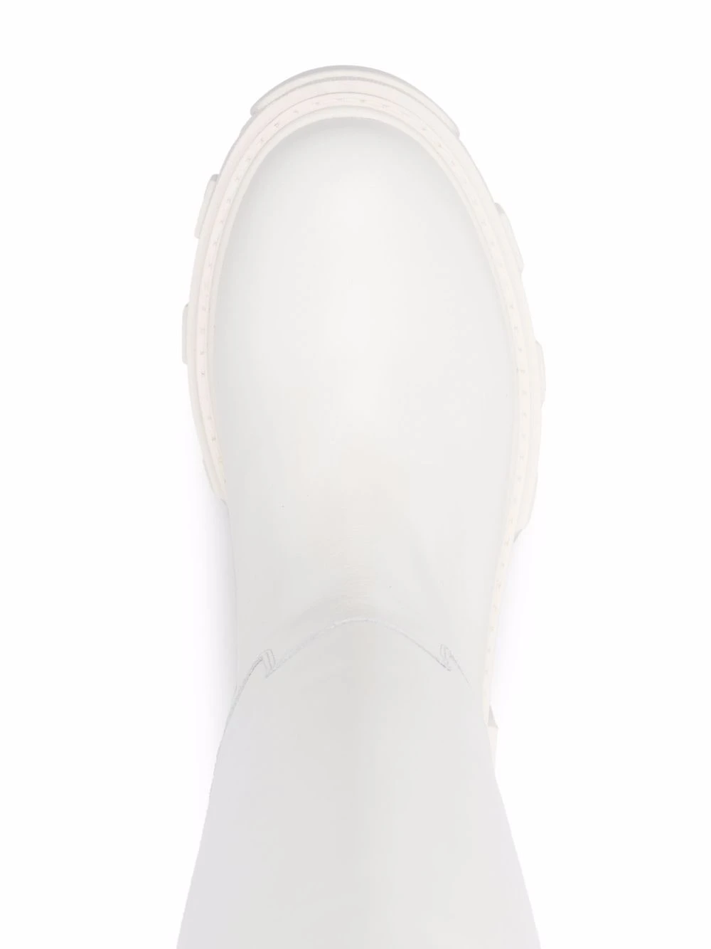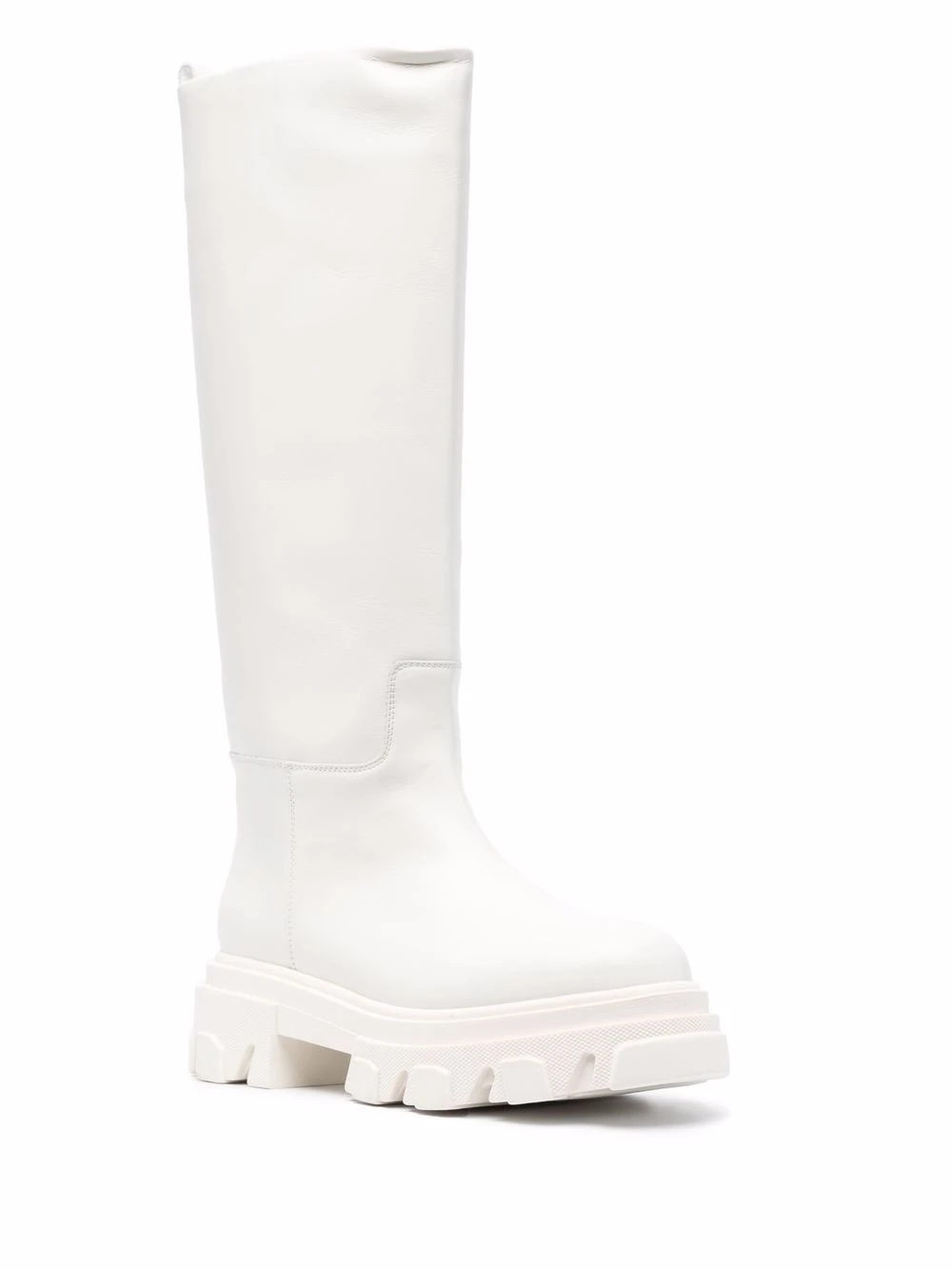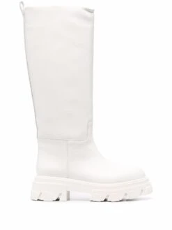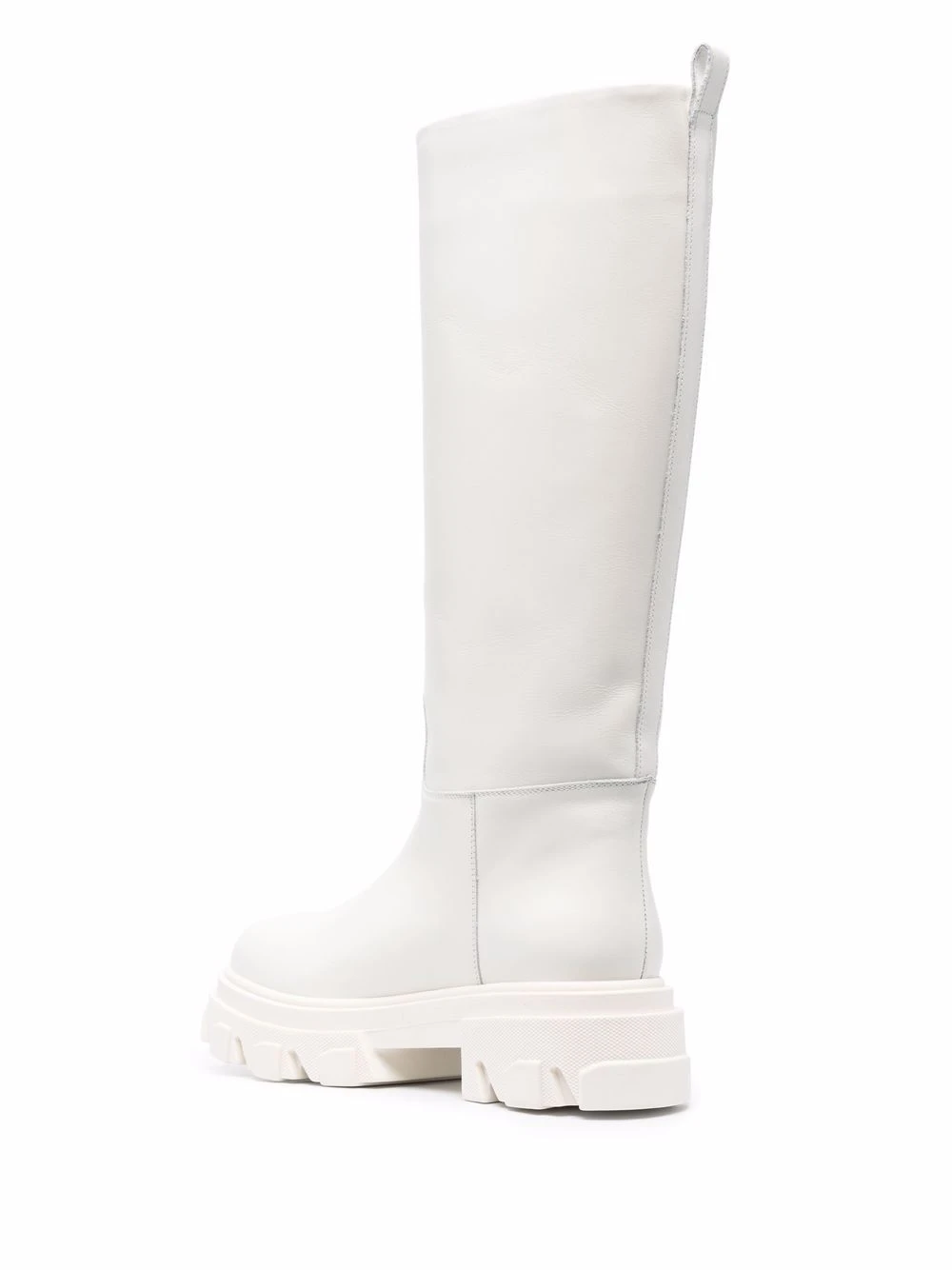 Hauteur genou, languette d’enfilage au talon, bout rond, semelle crantée en caoutchouc. Couleur : blanc. Matière : cuir de veau.