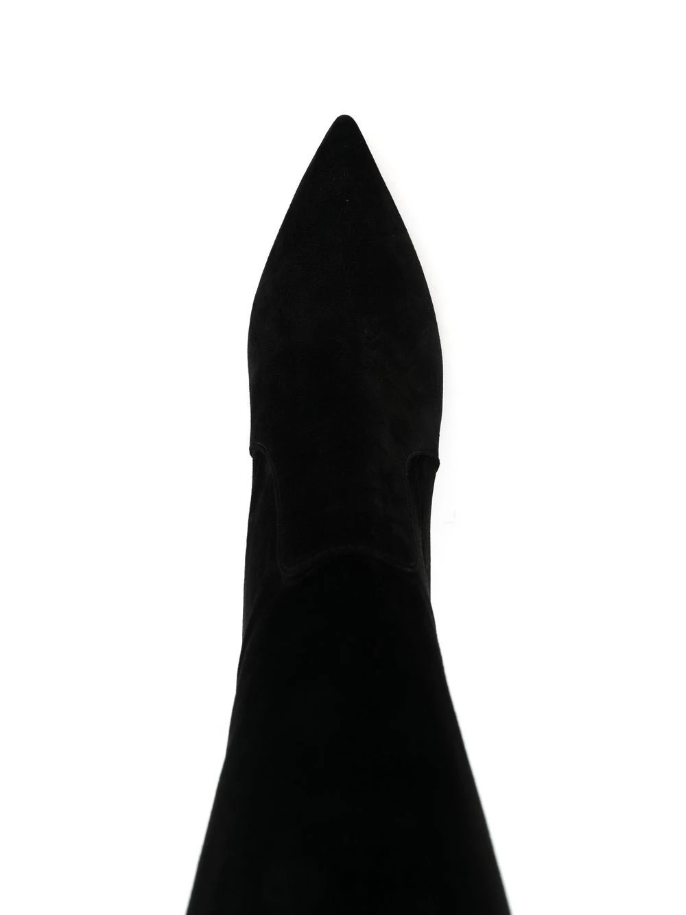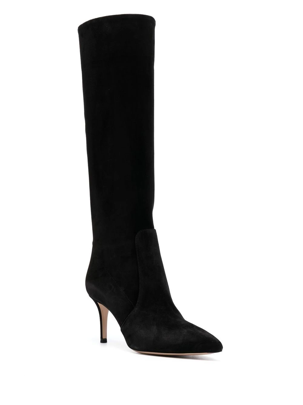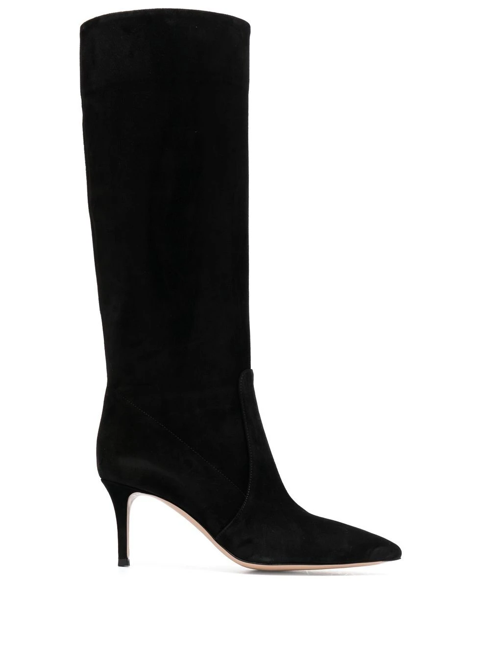 Noir, veau velours, à enfiler, hauteur genou, bout pointu, talon haut, semelle extérieure en cuir.