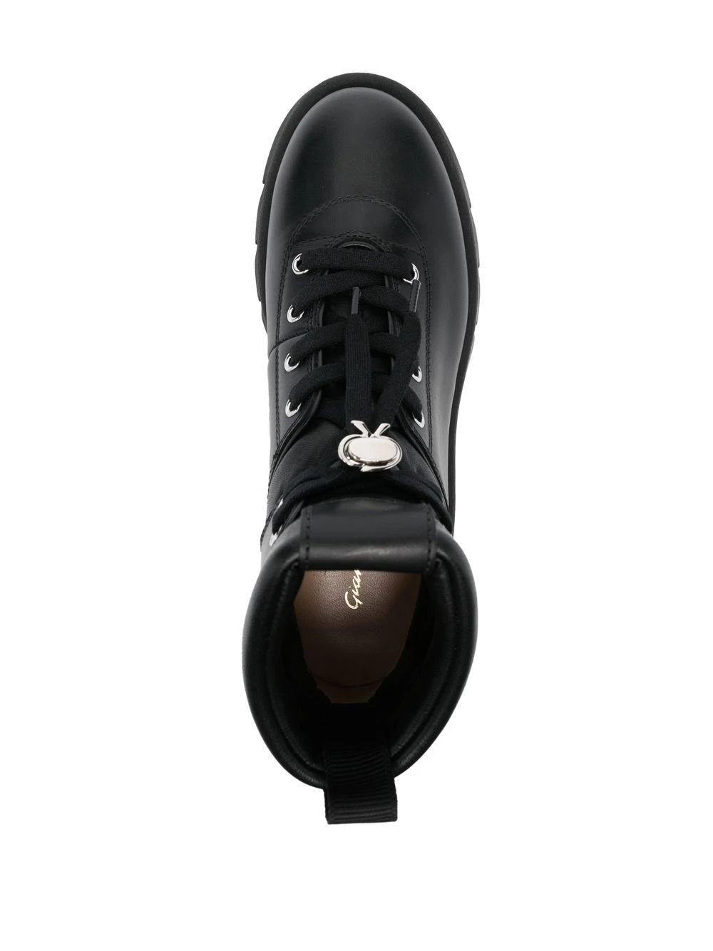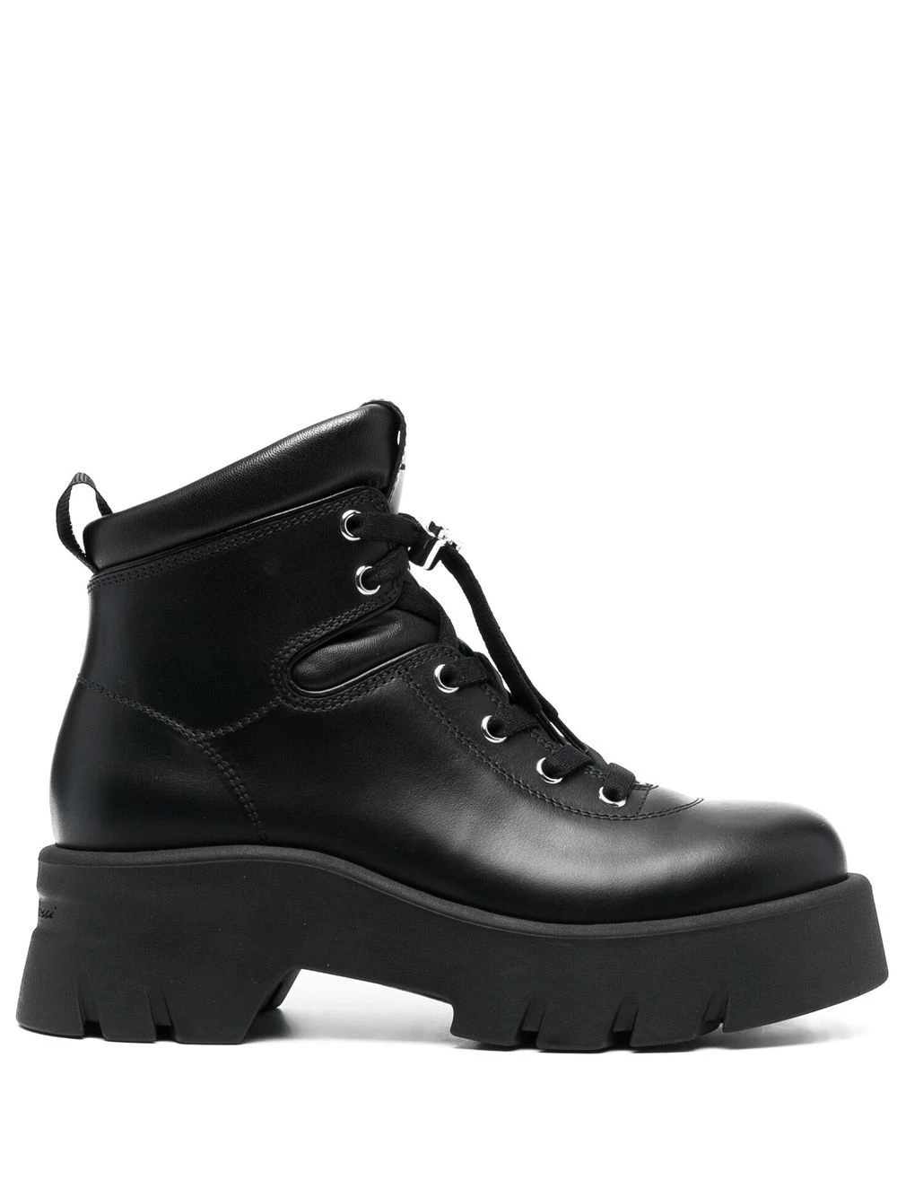 Noir, cuir de veau, plaque logo argentée, détails d’œillets, fermeture à lacer sur le devant, bout rond, languette d’enfilage au talon, semelle intérieure à logo, semelle épaisse crantée en caoutchouc.