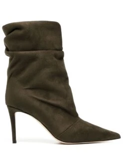 Vert forêt, cuir, hauteur cheville, détails de fronces, bout pointu, talon aiguille haut.