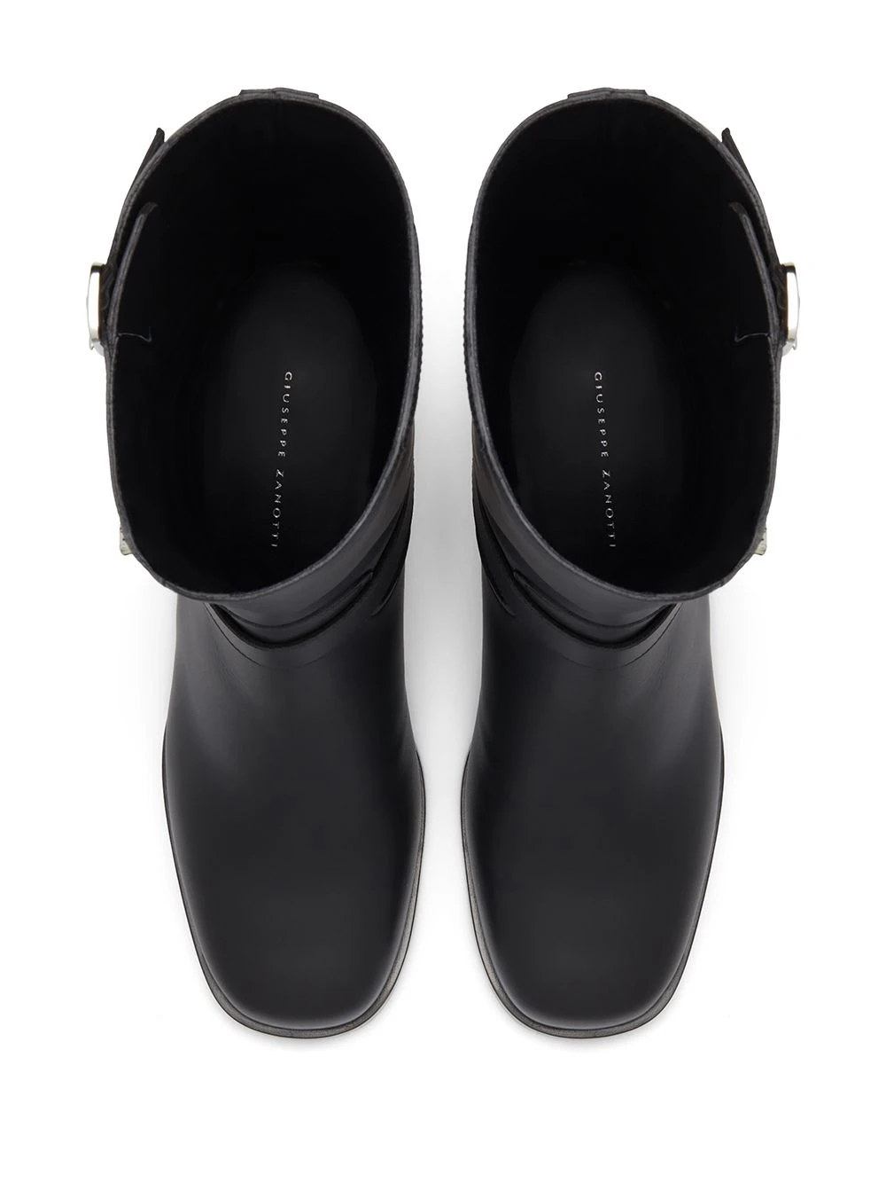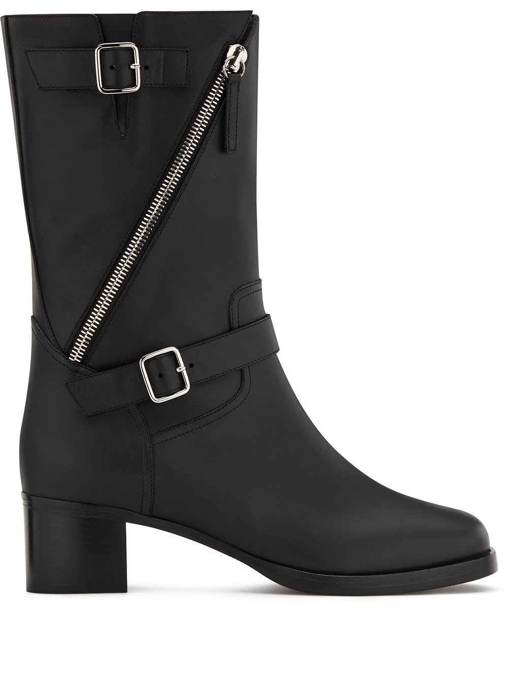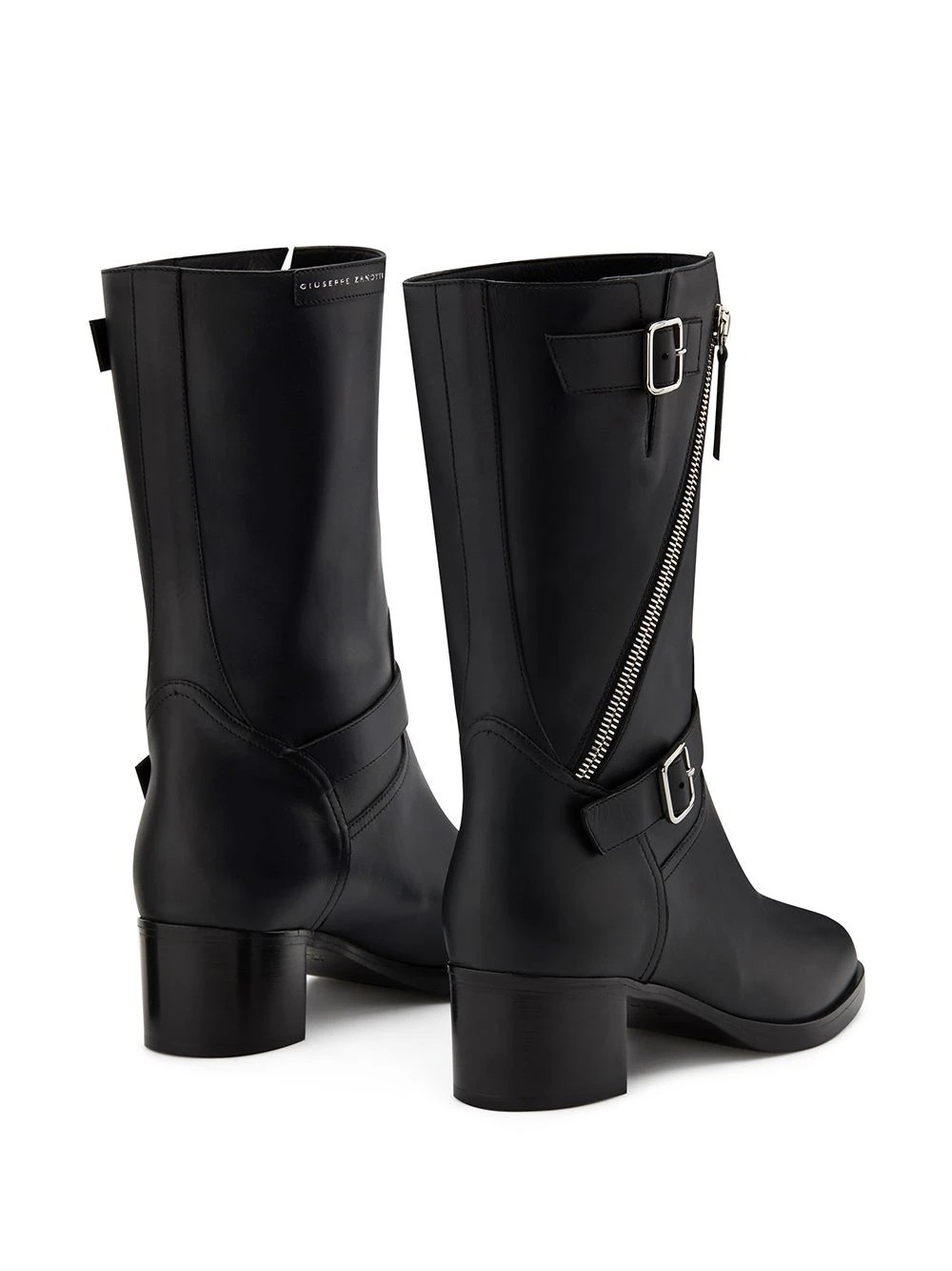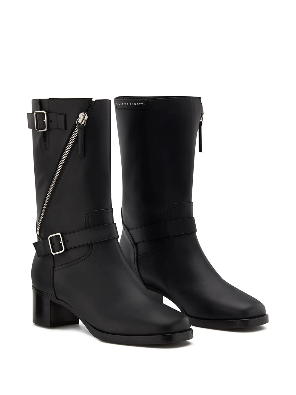Bottes Esther en cuirs Giuseppe Zanotti avec bout rond, petit talon épais, fermeture zippée latérale et longueur mi-mollet. Couleur : noir.