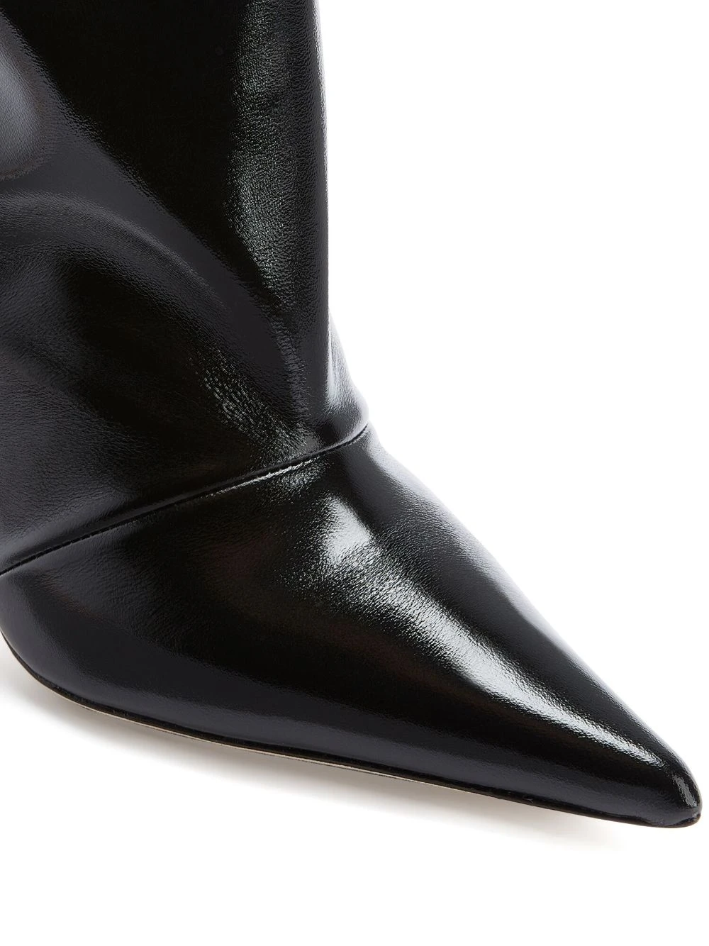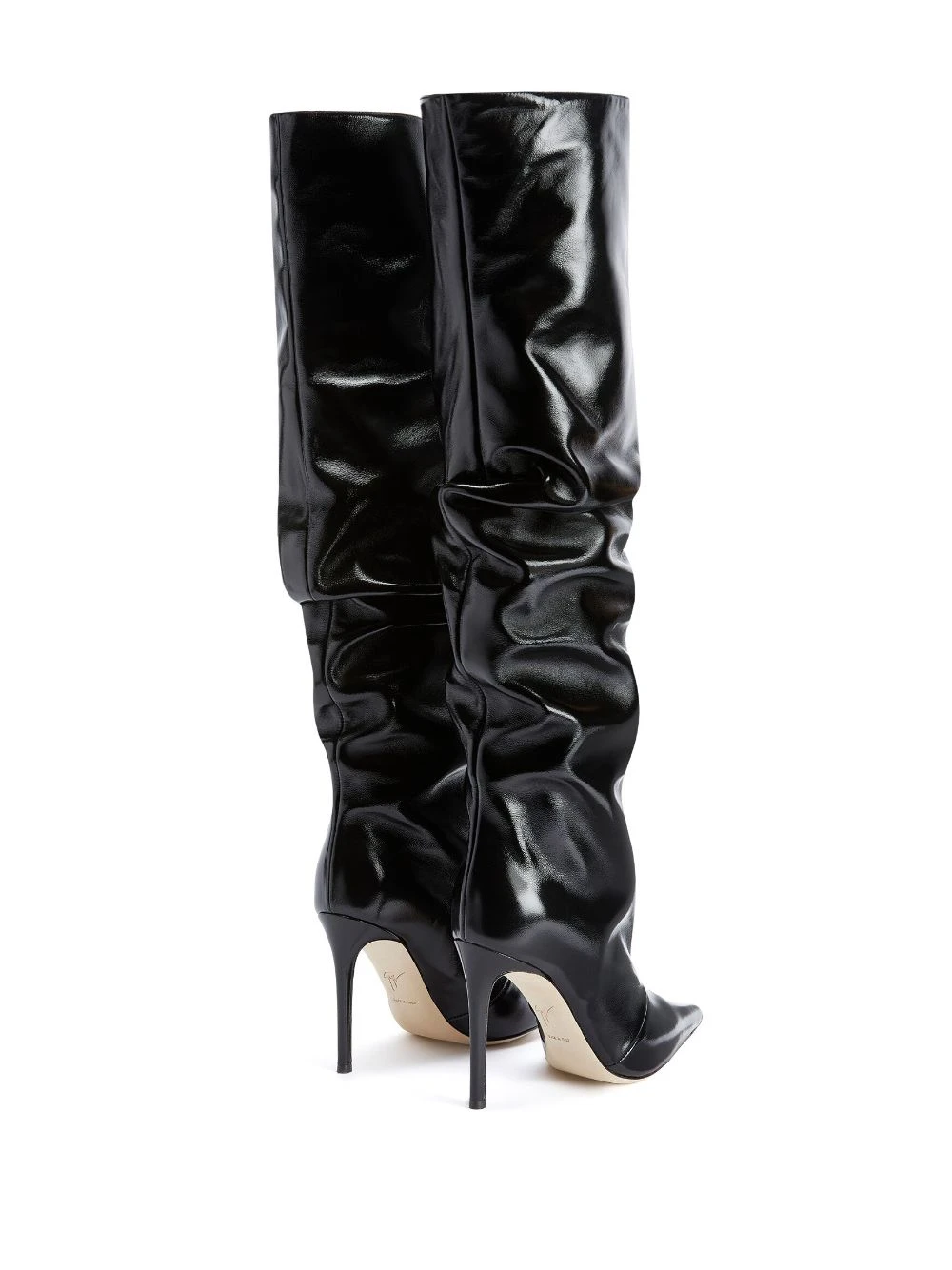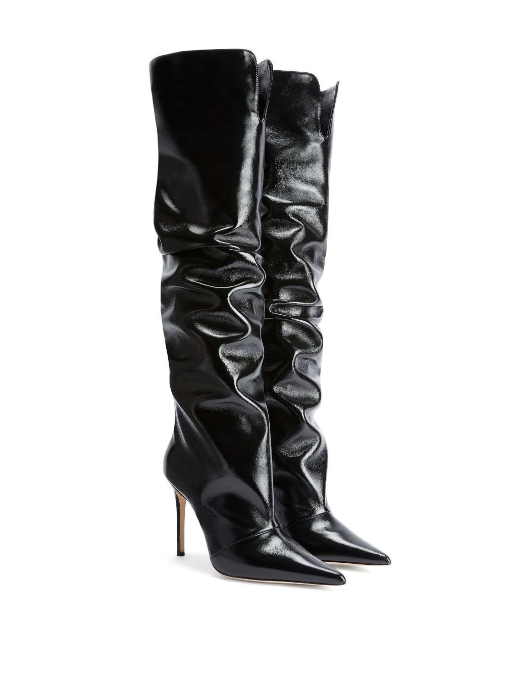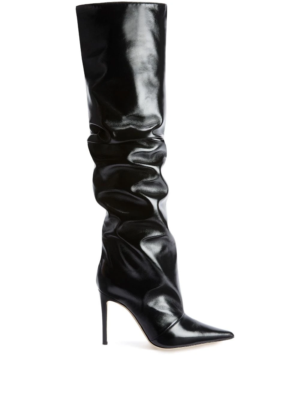 Noir, fini verni, effet froissé, bout pointu, talon aiguille haut, fente sur le devant.