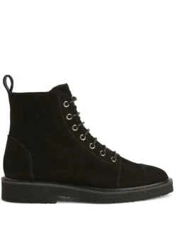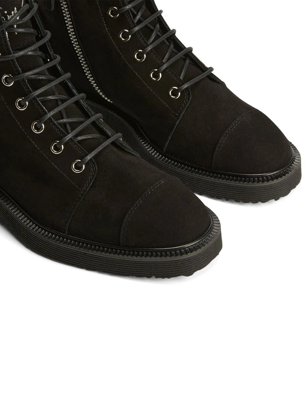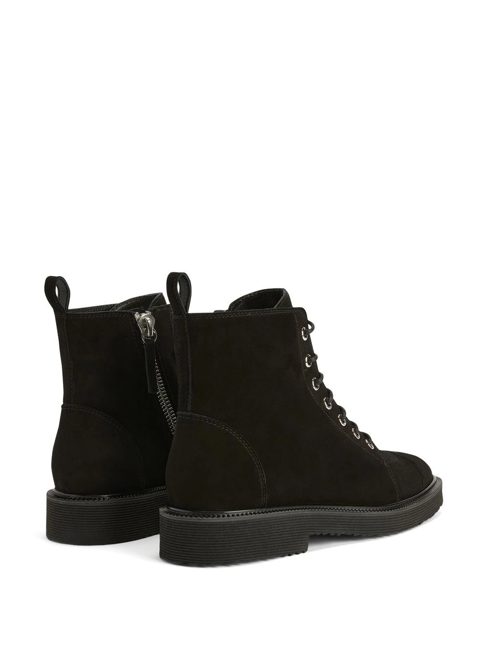 Noir, cuir, daim, bout rond, fermeture à lacer sur le devant, languette à patch logo, fermeture zippée sur le côté, hauteur cheville, languette d’enfilage au talon, semelle plate en caoutchouc.