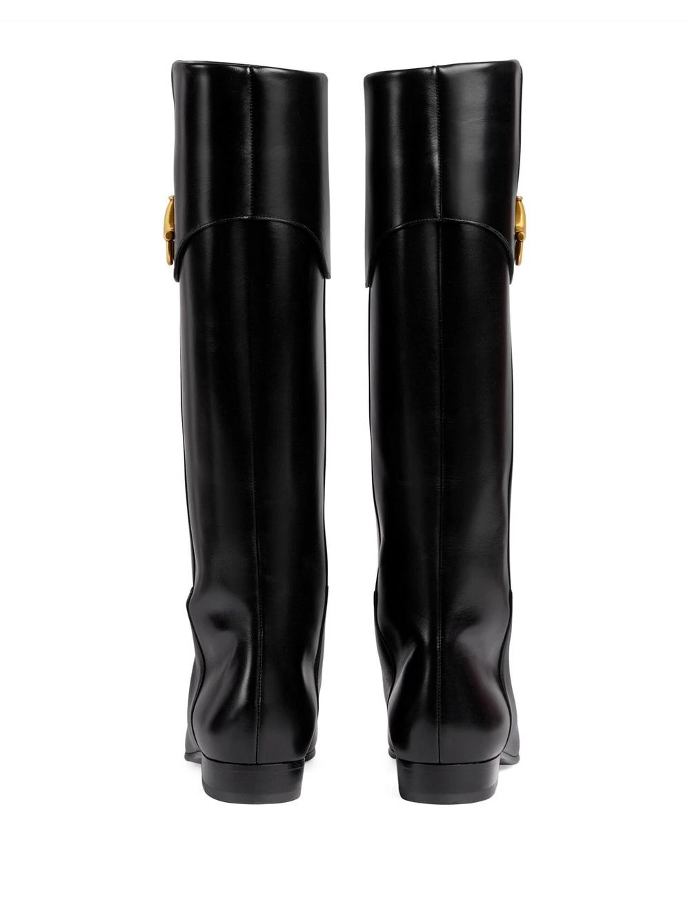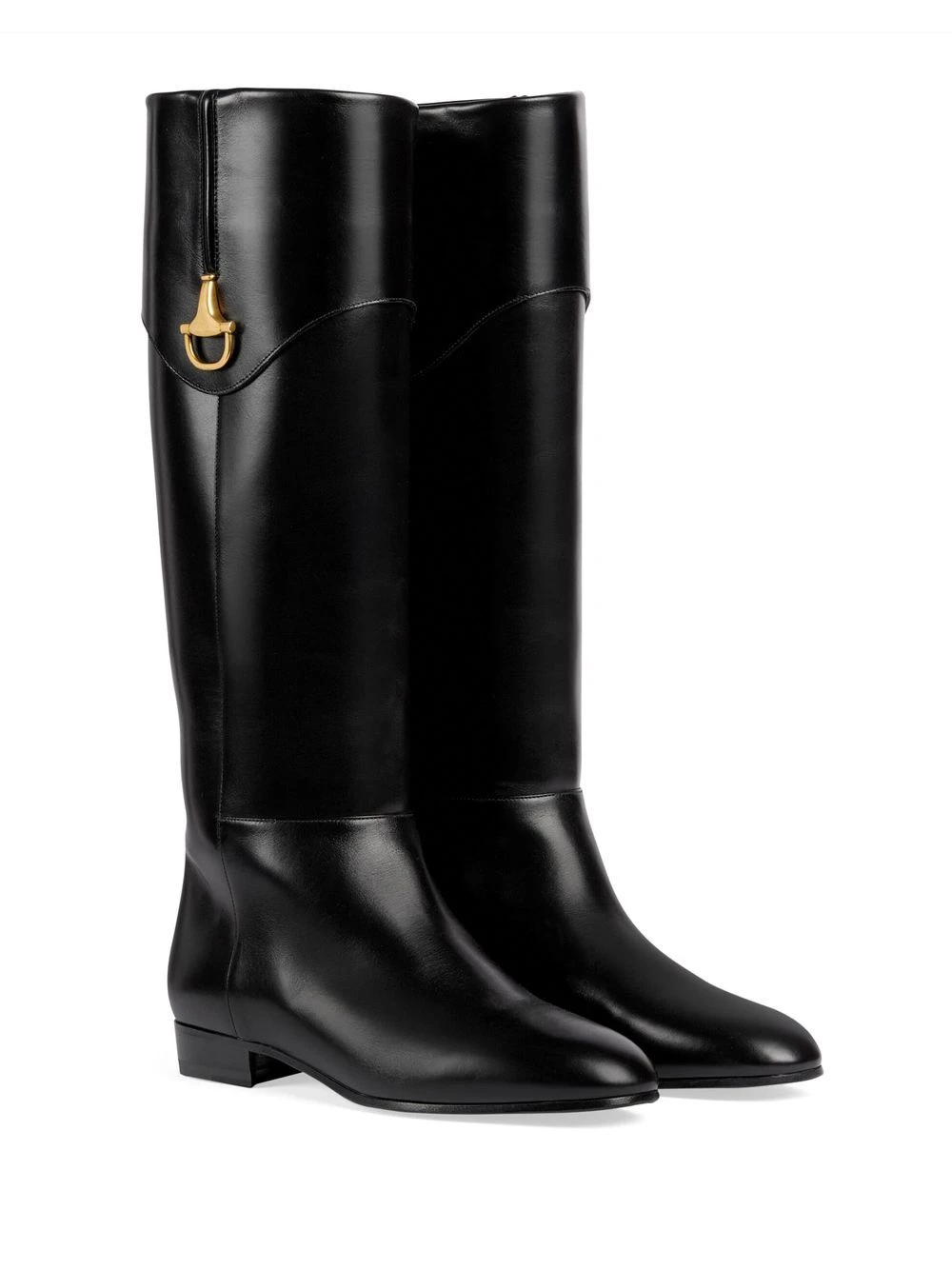 Noir, cuir de veau, fini brillant, détail de mors signature, hauteur genou, bout en amande, semelle plate en cuir.