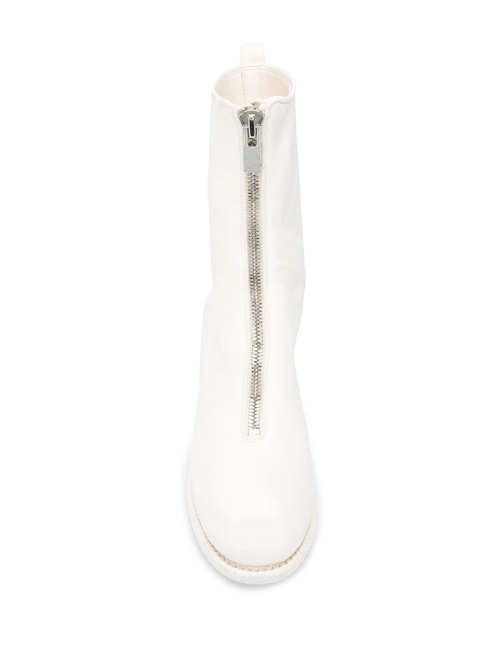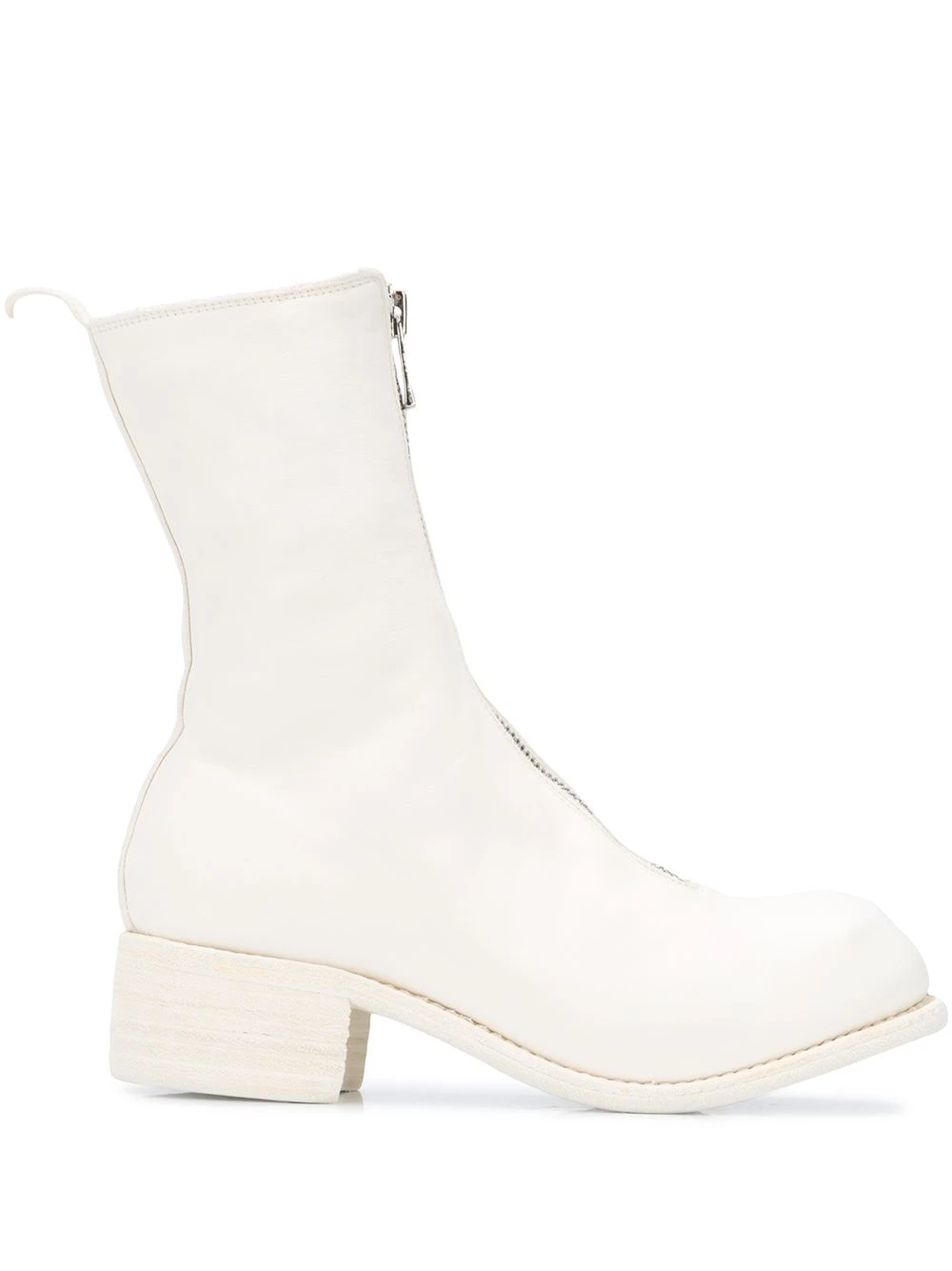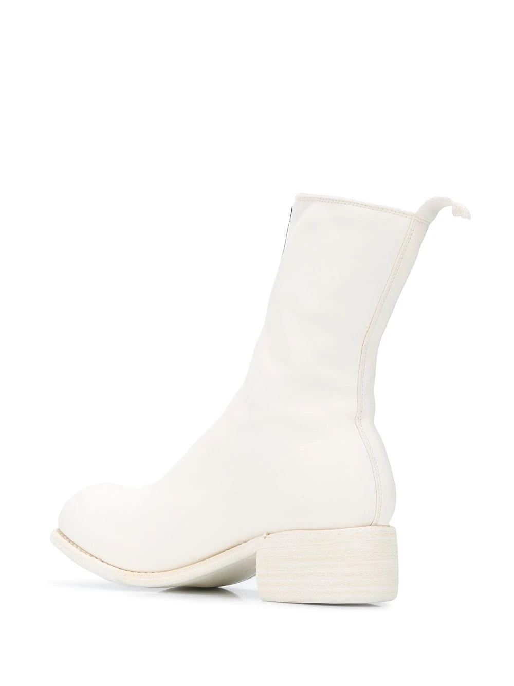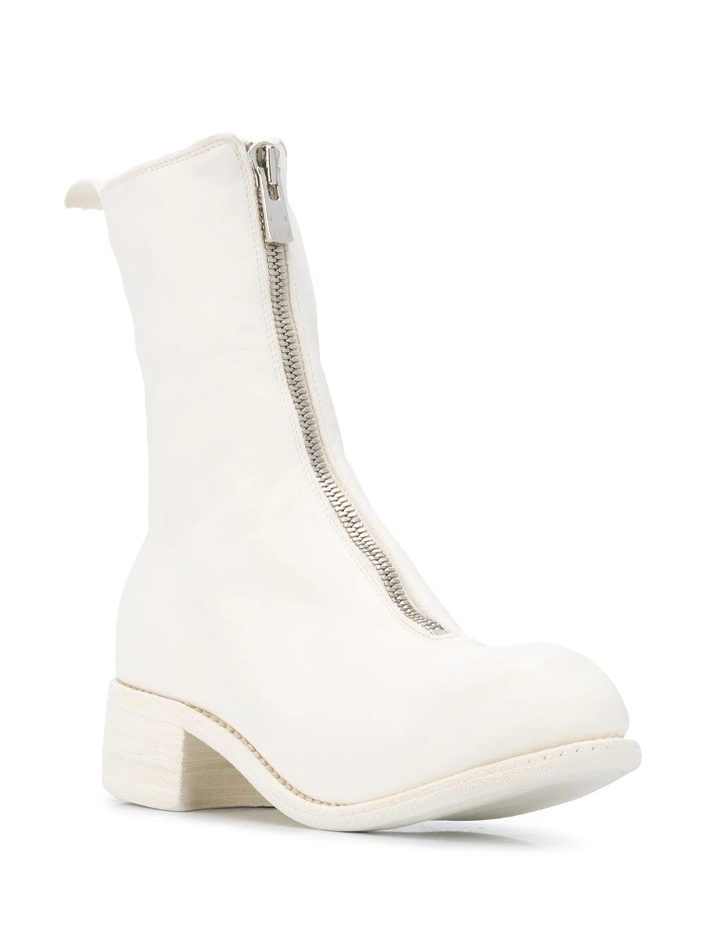 Bottes à fermeture zippée en cuir Guidi avec hauteur cheville, bout rond, semelle intérieure à logo et petit talon épais. Couleur : blanc.