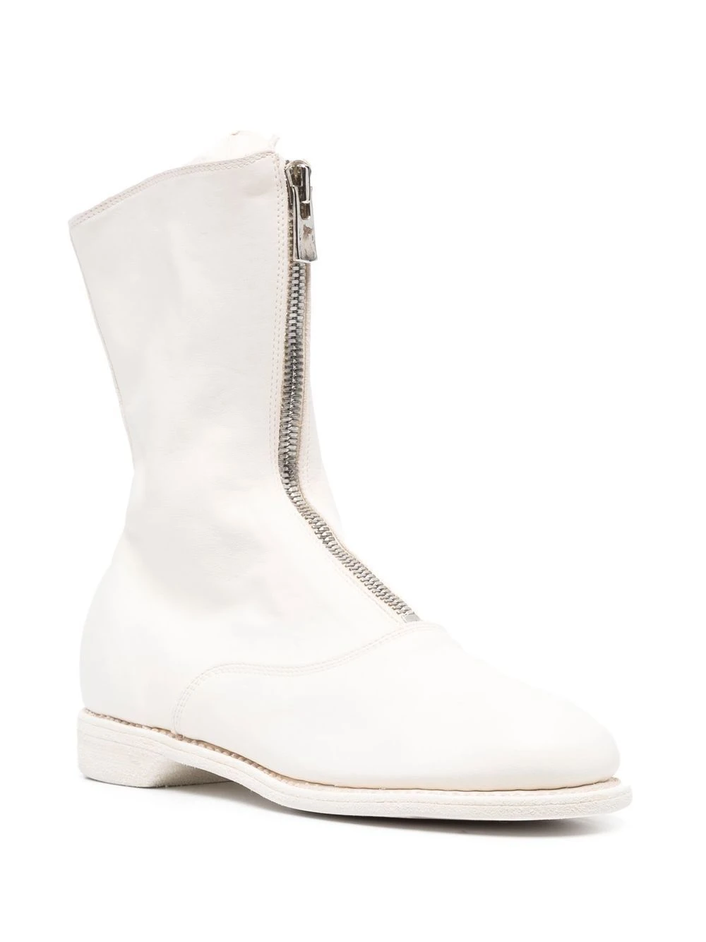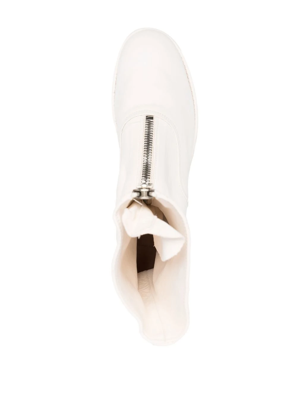 Blanc, cuir de veau, bout rond, languette oversize, fermeture zippée devant, semelle plate en cuir.