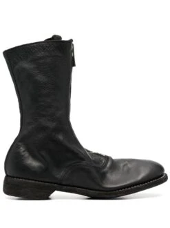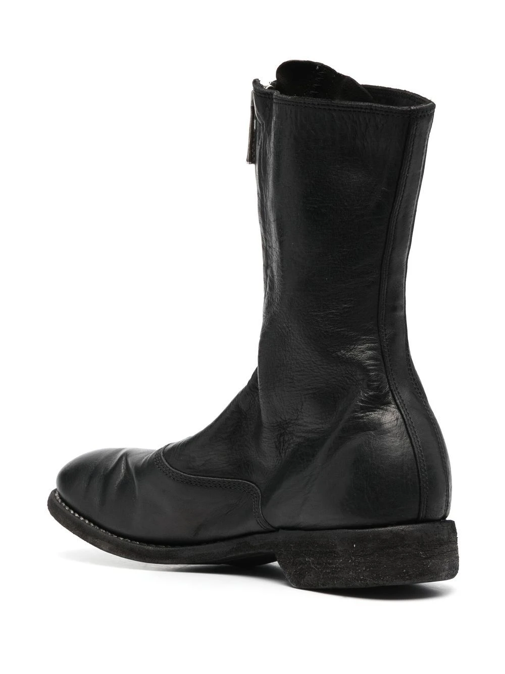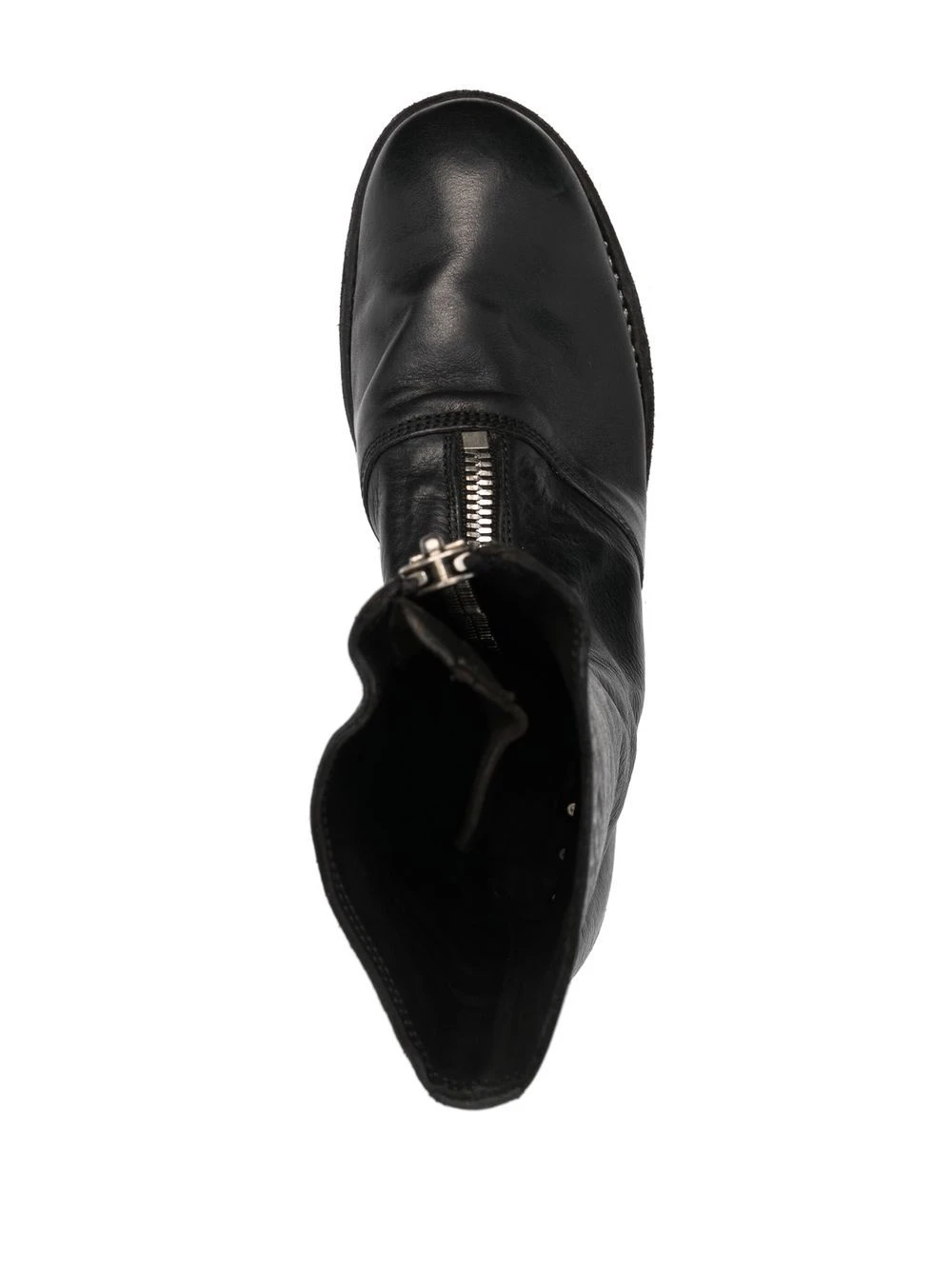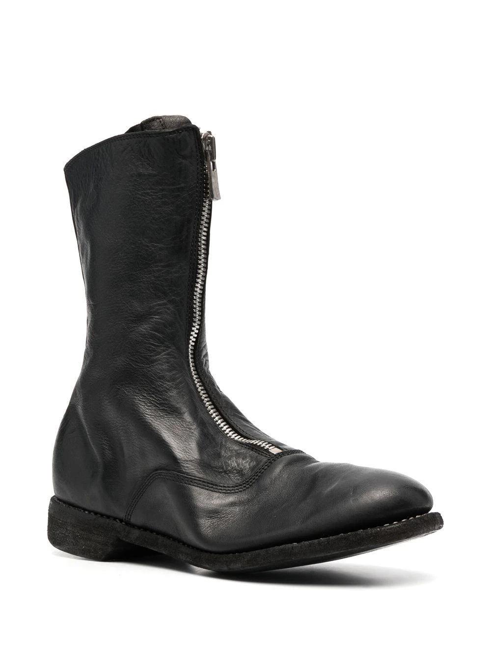 Noir, cuir de veau, coutures ton sur ton, fermeture zippée devant, bout rond, semelle plate en cuir.