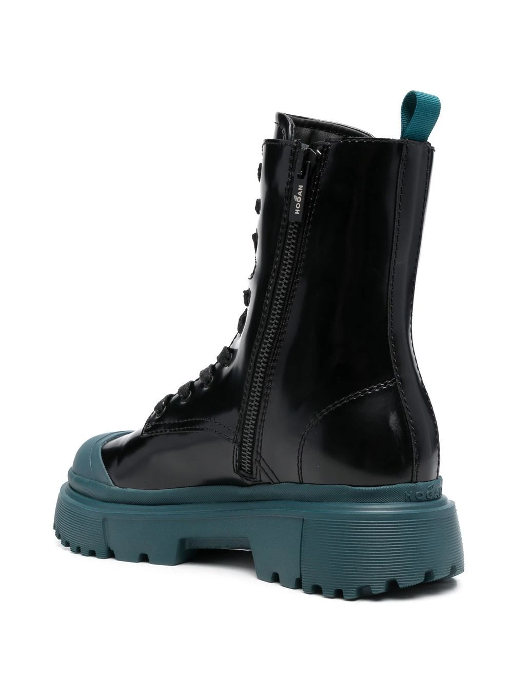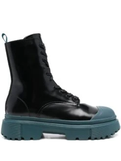 Noir, bleu, cuir de veau, fini brillant, fermeture à lacer sur le devant, fermeture zippée sur le côté, bout rond, languette d’enfilage au talon, bout contrastant, hauteur cheville, semelle intérieure à logo, semelle contrastante en caoutchouc.