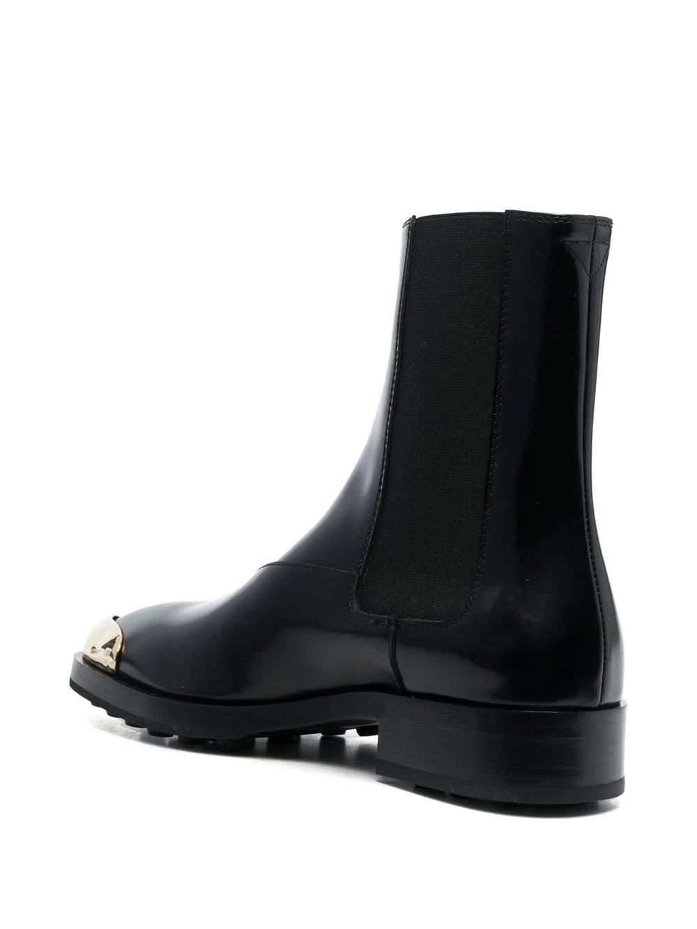 Noir de jais, doré, cuir de veau, effet métallisé, bout contrastant, bout rond, petit talon.